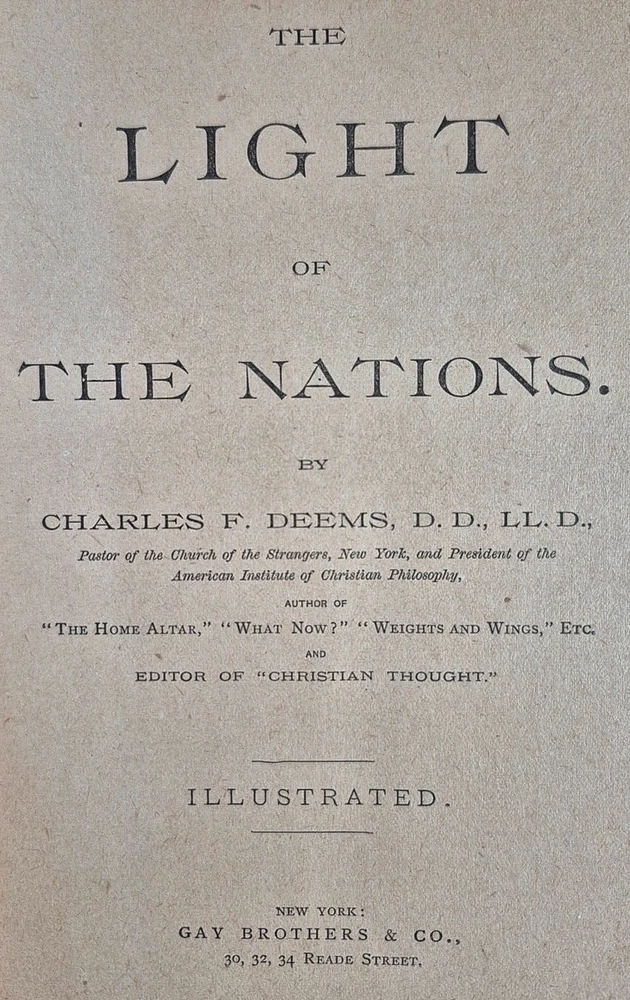 Charles (Alexander) Force Deems (December 4, 1820 – November 18, 1893) was an American Methodist minister. He was the pastor of the non-denominational Church of the Strangers in New York City from 1868 to 1893. After all that has been written for and against Jesus, there are millions who now believe that he is "The Light of the Nations." So important a historical figure deserves repeated examination, in the light of successive generations and of accumulating scientific skill and research We combine shipping on multiple book orders automatically unless instructed otherwise. If you are unable to "Request Invoice" , simply buy all books outright and we will refund shipping overage via Paypal once postage has been printed. We combine shipping via USPS Media Mail . Postage price is calculated by weight . Terminology that may be used in this description: Bookplate: Highly sought after by some collectors, a book plate is an inscribed or decorative device that identifies the owner, or former owner, of a book. Most often bookplates are affixed to the endpaper of a book. Bump: Indicates that the affected part of the book has been impacted in such a way so as to cause a flattening, indention, or light bending. Deckle Edge: Deckle edge is the feathered edge of a page. Traditionally and historically, this was a side effect of the process of making paper. Dust Jacket: Sometimes used as another term for dust jacket, a protective and often decorative wrapper, usually made of paper which wraps around the binding of a book Ex-library: A former library book, generally containing library acquisition and ownership stamped Markings, and other typical indications of the library's use. Foxing: Or, Foxed is the age related browning, or brown-yellowish spots, that can occur to book paper over time. When this aging process happens to the paper in a book it is referred to as "foxed". Remainder Mark: A remainder marked book is just that - a mark to the page edges of a book. This mark is placed on the page edges by a publisher as books are returned from bookstores or sold to discounters. Rubbing: Abrasion or wear to the surface. Usually used in reference to a book's boards or dust-jacket. Shelf Wear: (shelving wear) describes damage caused over time to a book by placing and removing a book from a shelf. Soiled: Generally, refers to minor discoloration or staining.