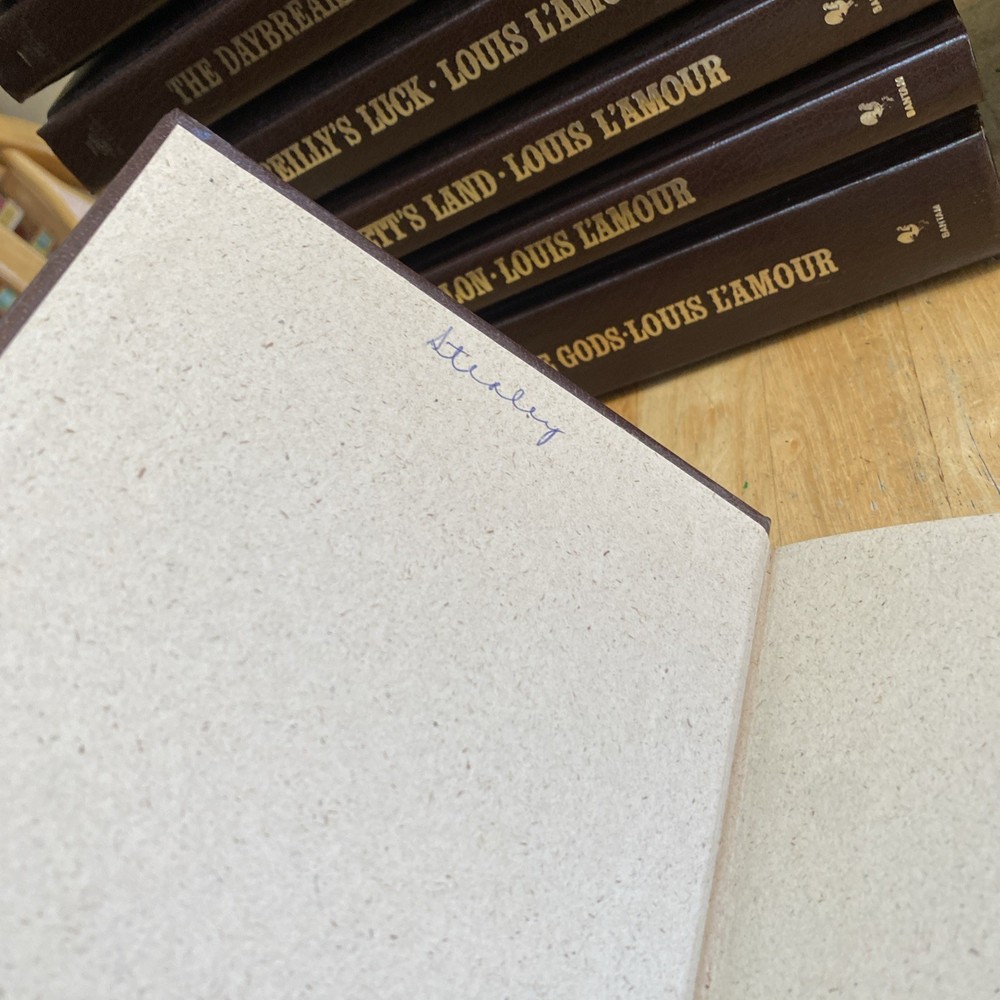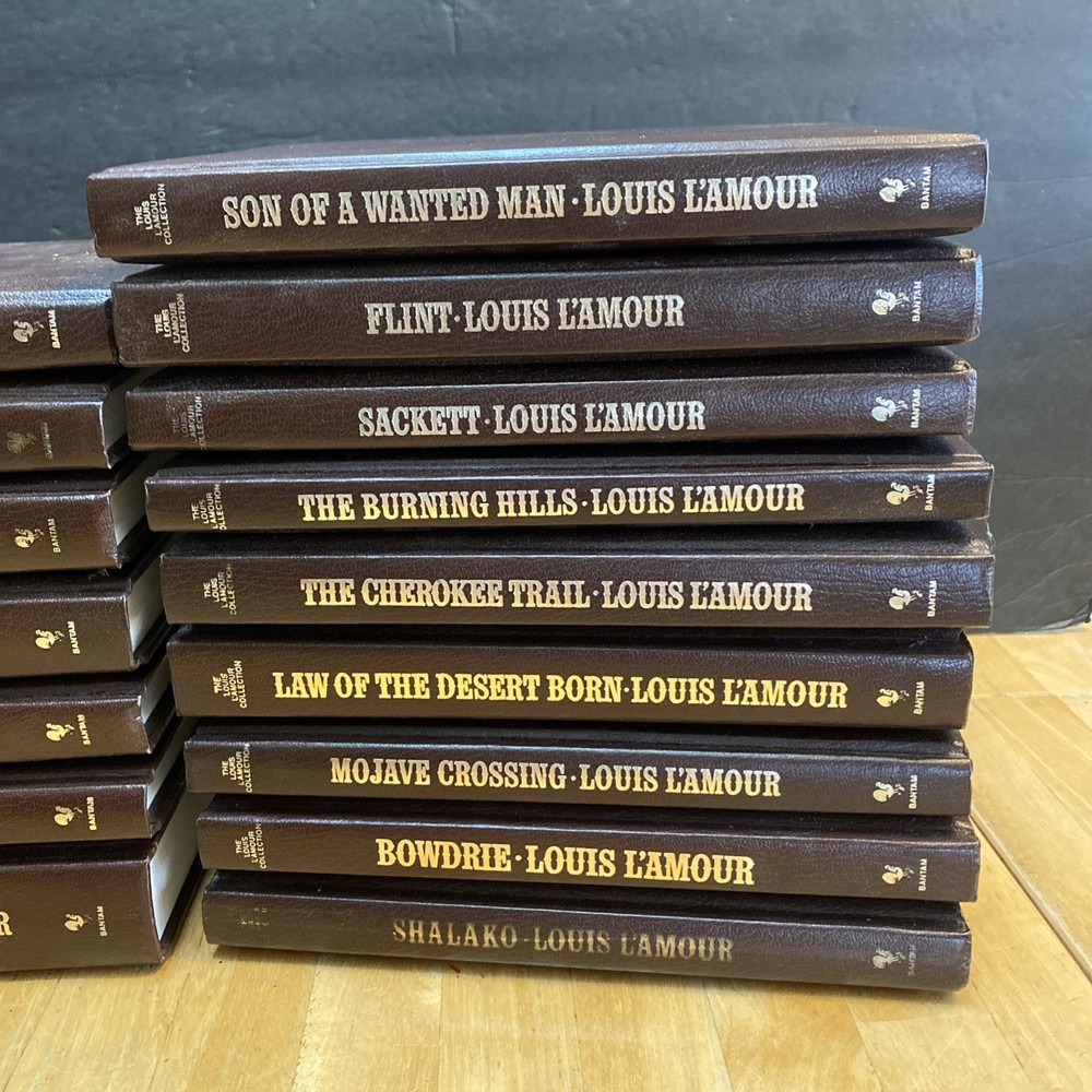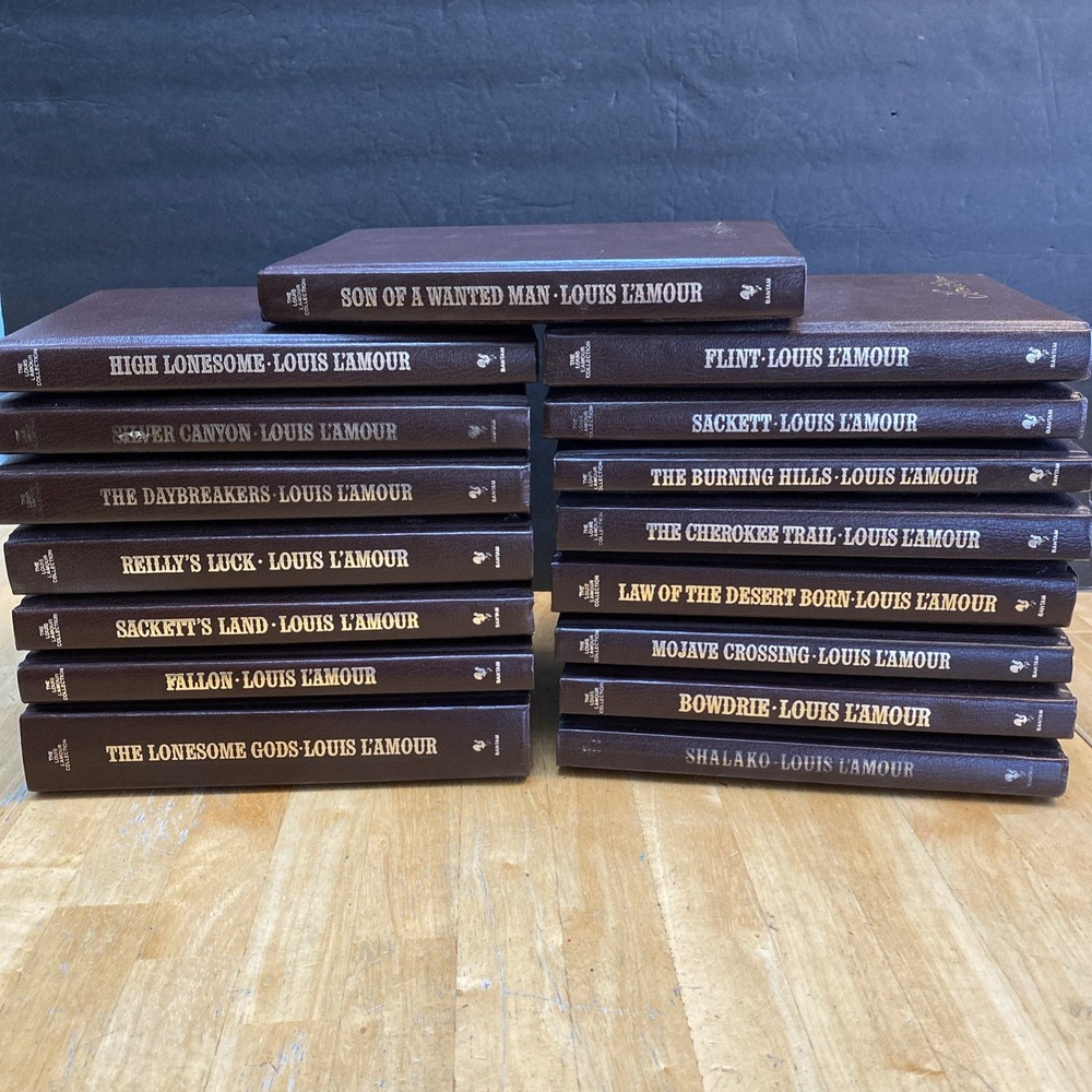 very good clean condition, last name written on front end paper in each of the books list of titles Son of a Wanted MAn Flint Sackett Law of the desert Born The Burning Hills The Cherokee Trail High Lonesome Mojave Crossing Bowdrie Shalako Silver Canyon The Daybreakers Reilly's Luck The Lonesome Gods Fallom Sackett's Land