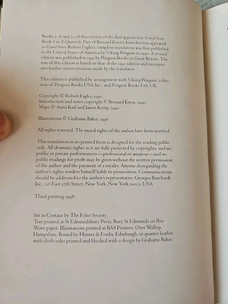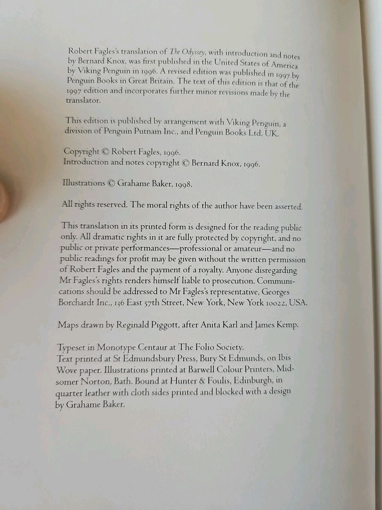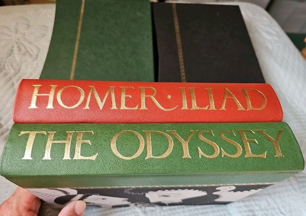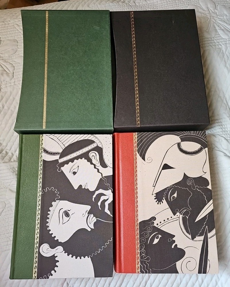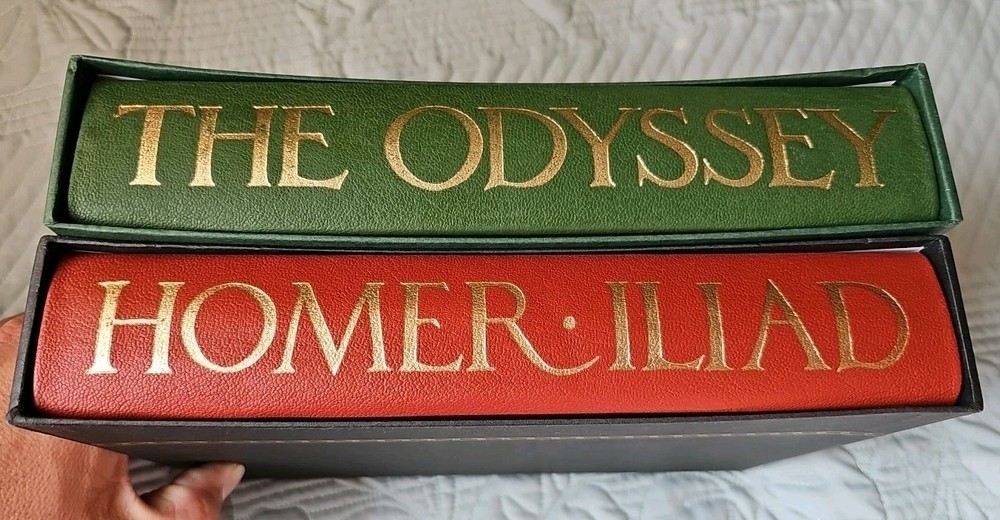 The Folio Society's 1998 Leather Greek Set of 2 books of "The Odyssey" by Homer is a luxurious and illustrated edition, perfect for any collector or individual interested in ancient Greek literature. The books come with slipcases and weigh 2kg, boasting high-quality leather bindings and intricate illustrations by Grahame Baker-Smith. This set is a special edition published in London, making it a unique and valuable addition to any bookshelf or collection focusing on poetry, theatre, and scripts. Books are in great condition and display well. See pics. Ships securely via USPS from Pennsylvania