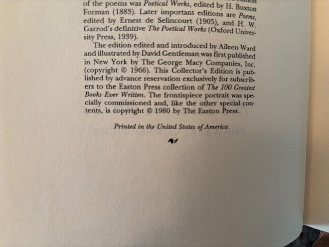 John Keats. The Poems of John Keats. Selected, edited and introduced by Aileen Ward. Norwalk, CT: The Easton Press, 1980. Illustrated by David Gentleman. Bound in full leather with gilt decoration and lettering. A.e.g. Silk ribbon bookmark. Former owner's bookplate present. Book is in better than very good condition.
