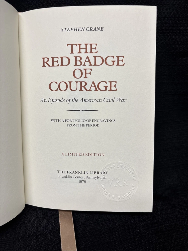 The Red Badge of Courage by Crane Franklin Library Limited Edition 1979 Leather * From the limited edition collection, The 100 Greatest Books of All Time. Beautiful illustrations! Includes "Notes from the Editors" booklet The embossed stamp of the original owner is on the title page. See photos for details. *Other titles from this collection are listed in my ebay store. I will offer a combined shipping discount on the purchase of 2 or more books.