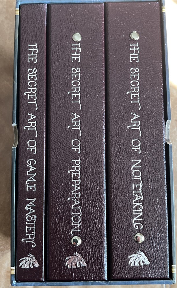 From the DM Lair website…. Special Edition Leather Covers These are the special edition collection with beautiful leather covers. This is the only print run that will ever be made for the special edition collection; once they're gone, they're gone forever! Get All Three Books to Master Your Game The Secret Art of Game Mastery. Contains over 100 years of GM advice distilled into an easy-to-read format. It introduces and explains the tools of the trade, scheduling, playstyle, post-game notes, getting player feedback, and more. The Secret Art of Preparation. Brings to your fingertips the actual templates and guides that the DM Lair team uses to prepare games, Lair Magazine, and more. Designed as a three-ring binder, it's intended for you to write directly into for your entire campaign! The Secret Art of Notetaking. Gives you the keys to tracking your campaign from session to session just like the DM Lair team. Designed as a three-ring binder, it's intended for you to write in and keep track of your whole campaign!
