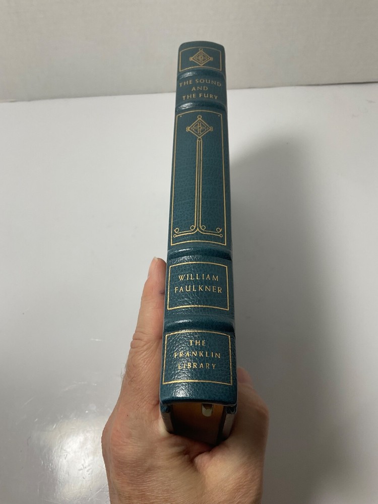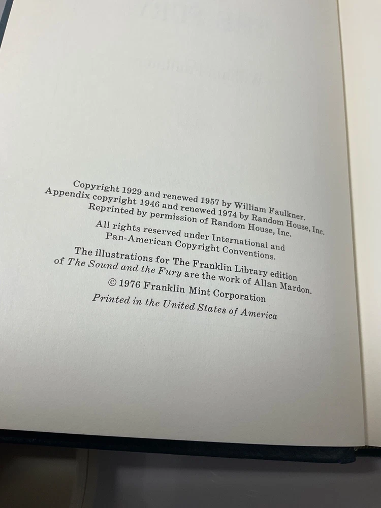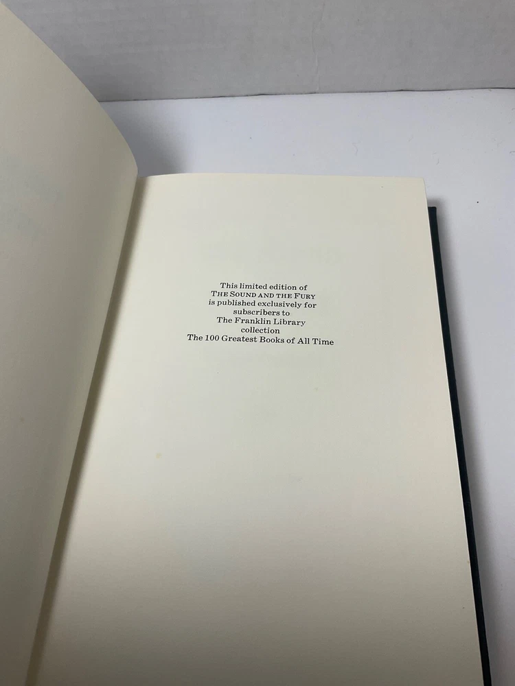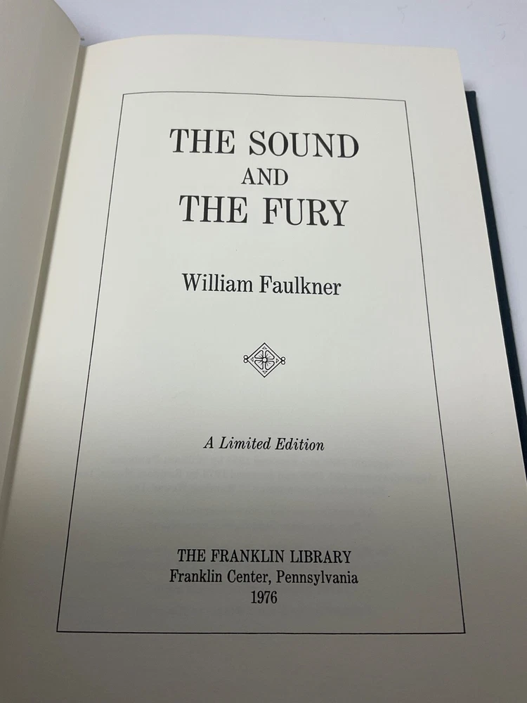 The product is "The Sound and The Fury" by William Faulkner, part of "The 100 Greatest Books of All Time" series published by The Franklin Library in 1976. This limited edition novel is bound in leather and features notes from the editors. Written in English, it falls under genres like Classics, Literary, and World literature. With a focus on family life, Mississippi fiction, and siblings in the South, this collectible piece spans 343 pages and is a must-have for adult readers interested in American literature.