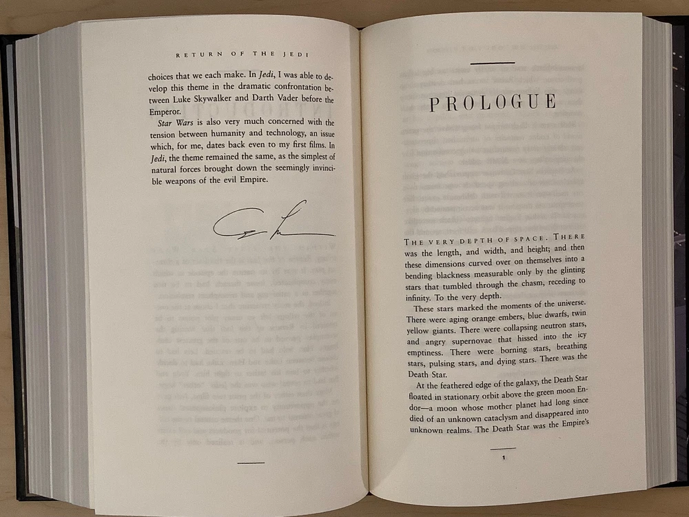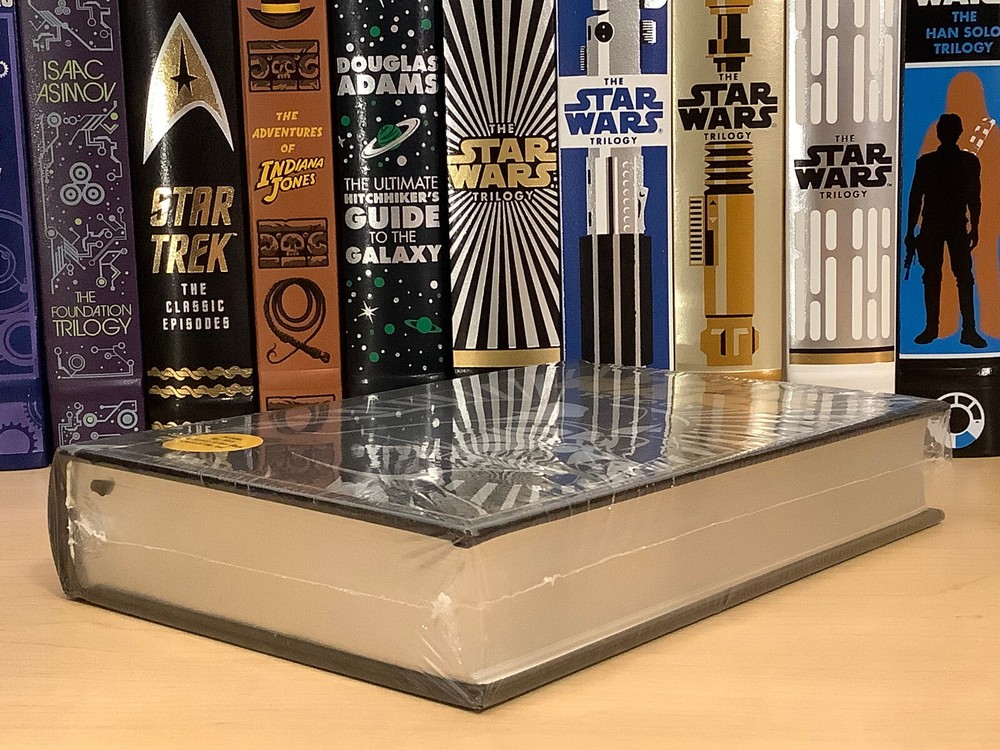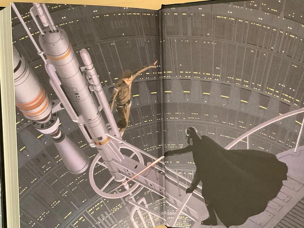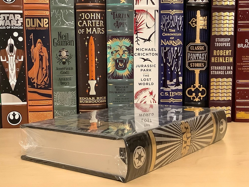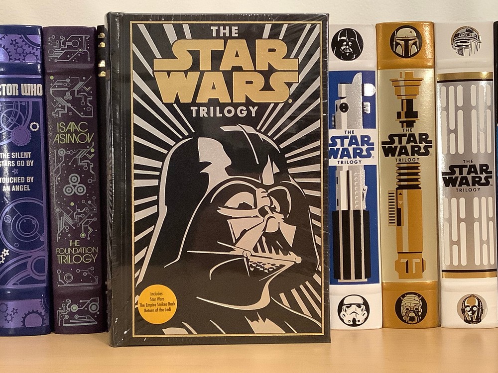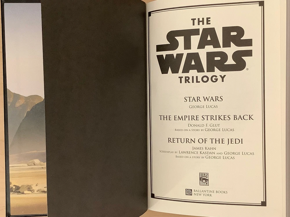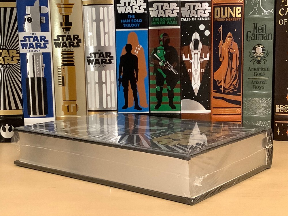 The Star Wars Trilogy – Darth Vader cover bound in leather, with silver edged pages and a ribbon marker contents Star Wars – A New Hope The Empire Strikes Back Return of the Jedi Item Condition: This is a leatherbound hardcover, sealed. The seal is beginning to open, and there are some flaws /dings to the silver page edging. Dimensions are approx: 9.25" x 6.25" x 1.55" This book will ship in a box, with bubble wrap. Photos 1-7 are of the actual book that will be shipped, the rest are examples of the book from an open copy.