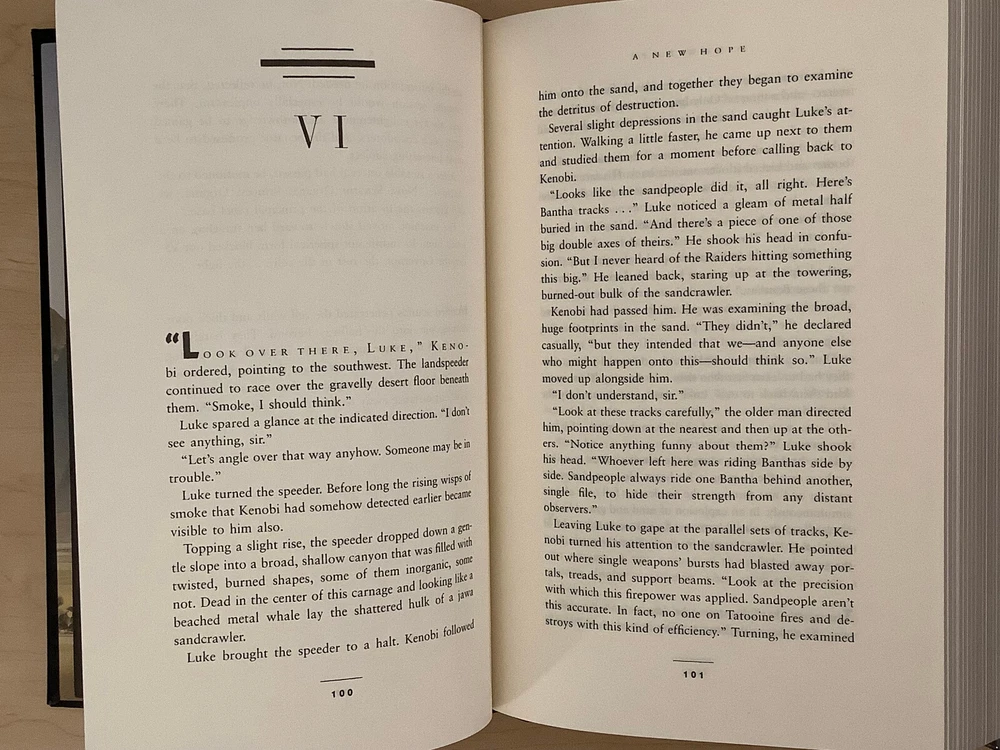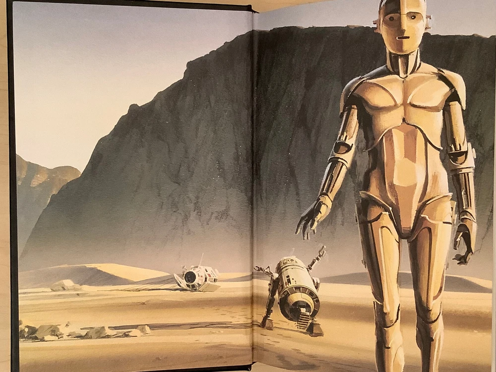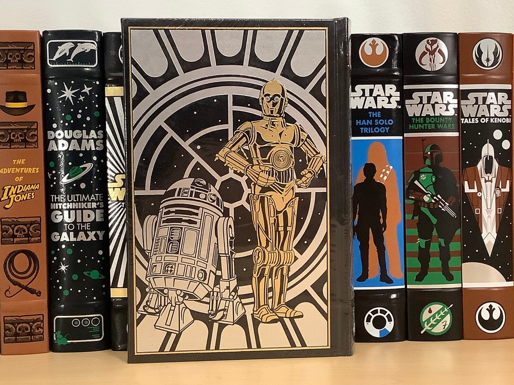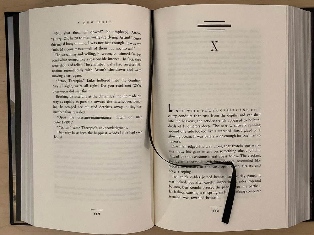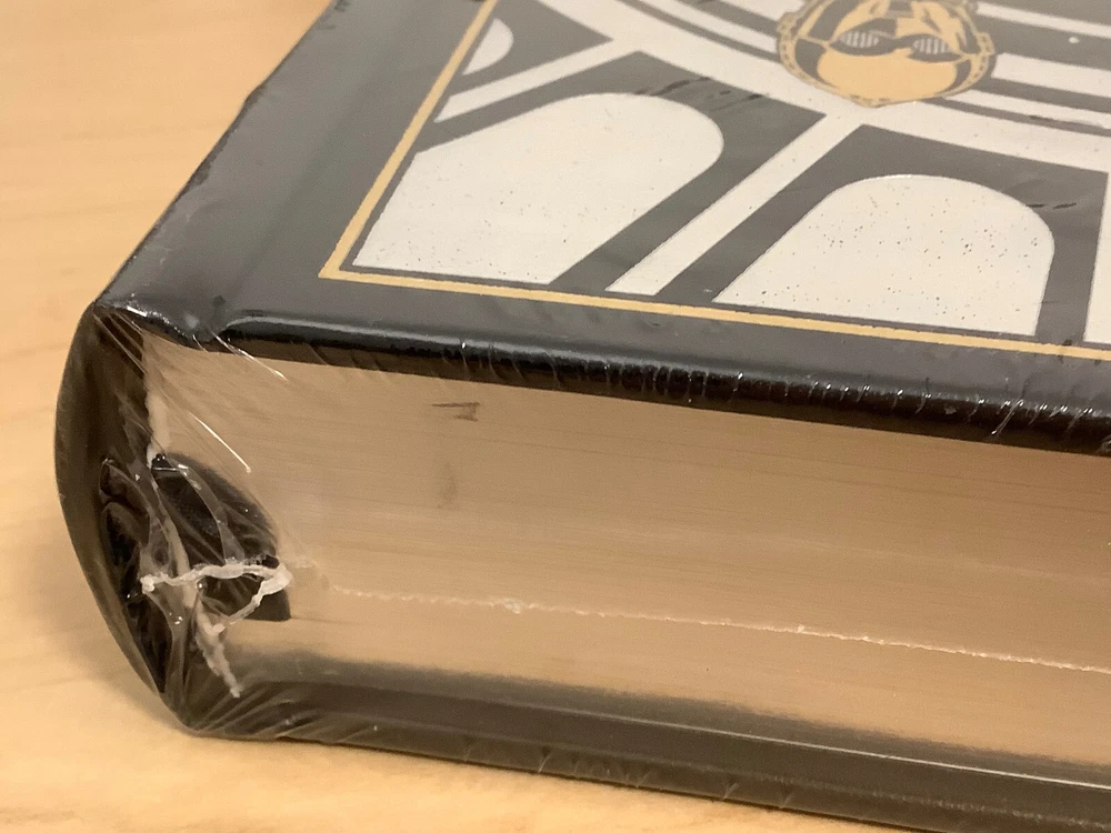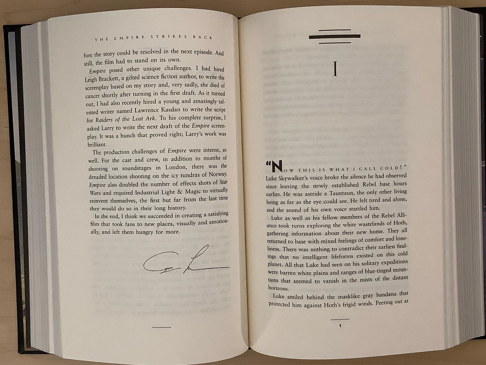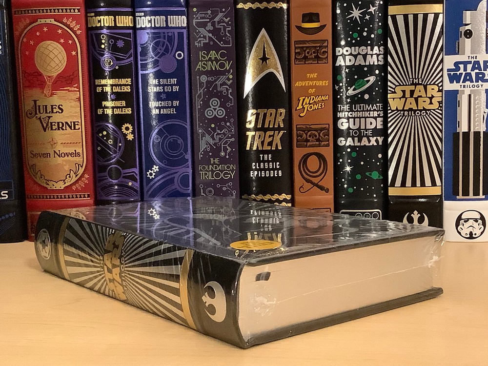 The Star Wars Trilogy – Darth Vader cover bound in leather, with silver edged pages and a ribbon marker contents Star Wars – A New Hope The Empire Strikes Back Return of the Jedi Item Condition: This is a leatherbound hardcover, sealed. The seal is beginning to open, and there are some flaws /dings to the silver page edging. Dimensions are approx: 9.25" x 6.25" x 1.55" This book will ship in a box, with bubble wrap. Photos 1-7 are of the actual book that will be shipped, the rest are examples of the book from an open copy.