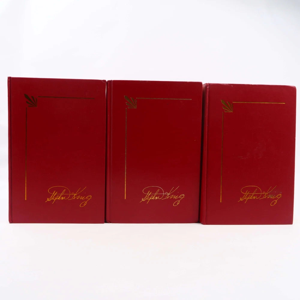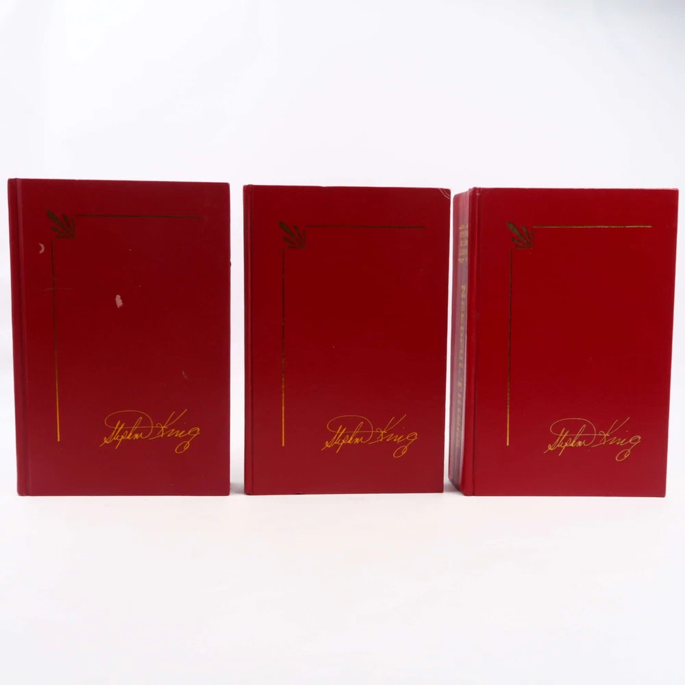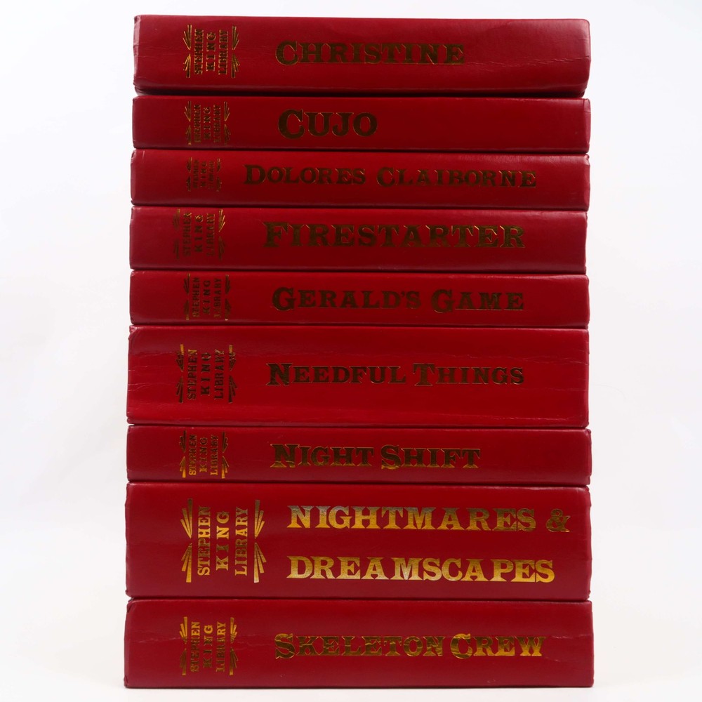 presents ... The Stephen King Library - Red Leather-Bound Vintage Horror HC, 9 Book Lot Author: King, Stephen Publisher: The Viking Press Release Date: Seller Category: vinhor Qty Available: 1 Condition: Used: Acceptable Sku: 121824014 Notes: This listing is for nine Stephen King Library editions. The pictures included are of the actual books for sale and can be viewed for assessing condition. Needful Things' first signature has separated from the spine; Cujo and Christine have liquid staining/rippling. All purchases are shipped or made available for local pickup within one business day of payment. All Photos are of the actual book(s) up for sale. Please message about any problems with your order or other concerns, including requests for additional photos or clarification on any condition notes. Ask about combined shipping before checkout. Thank you for your interest.