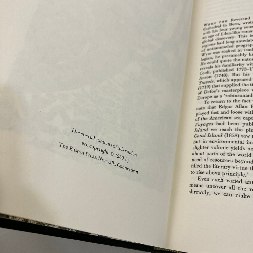 The Swiss Family Robinson by Johann Wyss Easton Press Famous Editions 1963 HC This is a used book with general edge and shelf wear, some fading to the covers and spotting on gilded page edges. Binding is intact, no writing, stains, or unusual smells. See pictures for overview of condition. We are BrightLight Books. We have sold tens of thousands of items online since 1998. Money Back Guaranteed! For Local Pickup in our Fern Park, FL store, please message us! 40-3-1 (5010606) 11/14/2024 AH