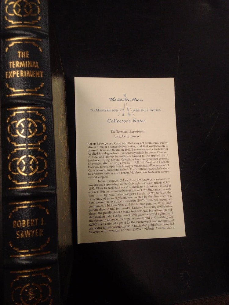 Exploration of fundamental questions surrounding life, death, and the nature of consciousness. Exploring the Existence of the Soul: The novel introduces the concept of a "soulwave," a detectable energy field leaving the body at the moment of death, which the protagonist interprets as scientific proof of a human soul. This groundbreaking (within the novel) discovery ignites intense debate and brings the story to the forefront of the intersection of science and spirituality. Investigating Life and Immortality through AI: To further explore his theories on the soul and the afterlife, the protagonist creates three AI simulations of his own personality. These simulations, each designed to represent a different aspect of existence (life after death, immortality, and a control), allow Sawyer to delve into the potential implications of artificial intelligence and its ability to replicate or extend human consciousness. A Murder Mystery with Philosophical Depth: While having a murder mystery subplot, the novel uses this framework to examine the nature of morality and ethical philosophy. The emergence of a killer AI among the simulations forces the characters to question whether morality is innate or influenced by environmental factors. Thought-Provoking Exploration of AI and Consciousness: The book is praised for its ability to raise interesting scenarios regarding artificial intelligence, morality, and theological implications, making it a thought-provoking read that keeps readers engaged and considering the possibilities of the future of AI and human consciousness. Award-Winning Recognition: "The Terminal Experiment" won the Nebula Award for Best Novel in 1995, solidifying its place as a significant work of science fiction. This award demonstrates its impact and critical acclaim within the genre. Easton Press specializes in producing high-quality, collectible editions of books. They use premium materials like genuine leather for the bindings, which adds a luxurious feel and ensures durability. Aesthetic Features: Their books feature attractive design elements such as: 22-karat gold embossing:Accents and lettering on the cover and spine are done with 22-karat gold. Gilded page edges:The page ends are gilded with gold for both beauty and protection. Hubbed spines: Traditional raised rings on the spine give the books a classic, antique look. Silk moir endpapers:These add a touch of sophistication. Satin ribbon page marker:A convenient and attractive addition. Durability and Quality: Easton Press books are printed on acid-neutral paper that is thread-sewn, ensuring the books are durable and can last for generations. Collectibility: Many Easton Press books are part of limited editions or signed series, making them highly sought after by collectors. These factors can contribute to their market va
