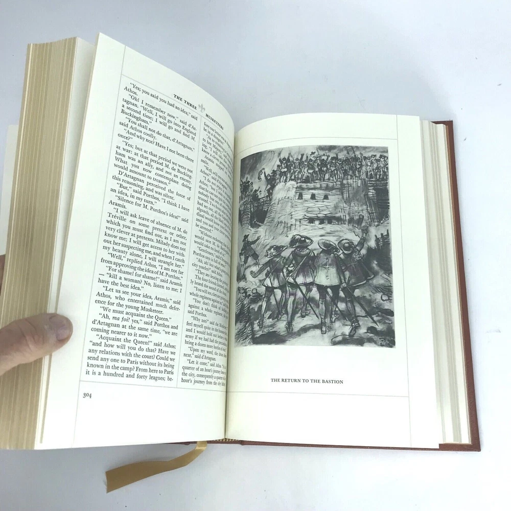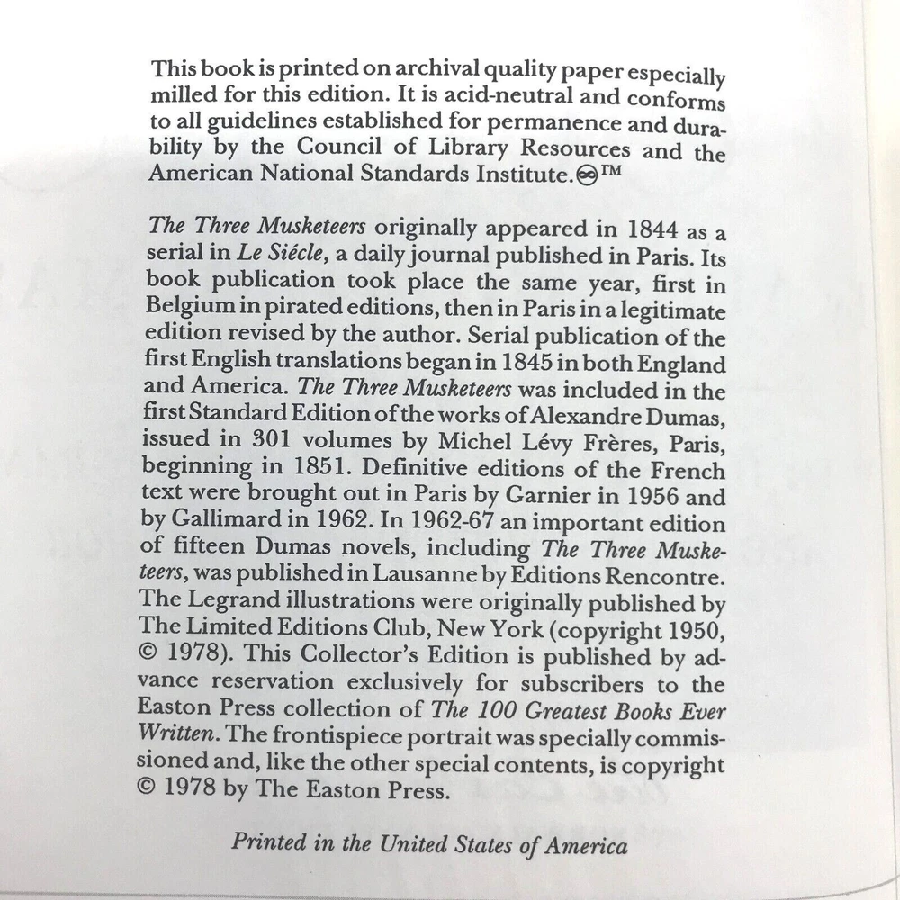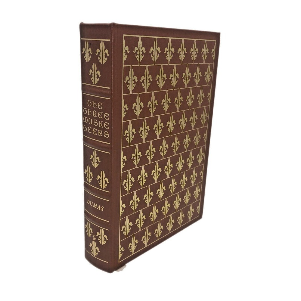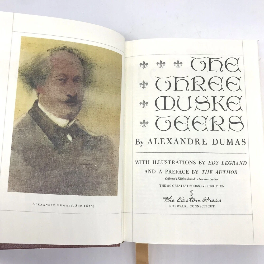 The Three Musketeers: Alexandre Dumas. Easton Press. Leather. Collector Ed. 1978 Comes in manufacturer's original shipping container Deep dive into Alexandre Dumas' swashbuckling historical adventure tale of honour and chivalry, set during the backdrop of the French monarchy’s slow demise, The Three Musketeers. Kickstarting the epic trilogy, ´The Three Musketeers´ follows D’Artagnan's desperate attempt to leave home and join the elite Musketeers of the Guard in Paris. When he befriends three other formidable musketeers his age, the group soon take it upon themselves to save the state and control the courts! But when rogue do-gooders step on the toes of France’s Ancien Régime, there’s bound to be trouble. And violence. Will it be off with the heads? Or will the musketeers show France what a true republic looks like? Weaving a whirlwind adventure tale of courage and might, Dumas’ The Three Musketeers is a must-read masterpiece for fans of Luke Evans, Orlando Bloom, and Logan Lerman in the eponymous blockbuster hit film adaptation. Alexandre Dumas (1802- 1879) was a widely celebrated French author, member of the Académie Française, and recipient of the Legion of Honour. Celebrated for his rip-roaring adventure novel ‘The Three Musketeers’, his literary output includes ‘The Count of Monte Cristo', 'Twenty Years After' and 'The Vicomte of Bragelonne: Ten Years Later'. Gilt page edges Raised Bands Accented in 22kt gold Full Leather-bound Satin Bookmark Ribbon still in original position Silk Moiré End sheets Collectors edition