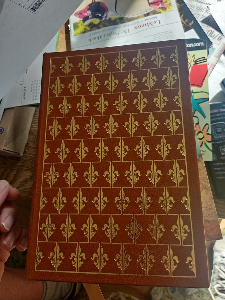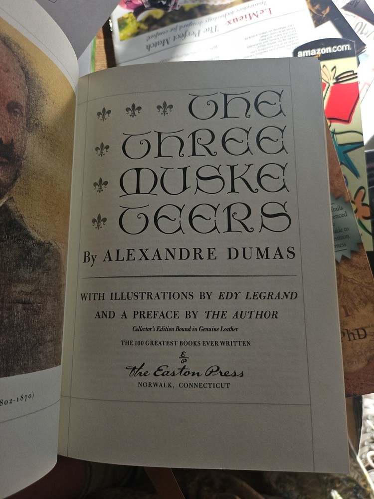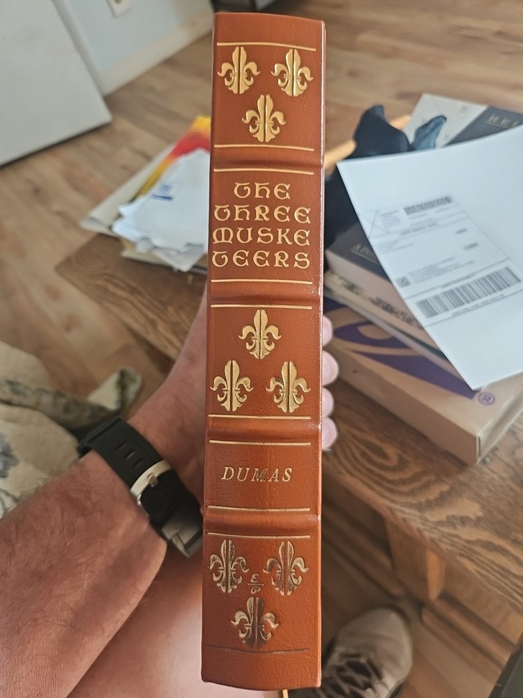 This is a leather-bound collector's edition of "The Three Musketeers" by Dumas, published by The Easton Press in 1978. The book is a classic work of action and adventure, set in the 17th century France. It features four musketeer friends who defend the king and fight against political plots and duels. The book is written in English and belongs to the genre of antiquarian and classic literature.