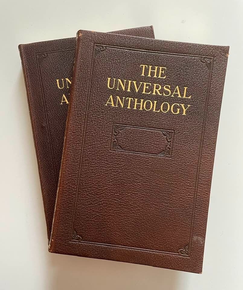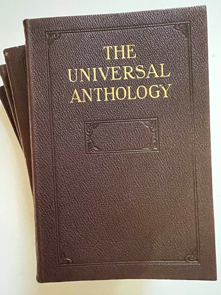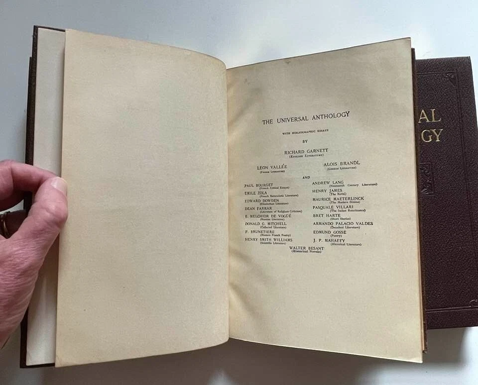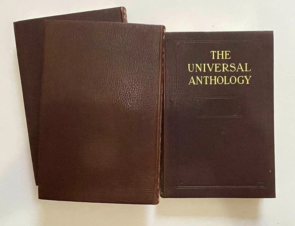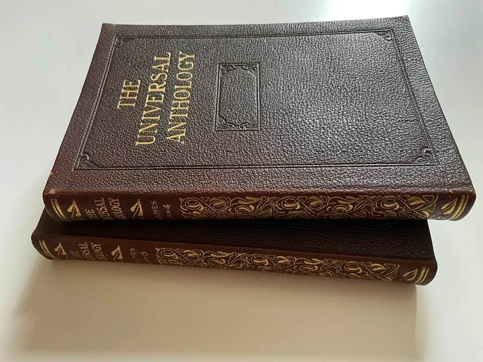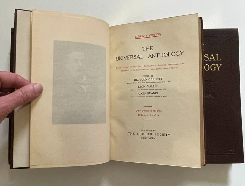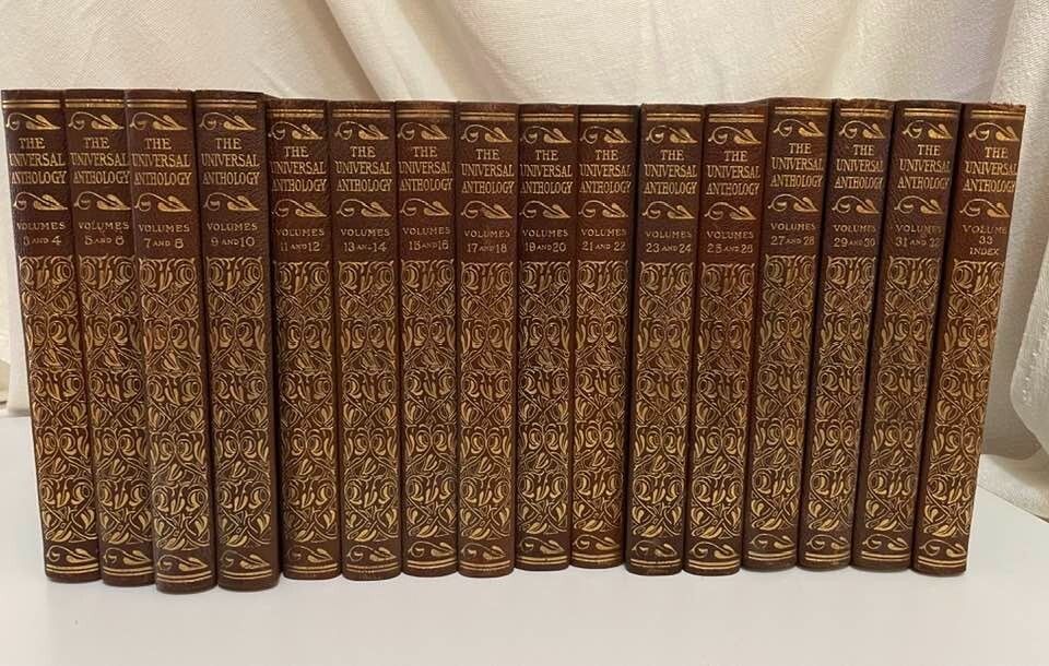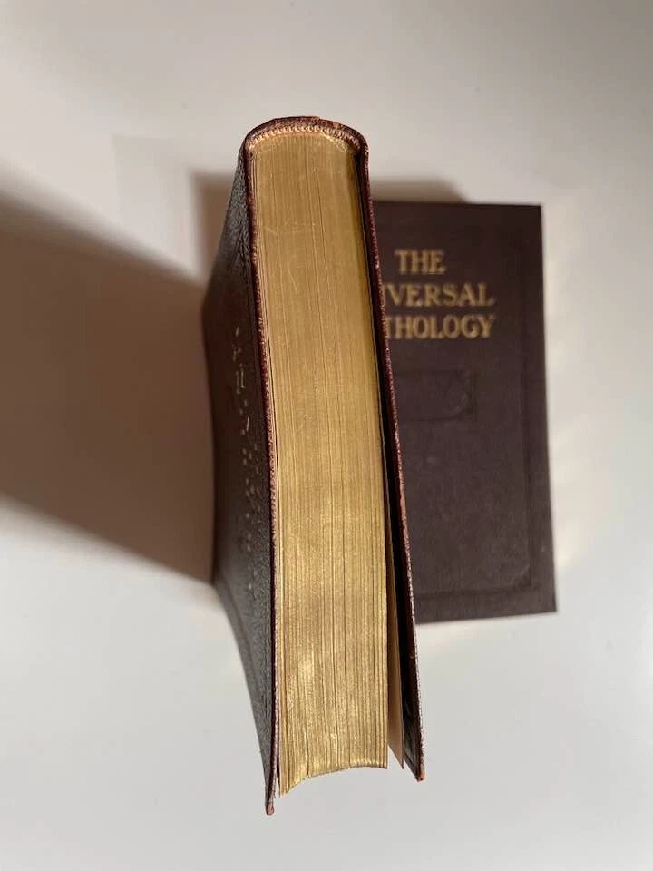 Exceptionally beautiful set of The Universal Anthology, edited by Richard Garnett, originally published in 1899. This set was published by the Grolier Society*, no definite print date or edition is given. This set consists of 16 volumes, all in generally excellent condition for their age, with each volume containing two of the 33 original volumes plus index. The first volume is missing; otherwise, the set is complete. This is truly a gorgeous set, and shows beautifully - should you never read them, they'll still give add elegance, gravitas, and ambiance to your life. The full set requires about 17" of shelf space, with each volume measuring approx. 6" X 9" X 1" Volumes are bound in thin soft deep brown leather; gilded and embossed designs on spines and front covers; sewn binding; pages are gilt on top, fore, and bottom edges. Very light tanning of pages throughout, pages are otherwise unmarked; bindings are tight and square, with no cracking at hinges; minor wear and bumping to covers with some flaking of leather. Full plate illustrations with tissue overlays; impressively decorated endpages. Please see photos - I'll be happy to answer any questions you might have. *T he Grolier Society specialized in publishing extra-fine editions of classics and rare literature. The Society was named after the Grolier Club , which had been founded in 1884 to advance the arts involved in making books and which was itself named after a well-known French bibliophile , Jean Grolier de Servières .
