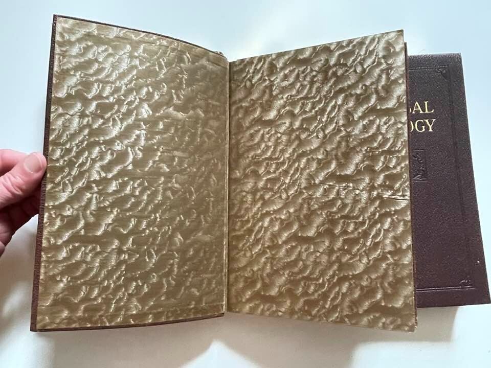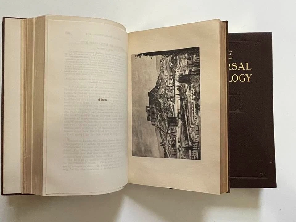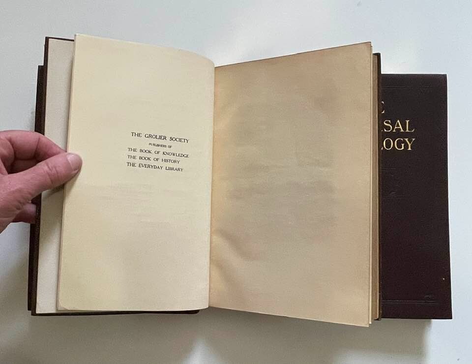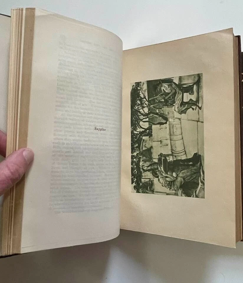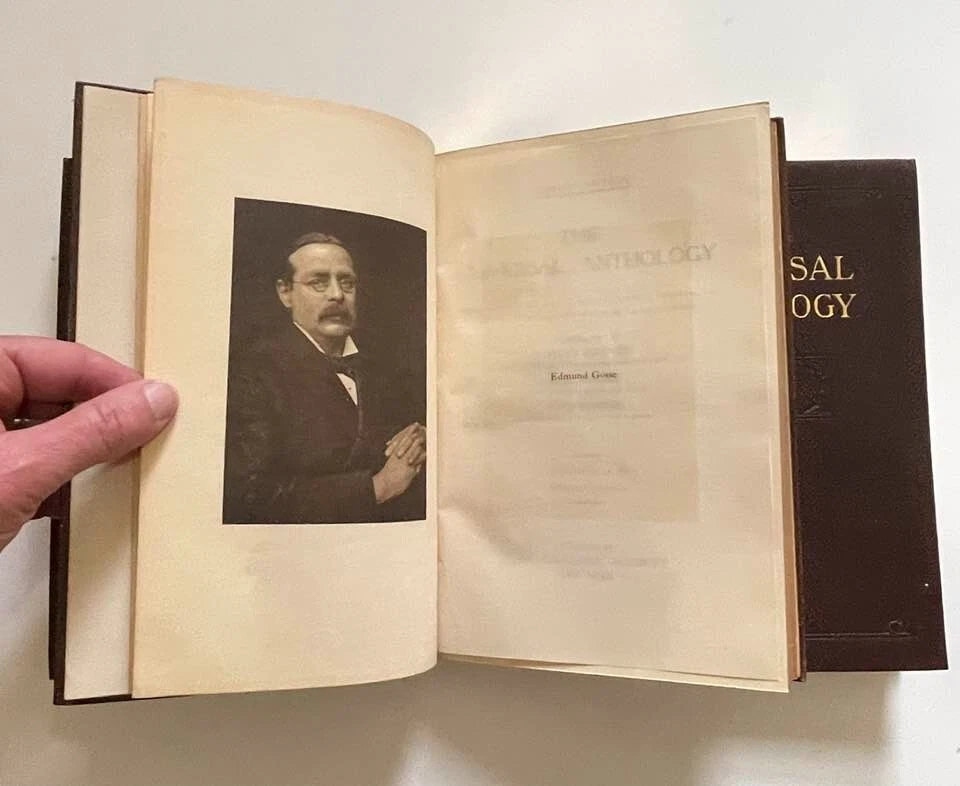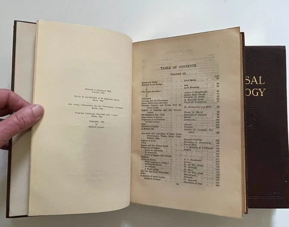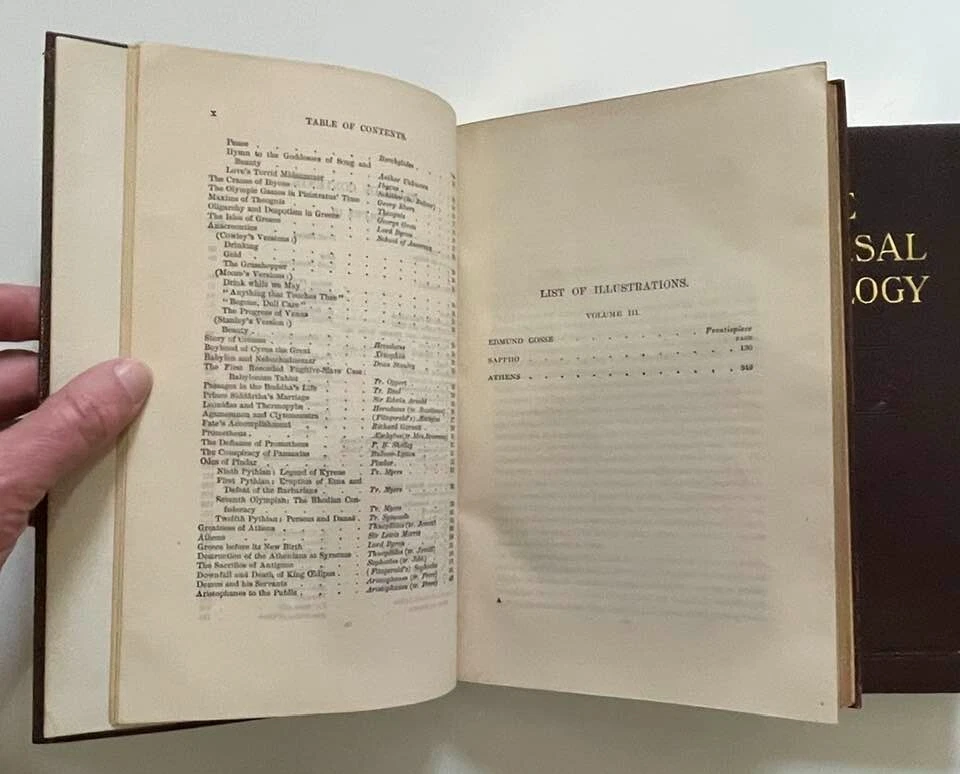 Exceptionally beautiful set of The Universal Anthology, edited by Richard Garnett, originally published in 1899. This set was published by the Grolier Society*, no definite print date or edition is given. This set consists of 16 volumes, all in generally excellent condition for their age, with each volume containing two of the 33 original volumes plus index. The first volume is missing; otherwise, the set is complete. This is truly a gorgeous set, and shows beautifully - should you never read them, they'll still give add elegance, gravitas, and ambiance to your life. The full set requires about 17" of shelf space, with each volume measuring approx. 6" X 9" X 1" Volumes are bound in thin soft deep brown leather; gilded and embossed designs on spines and front covers; sewn binding; pages are gilt on top, fore, and bottom edges. Very light tanning of pages throughout, pages are otherwise unmarked; bindings are tight and square, with no cracking at hinges; minor wear and bumping to covers with some flaking of leather. Full plate illustrations with tissue overlays; impressively decorated endpages. Please see photos - I'll be happy to answer any questions you might have. *T he Grolier Society specialized in publishing extra-fine editions of classics and rare literature. The Society was named after the Grolier Club , which had been founded in 1884 to advance the arts involved in making books and which was itself named after a well-known French bibliophile , Jean Grolier de Servières .