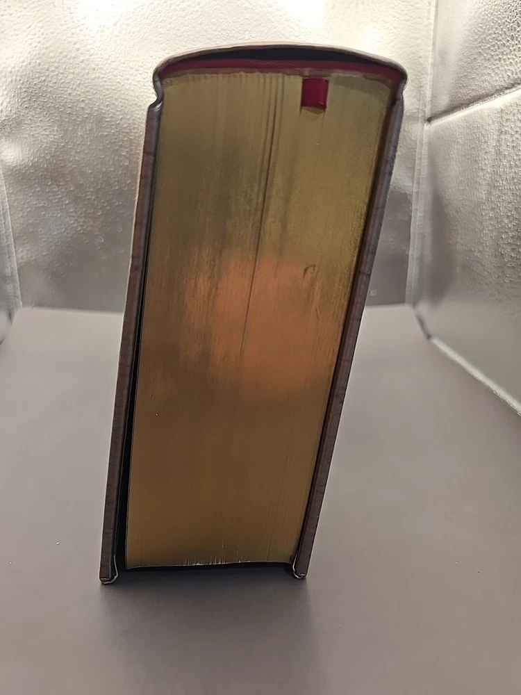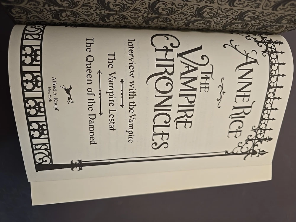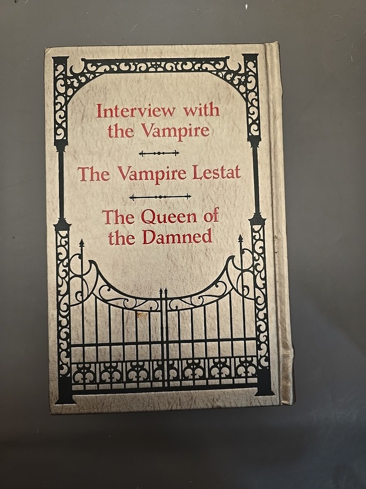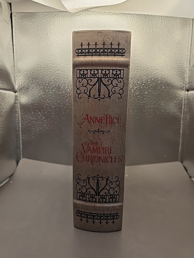 There is minor damage to inside front binding. But it is not affecting the integrity of the book. Book is otherwise in excellent condition The product is "The Vampire Chronicles" by Anne Rice, a collector's edition novel from the Vampire series. This hardcover book is a leatherbound collectible edition published by Alfred A. Knopf in 1988. It is written in English and features 448 pages of vampire-themed fiction. The book measures 6 inches in length, 9.5 inches in height, and 2.5 inches in width, weighing 72 ounces. This edition is not personalized or signed, making it a sought-after item for adult fans of horror literature. Book is shipped media mail.
