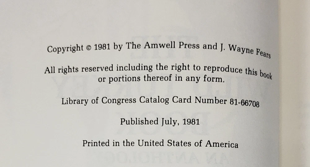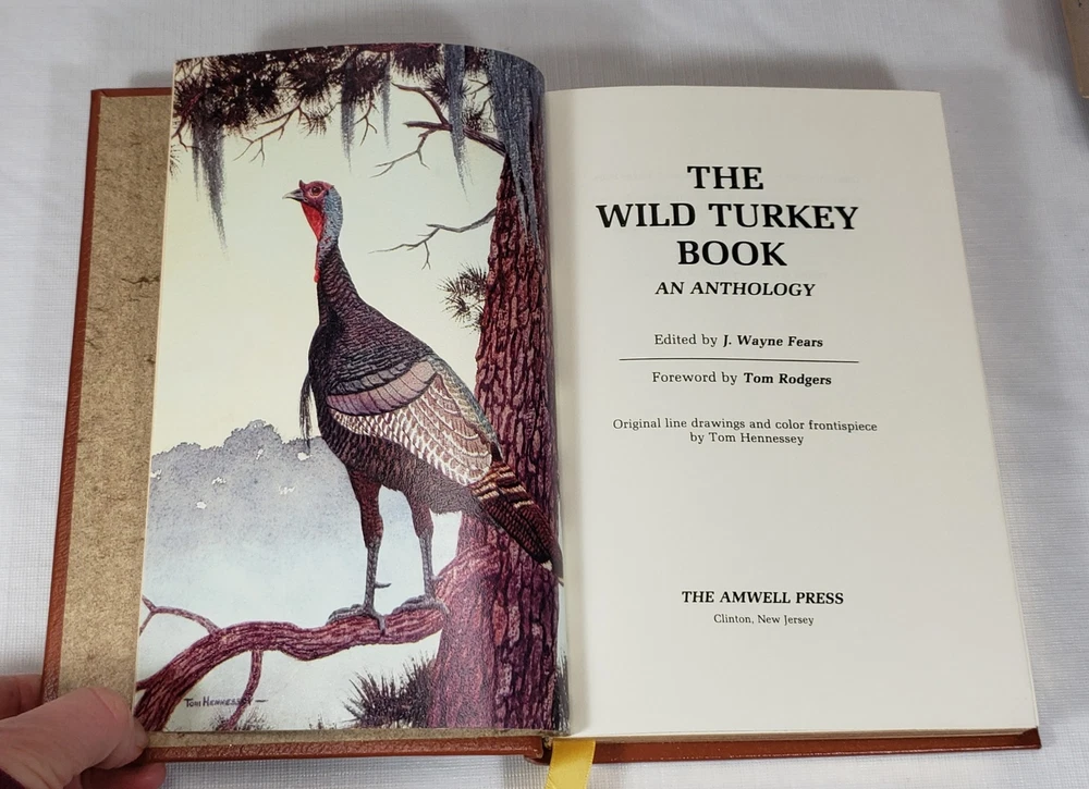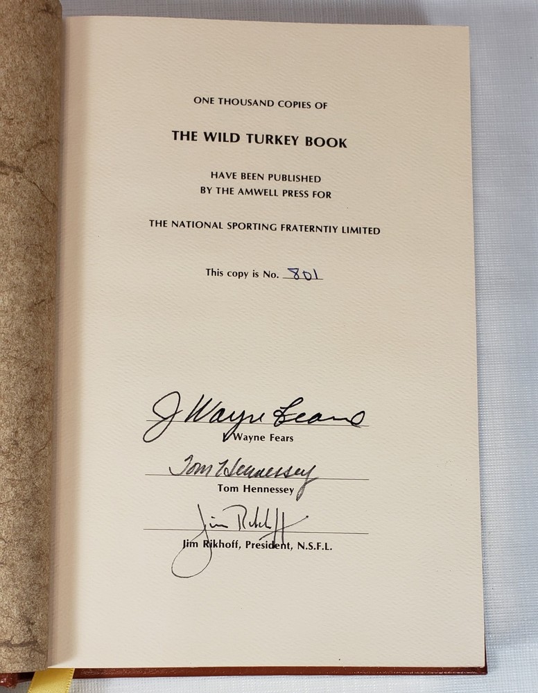 The Wild Turkey Book An Anthology, Amwell Press, Signed Ltd Ed, Slipcase, 1st Ed, 1981 Signed by J. Wayne Fears, Tom Hennessey & Jim Rikhoff. Numbered copy 801 of 1,000. Leather with gilt page edges and built in bookmark. Great used condition. Use the enlarge & zoom features to see details PAYMENT& SHIPPING INFO: Multiple purchases--Please place items in cart and then request a combined shipping invoice BEFORE paying in order to get a discount on shipping. Listing and template services provided by inkFrog