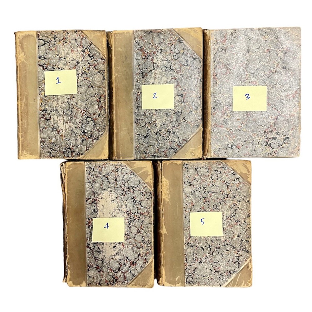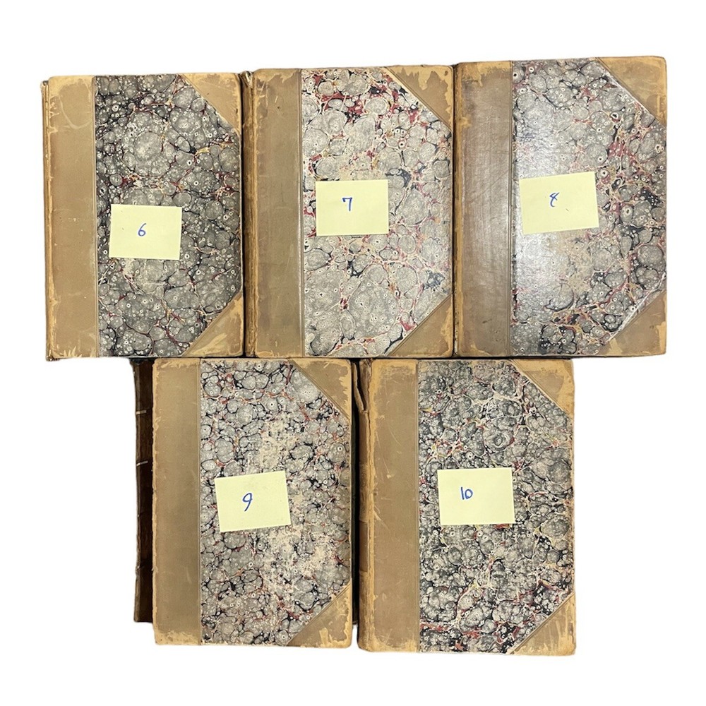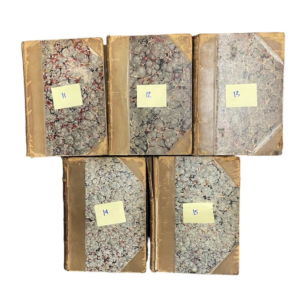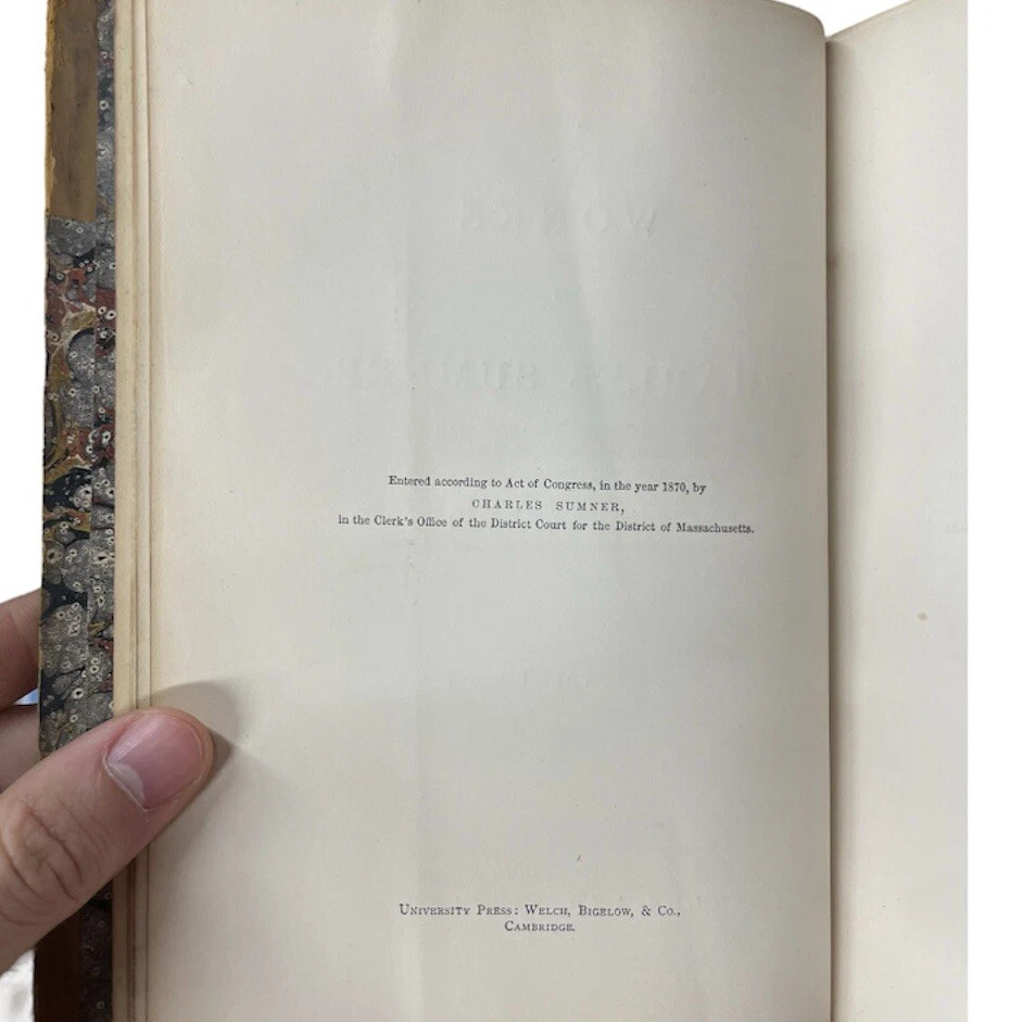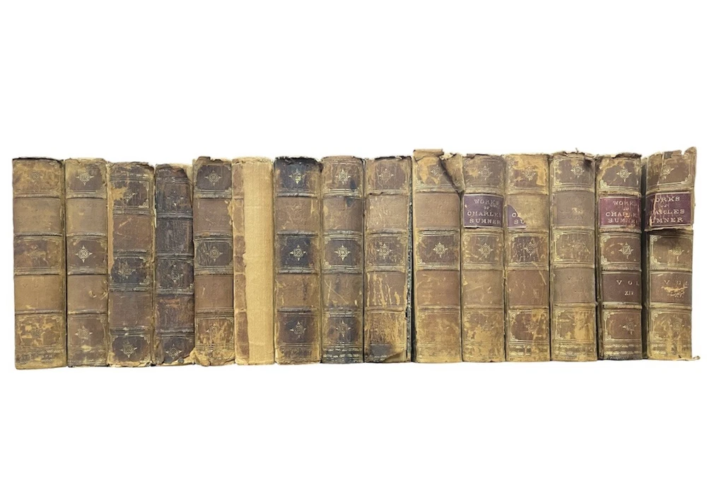 Fifteen volumes. Volume 1 is SIGNED by author Charles Sumner. Antique RARE complete set. 3/4 leather, tan leather (grey-brown), with marbled paper boards, all edges marbled matching, also endpapers; 4 raised bands, morocco title patch, gilt tooling on spine; gophered page edges. Hardcover books are pre-owned and in in decent condition for their age. Pages are intact and clean. Some books have detached or missing covers/back covers. See photos for further conditioning; books pictured on listing are the exact copies you will receive. Books will be individually wrapped and carefully packaged. Book 1 is in great condition. Book 2 is in great condition. Book 3 is missing both a front and back cover. Book 4's front and back covers are detached but included. Book 5 is missing a back cover, and the front cover's binding is weak. Book 6 is missing a back cover. Part of the spine is missing and the front cover is detached but included. Book 7 is missing a back cover. Book 8 is in great condition. Book 9's front cover is detached but included. The spine paper is attached but hanging off. Book 10 is in great overall condition. Some wear on spine. Book 11 is in great overall condition. Book 12 is in great overall condition. Book 13 is in great overall condition. Book 14 is in great overall condition. Book 15 is in intact, but the paper on the spine is hanging off the back cover. (34 pounds) For seller's use only: located on CYCLOPS 70