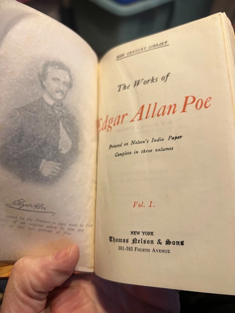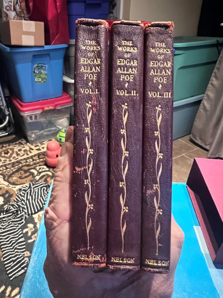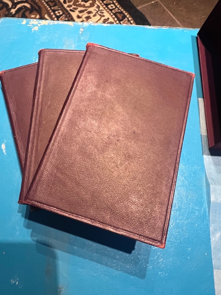 Very nice 3 volume set. The soft leather covers on these typically degrade. These are in much better shape than average. They have the original gold ribbbons for page-marking, which you almost never see. I would wager they were never read. Home-made, but adequate slip cover. $12 shipping in US.