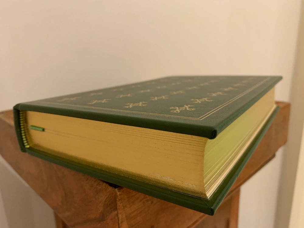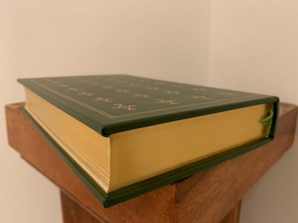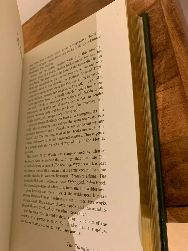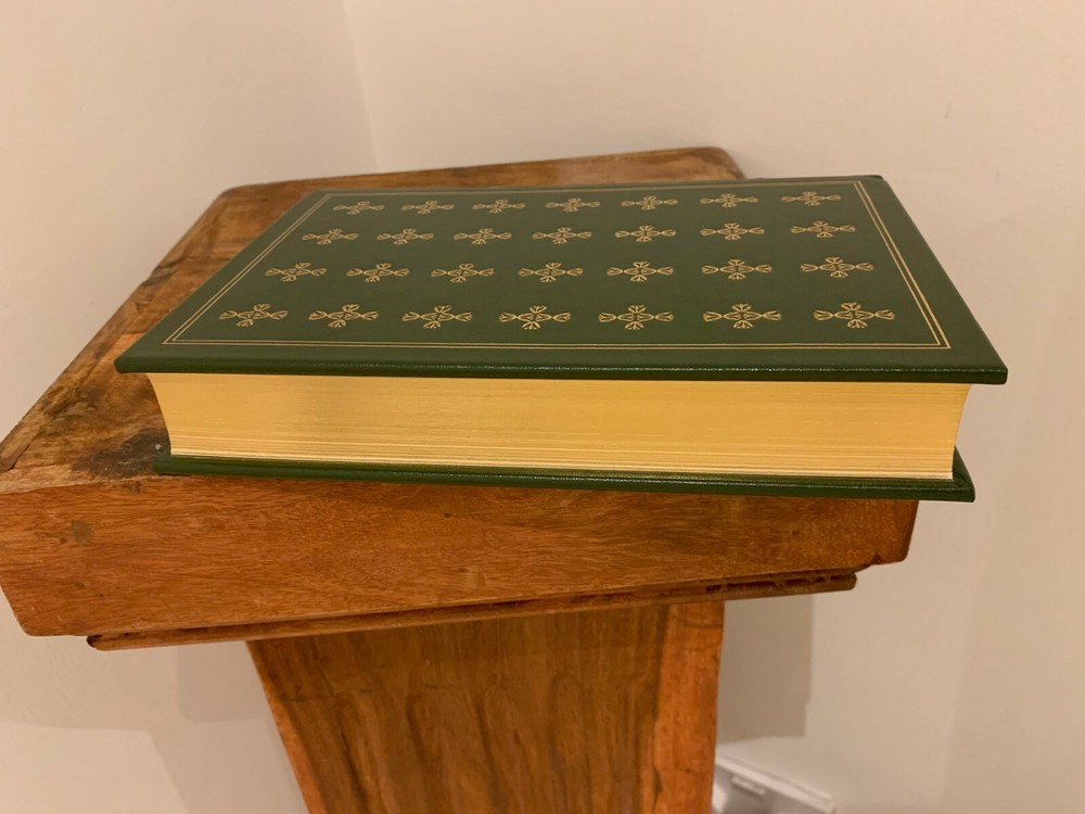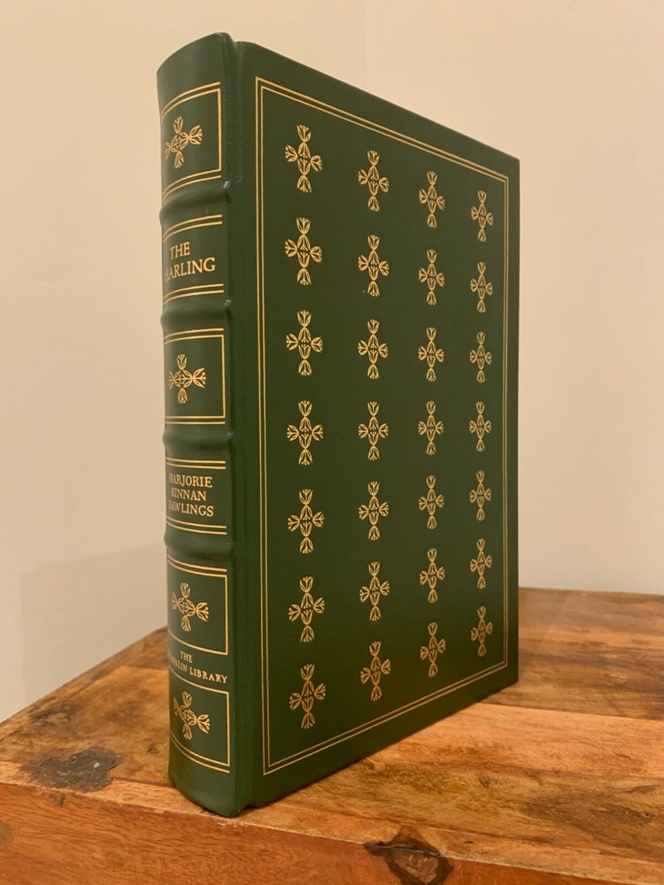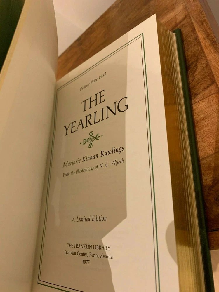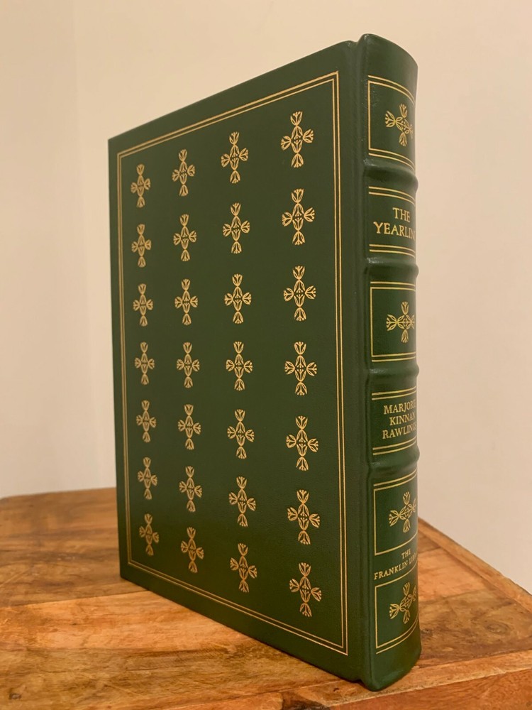 This is full genuine leather bound in like new condition, never opened or read. There is no damage to the leather, no frayed book mark. There is minor imperfections to the gold gilding of the page block as shown in photos. The is some sun fading to the fabric moire end pages, as shown in photos. Photos show no sagging of the page block, which means it was never displayed and the top has not separated from the spine. 'The Yearling' by Marjorie K. Rawlings is one of Franklin Library's ‘Pulitzer Prize’, with wonderful attributes: •Fully and tightly bound in genuine leather. •22kt gold accents deeply inlaid on the "hubbed" spine and covers. •Heavy duty binding boards enhance the book’s durability. •Superbly printed on acid-neutral paper that lasts for generations. •Sewn pages – not just glued like ordinary books. •Handsome moiré end pages and a satin-ribbon page marker. •Gold gilded page ends. •Rigorous inspection at every stage ensured adherence to exacting standards and the highest quality. •Superb craftsmanship and commitment to quality. The appeal for collecting Franklin Library comes from having these attributes taken way further into the exquisite quality, durability and craftmanship, than Easton Press and Folio Society managed with their productions. This book is the perfect companion out on a park bench with a hot cup of coffee or snuggled up in front of the fireplace. Despite its all-inclusive nature it still feels very light and compact at a size of 4 x 15 x 22cm. Wonderful to hold and excellent reading experience.