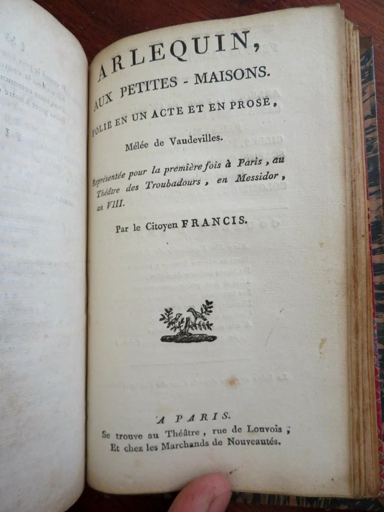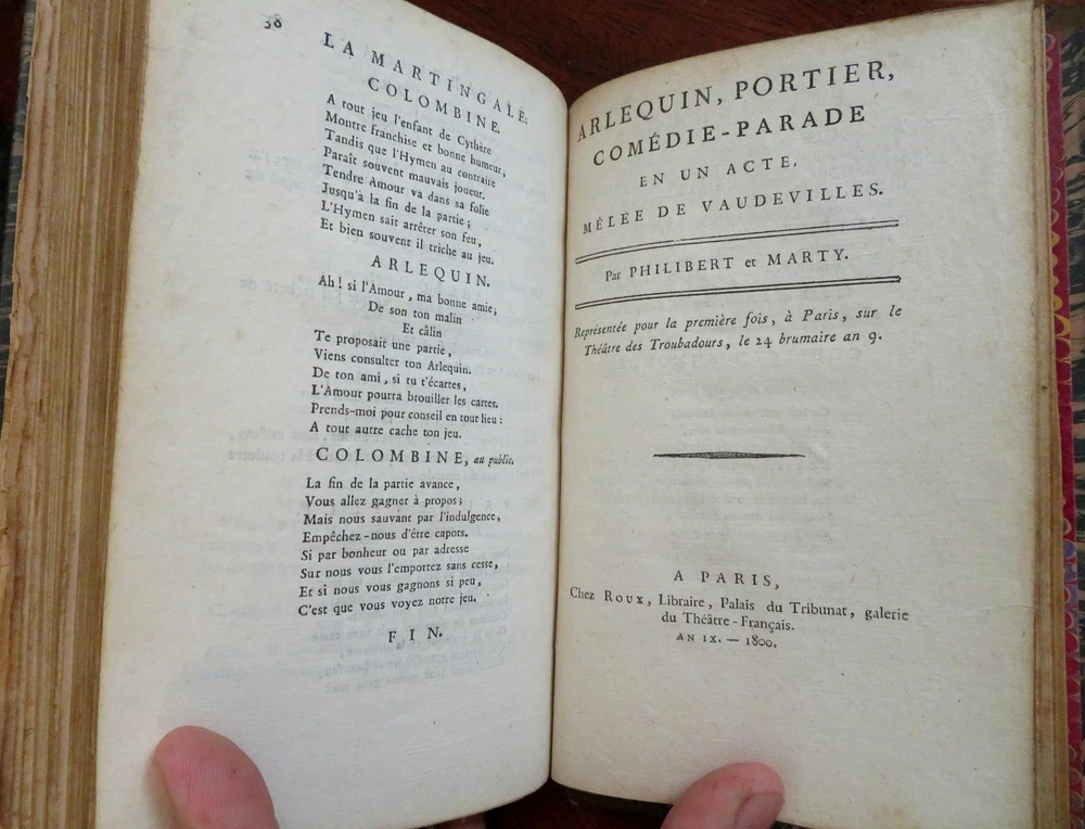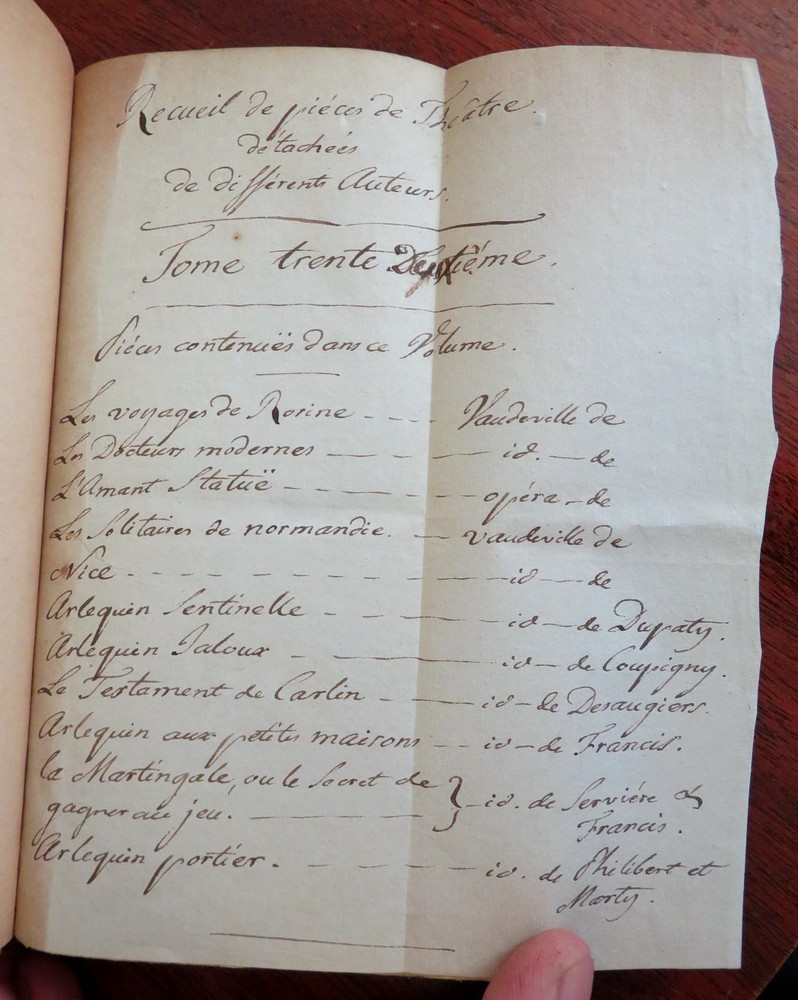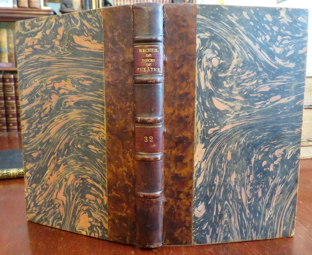 Theatre collection of 12 early plays c. 1780's -1801 sammelband leather book Theatre collection of 12 early plays c. 1780's -1801 sammelband leather book (Old Books, 18th Century Books, Leather Books, French Books, Drama, French Theatre, Collected Plays). Recueil de Pieces de Theatre- sammelband of loose plays gathered and bound together long ago. Published c. 1780's-1801, Paris by Various. c. 300 pages. Text in French. Interesting assortment of twelve mostly 18th century plays, all early Paris imprints as issued. While the spine says 32, this volume has no connection to any others before it aside from the fact it contains plays- each sammelband volume we acquired is unique unto itself and stands alone. Old 1/4 leather binding, raised bands, gilt title lettering, marbled covers & end papers, deckled edges. Custom binding for a large assorted collection of old French plays. This volume complete unto itself. Includes hand written table of contents displaying the contents of the volume (see pictures). A complete list can be provided on request. Book is physically old and shows some signs of handling and time. Book is not new or in "new" condition. Binding gently age worn, leather rubbed but still supple, joints and bands slightly scuffed, old owner book plate to paste down, hand written contents leaf at front, remains overall attractive as an object. Text block paper is gently toned, light to moderate scattered age spotting, internally still well preserved, tight, sound. Still attractive on the shelf. Book displays a pleasing and unique age patina and is in nice antiquarian condition, any age flaws easy to overlook or forgive. Please review photos for more detail and our best attempt to convey how this unique and one of a kind antique book survives. Book Measures c. 8 1/2" H x 5 3/4" W. [B3721].