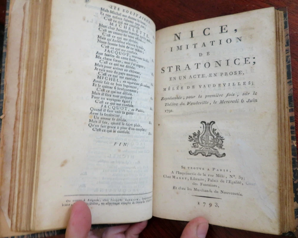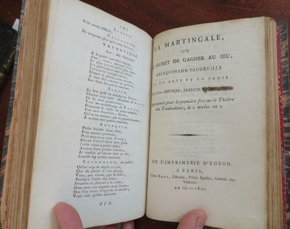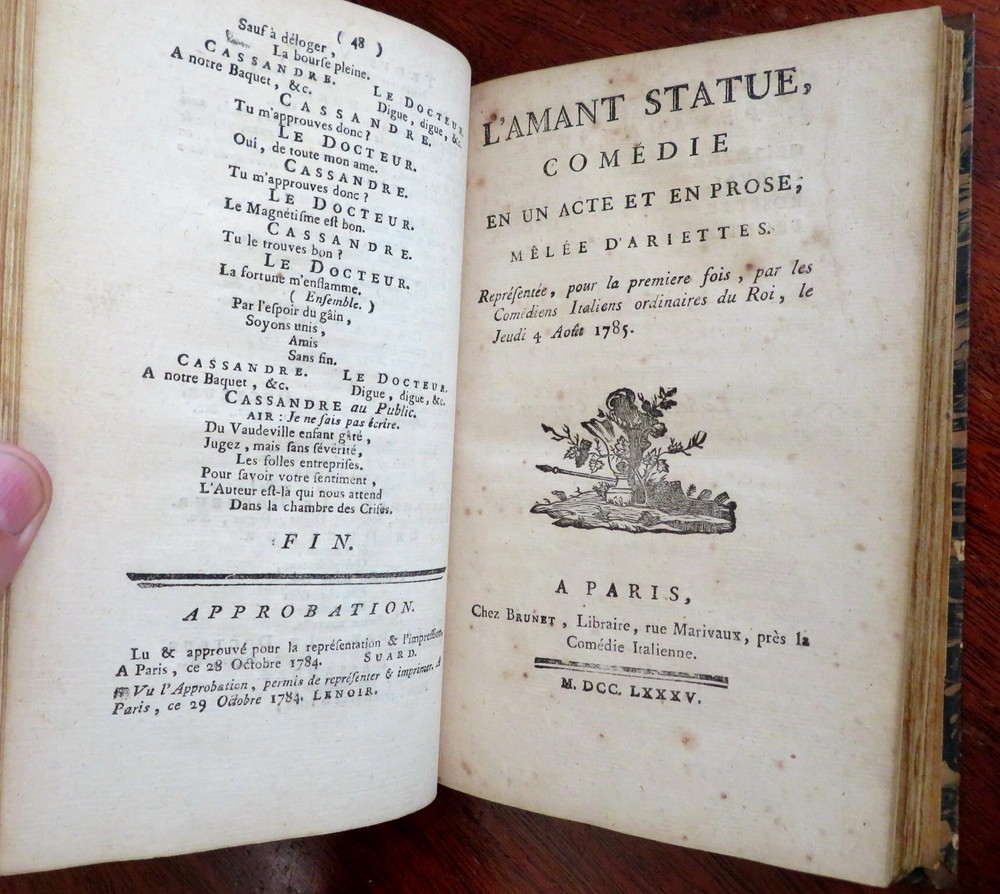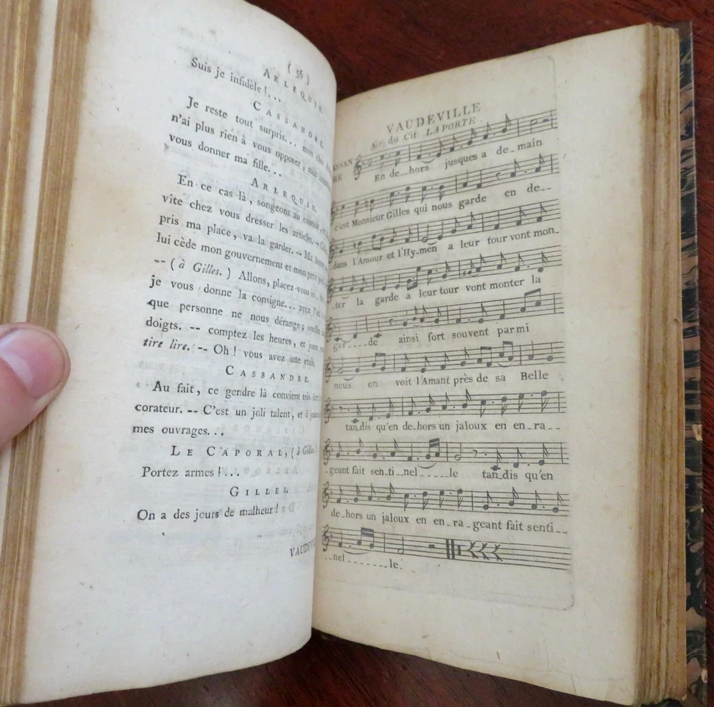 Theatre collection of 12 early plays c. 1780's -1801 sammelband leather book Theatre collection of 12 early plays c. 1780's -1801 sammelband leather book (Old Books, 18th Century Books, Leather Books, French Books, Drama, French Theatre, Collected Plays). Recueil de Pieces de Theatre- sammelband of loose plays gathered and bound together long ago. Published c. 1780's-1801, Paris by Various. c. 300 pages. Text in French. Interesting assortment of twelve mostly 18th century plays, all early Paris imprints as issued. While the spine says 32, this volume has no connection to any others before it aside from the fact it contains plays- each sammelband volume we acquired is unique unto itself and stands alone. Old 1/4 leather binding, raised bands, gilt title lettering, marbled covers & end papers, deckled edges. Custom binding for a large assorted collection of old French plays. This volume complete unto itself. Includes hand written table of contents displaying the contents of the volume (see pictures). A complete list can be provided on request. Book is physically old and shows some signs of handling and time. Book is not new or in "new" condition. Binding gently age worn, leather rubbed but still supple, joints and bands slightly scuffed, old owner book plate to paste down, hand written contents leaf at front, remains overall attractive as an object. Text block paper is gently toned, light to moderate scattered age spotting, internally still well preserved, tight, sound. Still attractive on the shelf. Book displays a pleasing and unique age patina and is in nice antiquarian condition, any age flaws easy to overlook or forgive. Please review photos for more detail and our best attempt to convey how this unique and one of a kind antique book survives. Book Measures c. 8 1/2" H x 5 3/4" W. [B3721].