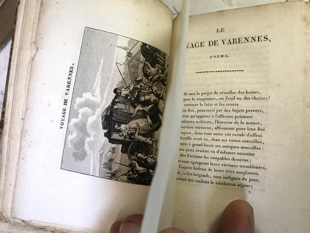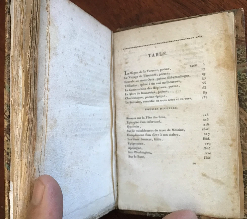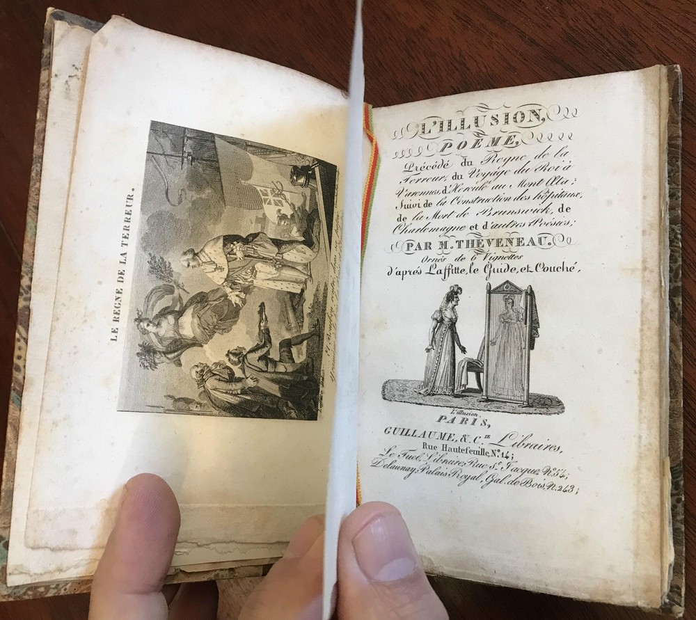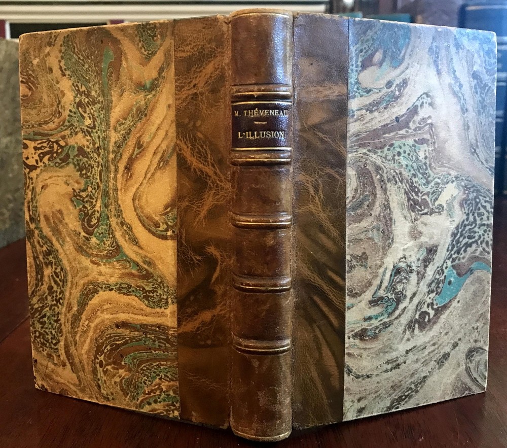 Theveneau Collected Poems c.1790 fine leather book illustrated 6 engraved plates Theveneau Collected Poems c.1790 fine leather book illustrated 6 engraved plates (Old Books, 18th Century Books, Leather Books, Illustrated Books, Poetry Collections, French Books). L'Illusion, Poeme... by Theveneau. Published c. 1790-1810, Paris by Didot. 229 [230] pages. Text in French. Illustrated with six engraved plates (frontis, engraved title vignette plus five others). Old 1/4 leather binding, raised & gilt bands, gilt title lettering, marbled covers & end papers, deckled edges. Untrimmed deckled edges to hand made paper as issued. Book is over 200 years old and shows some signs of handling and time. Book is not new or in "new" condition. Binding gently age worn, leather rubbed but still supple, remains overall attractive as an object. Text block paper is gently toned, light scattered age spotting, internally still well preserved, tight, sound. Still attractive on the shelf. Book displays a pleasing and unique age patina and is in nice antiquarian condition, any age flaws easy to overlook or forgive. Please review photos for more detail and our best attempt to convey how this scarce little European book survives. Book Measures c. 6" H x 4" W. [B3535].