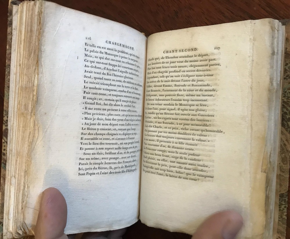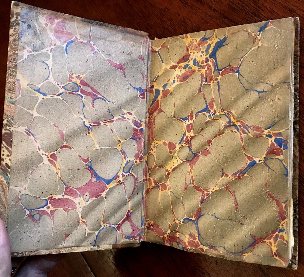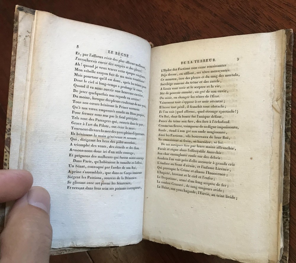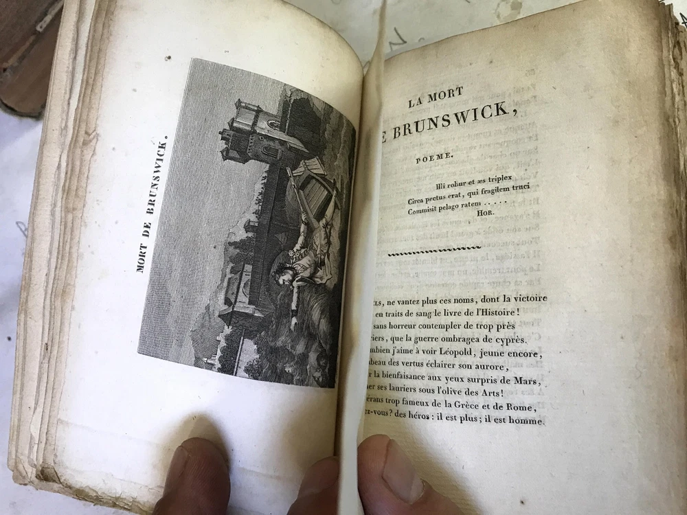 Theveneau Collected Poems c.1790 fine leather book illustrated 6 engraved plates Theveneau Collected Poems c.1790 fine leather book illustrated 6 engraved plates (Old Books, 18th Century Books, Leather Books, Illustrated Books, Poetry Collections, French Books). L'Illusion, Poeme... by Theveneau. Published c. 1790-1810, Paris by Didot. 229 [230] pages. Text in French. Illustrated with six engraved plates (frontis, engraved title vignette plus five others). Old 1/4 leather binding, raised & gilt bands, gilt title lettering, marbled covers & end papers, deckled edges. Untrimmed deckled edges to hand made paper as issued. Book is over 200 years old and shows some signs of handling and time. Book is not new or in "new" condition. Binding gently age worn, leather rubbed but still supple, remains overall attractive as an object. Text block paper is gently toned, light scattered age spotting, internally still well preserved, tight, sound. Still attractive on the shelf. Book displays a pleasing and unique age patina and is in nice antiquarian condition, any age flaws easy to overlook or forgive. Please review photos for more detail and our best attempt to convey how this scarce little European book survives. Book Measures c. 6" H x 4" W. [B3535].