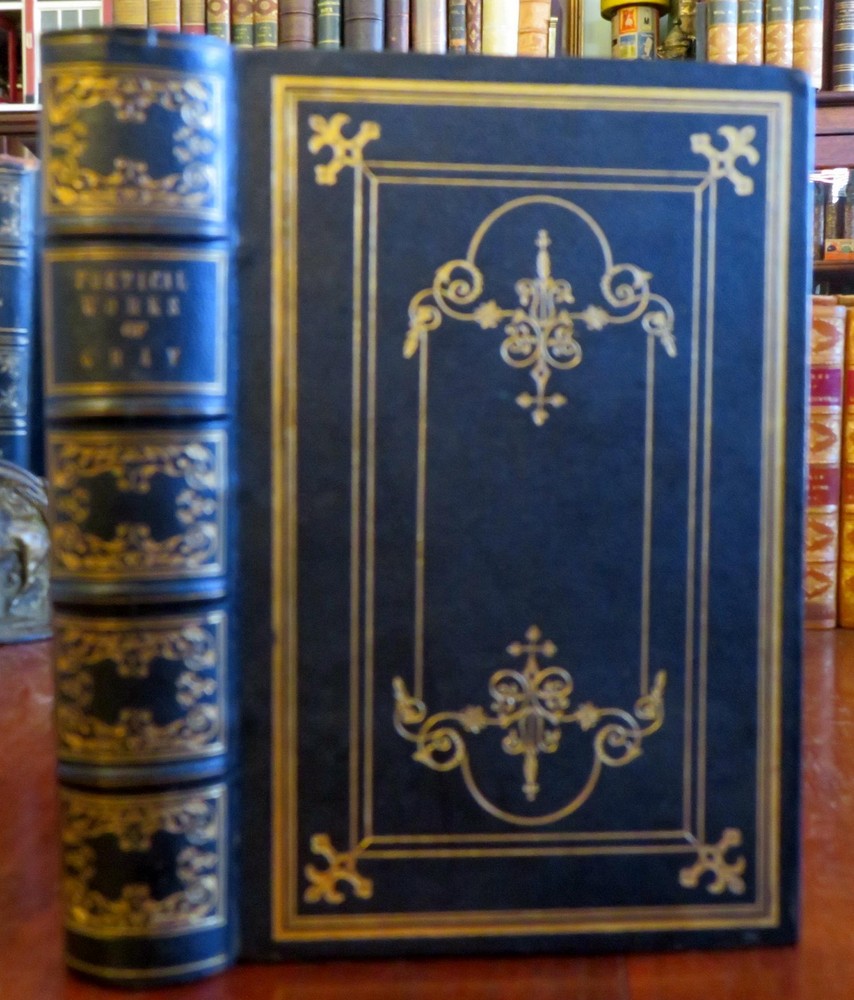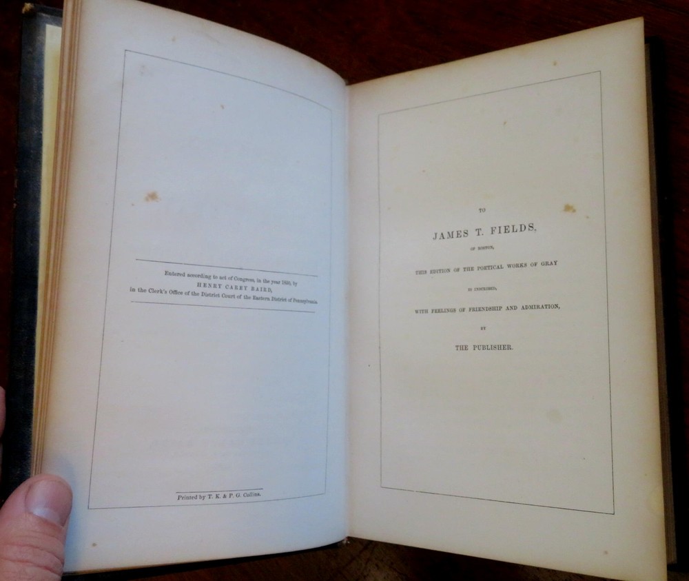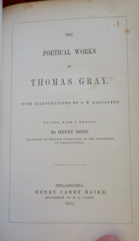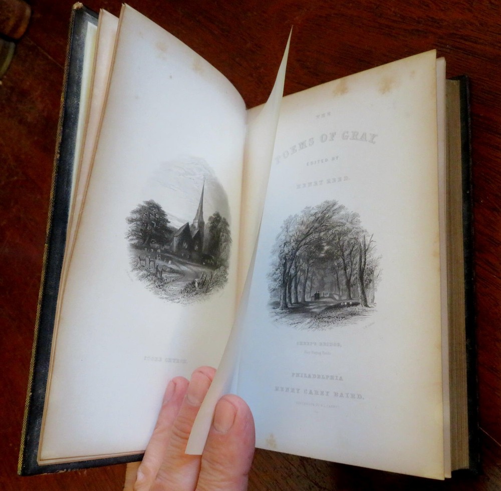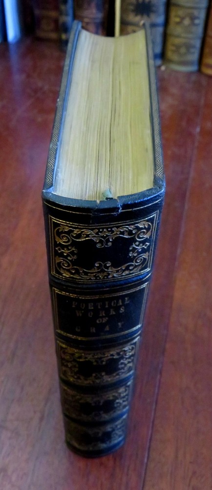 Thomas Gray Collected Poems 1850 Radclyffe illustrated ornate gift leather book Thomas Gray Collected Poems 1850 Radclyffe illustrated ornate gift leather book (Old Books, 19th Century Books, Leather Books, Poetry, Thomas Gray, Illustrated Books, Decorative Leather Bindings). The Poetical Works of Thomas Gray, with Illustrations by C.W. Radclyffe. Published 1851, Philadelphia by Henry Carey Baird. 334 pages. Text in English. Engraved frontis & half title protected by original tissue guard. Illustrated with five engraved plates. Attractive antiquarian full leather binding, gilt & raised bands, gilt title lettering & compartment decorations, gilt ruled covers, all edges gilt. Book is physically old and shows some signs of handling and time. Binding gently age worn but still appealing, small split piece at top of spine repaired and now easy to forgive visually, leather and joints surface scuffed but still supple, remains overall very attractive as an object. Text block paper is gently age toned as typical, internally book remains mostly clean, tight and sound. A book which has been taken care of but may/ does not look like new. Still attractive on the shelf. Book displays a pleasing and unique age patina and is in rather nice antiquarian condition, any age flaws seem easy to overlook or forgive. Please review photos for more detailed attempt to present this beautiful book as it survives. We often over-describe any flaws that many sellers would not even bother to mention since most people would overlook them as minor and unworthy of comment. Many people tell us the books they receive from us are nicer in person than they appears on the screen. We want you to be clear about what you are buying, so we take numerous photos and try to describe it openly and honestly. Book Measures c. 8 1/2" H x 5 3/4" W. [B7510].