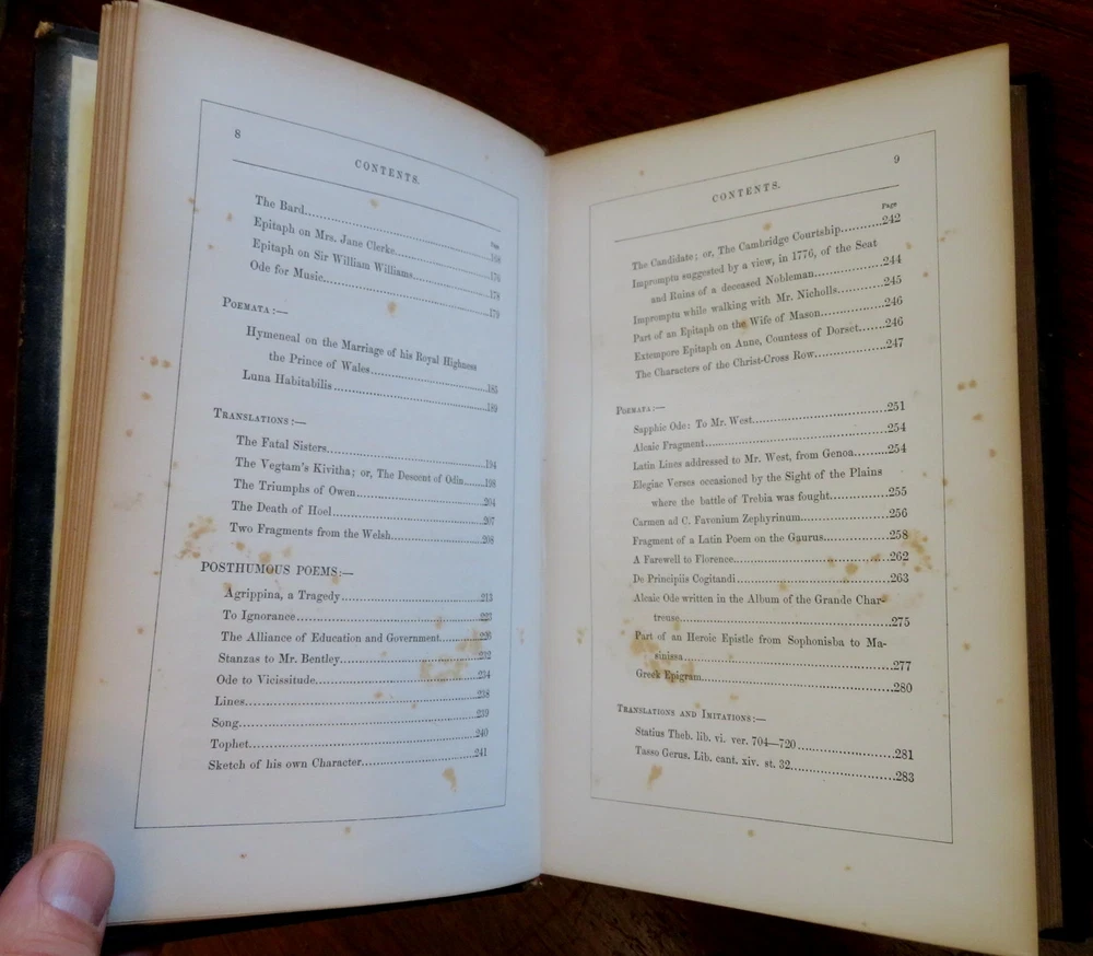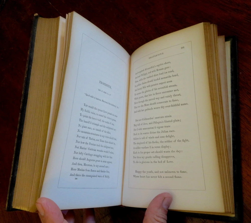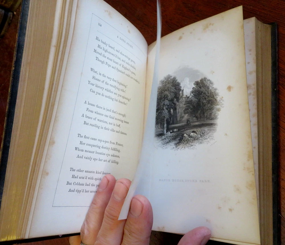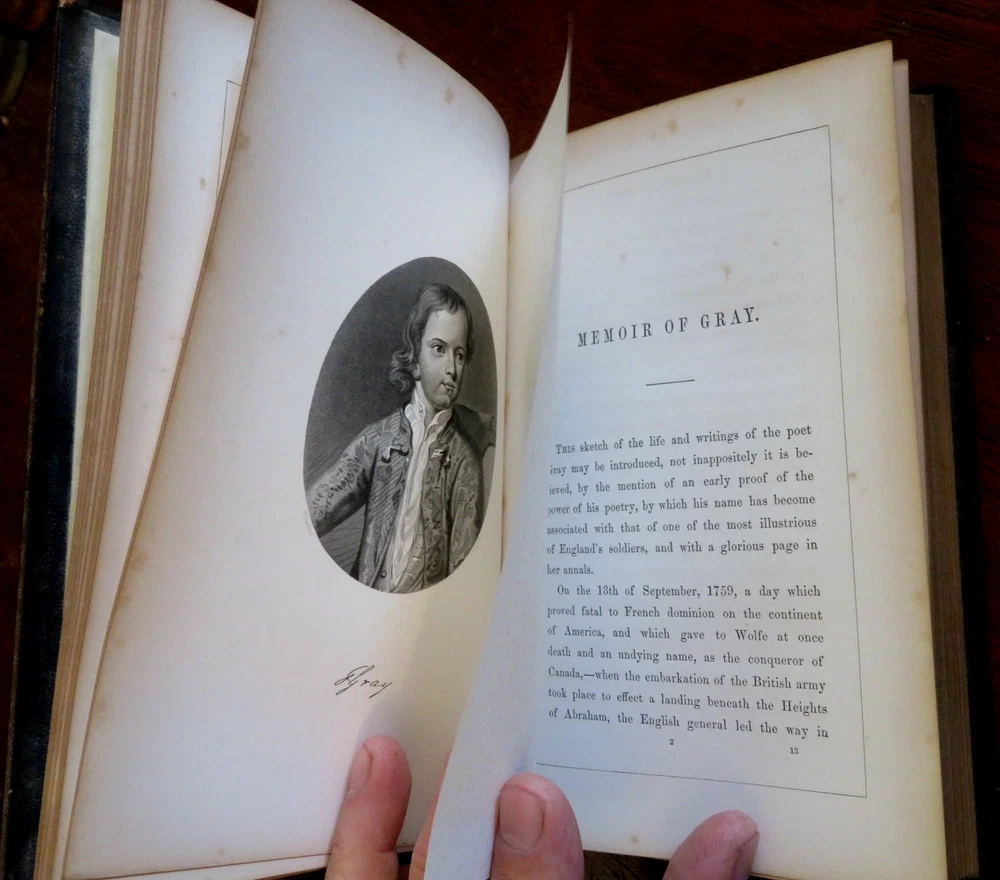 Thomas Gray Collected Poems 1850 Radclyffe illustrated ornate gift leather book Thomas Gray Collected Poems 1850 Radclyffe illustrated ornate gift leather book (Old Books, 19th Century Books, Leather Books, Poetry, Thomas Gray, Illustrated Books, Decorative Leather Bindings). The Poetical Works of Thomas Gray, with Illustrations by C.W. Radclyffe. Published 1851, Philadelphia by Henry Carey Baird. 334 pages. Text in English. Engraved frontis & half title protected by original tissue guard. Illustrated with five engraved plates. Attractive antiquarian full leather binding, gilt & raised bands, gilt title lettering & compartment decorations, gilt ruled covers, all edges gilt. Book is physically old and shows some signs of handling and time. Binding gently age worn but still appealing, small split piece at top of spine repaired and now easy to forgive visually, leather and joints surface scuffed but still supple, remains overall very attractive as an object. Text block paper is gently age toned as typical, internally book remains mostly clean, tight and sound. A book which has been taken care of but may/ does not look like new. Still attractive on the shelf. Book displays a pleasing and unique age patina and is in rather nice antiquarian condition, any age flaws seem easy to overlook or forgive. Please review photos for more detailed attempt to present this beautiful book as it survives. We often over-describe any flaws that many sellers would not even bother to mention since most people would overlook them as minor and unworthy of comment. Many people tell us the books they receive from us are nicer in person than they appears on the screen. We want you to be clear about what you are buying, so we take numerous photos and try to describe it openly and honestly. Book Measures c. 8 1/2" H x 5 3/4" W. [B7510].