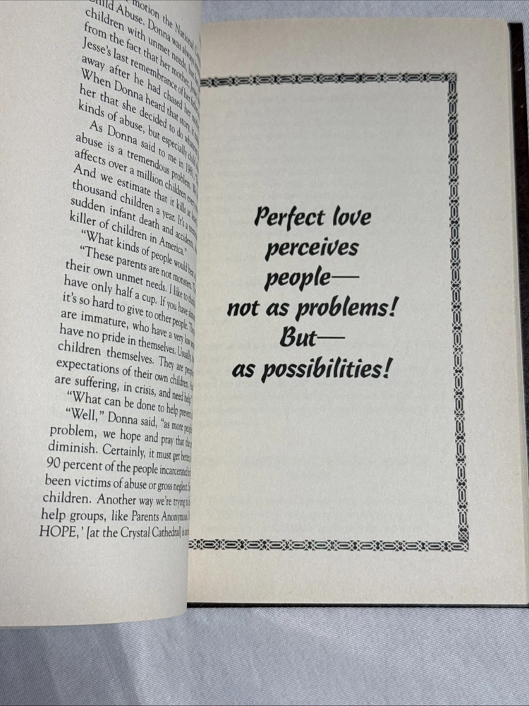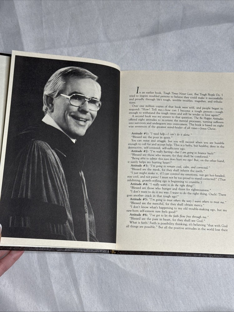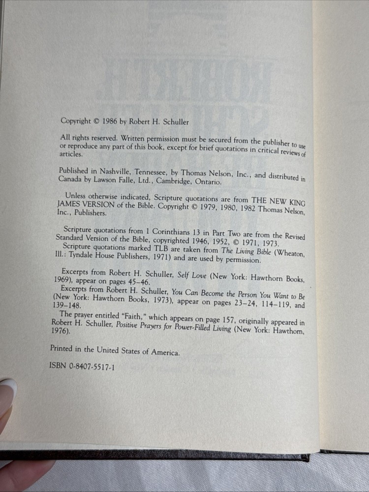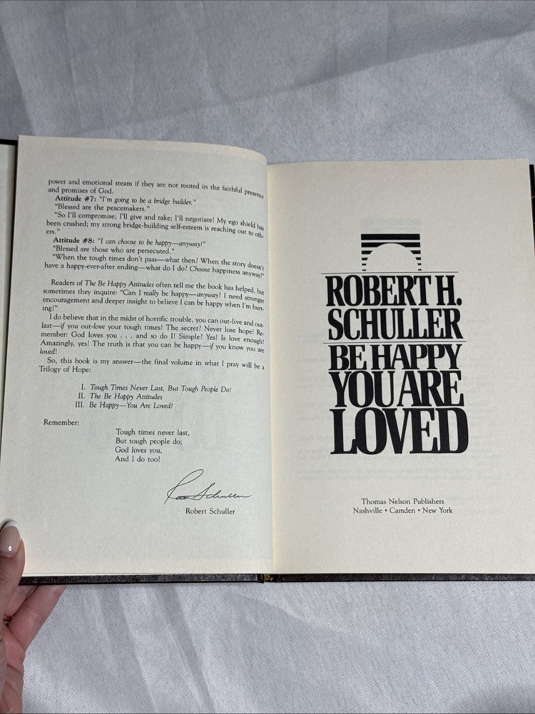 Be Happy You Are Loved is one of Schuller’s many books, and its title reflects his emphasis on the idea that knowing you are loved—particularly by God—can be a source of happiness and emotional strength. Schuller often wrote about overcoming adversity and building self-esteem through faith and positivity, which aligns with the themes suggested by the title and the visible text in the book. The dedication on the title page reads, “To Arvella, my first wife, my wife today, that anyone can know lives, that reflects in me and makes me the ‘God’.” This dedication is to Arvella Schuller, Robert Schuller’s wife, who played a significant role in his ministry and life. Publication Details • Publisher: Thomas Nelson Publishers, a well-known Christian publishing house. • Copyright: 1986, as noted in the copyright page. • ISBN: 0-8407-5571-1, which can be used to find more specific editions or copies. • Other Works by Schuller: The copyright page lists other books by Schuller, including Self Love (1969), You Can Become the Person You Want to Be (1973), The Prayer entitled “Faith” (1976, appearing on pages 157 and 123-124 in this book), and Tough Times Never Last, But Tough People Do! (1983). These titles reflect Schuller’s recurring themes of resilience, self-improvement, and spiritual encouragement. Content and Style Based on the visible text and Schuller’s typical writing style, Be Happy You Are Loved likely focuses on helping readers find happiness and self-worth through the lens of Christian faith. The excerpt on the left page mentions concepts like “self-esteem,” “ego,” and choosing happiness, which are central to Schuller’s philosophy of “possibility thinking”—a term he coined to encourage people to see challenges as opportunities through faith and optimism. The text also references the idea of being “loved,” which is likely tied to the Christian belief in God’s unconditional love. Schuller often used personal anecdotes, scriptural references, and practical advice in his books. The copyright page notes that Scripture quotations are primarily from The New King James Version of the Bible (1979, 1980, 1982), with additional citations from The Revised Standard Version of the Bible (1952, 1971, 1973) and The Living Bible (1971). This indicates that the book integrates biblical teachings to support its messages. Cultural and Historical Context Schuller was a significant figure in the 1980s, a time when televangelism was at its peak in the United States. His Hour of Power program reached millions, and his books were widely read by those seeking spiritual and motivational guidance. Be Happy You Are Loved fits into the broader trend of self-help literature during this period, which often blended religious themes with psychological principles. Schuller’s optimistic, faith-centered approach contrasted with more traditional, sin-focused preaching, making his work accessible to a broad audience.