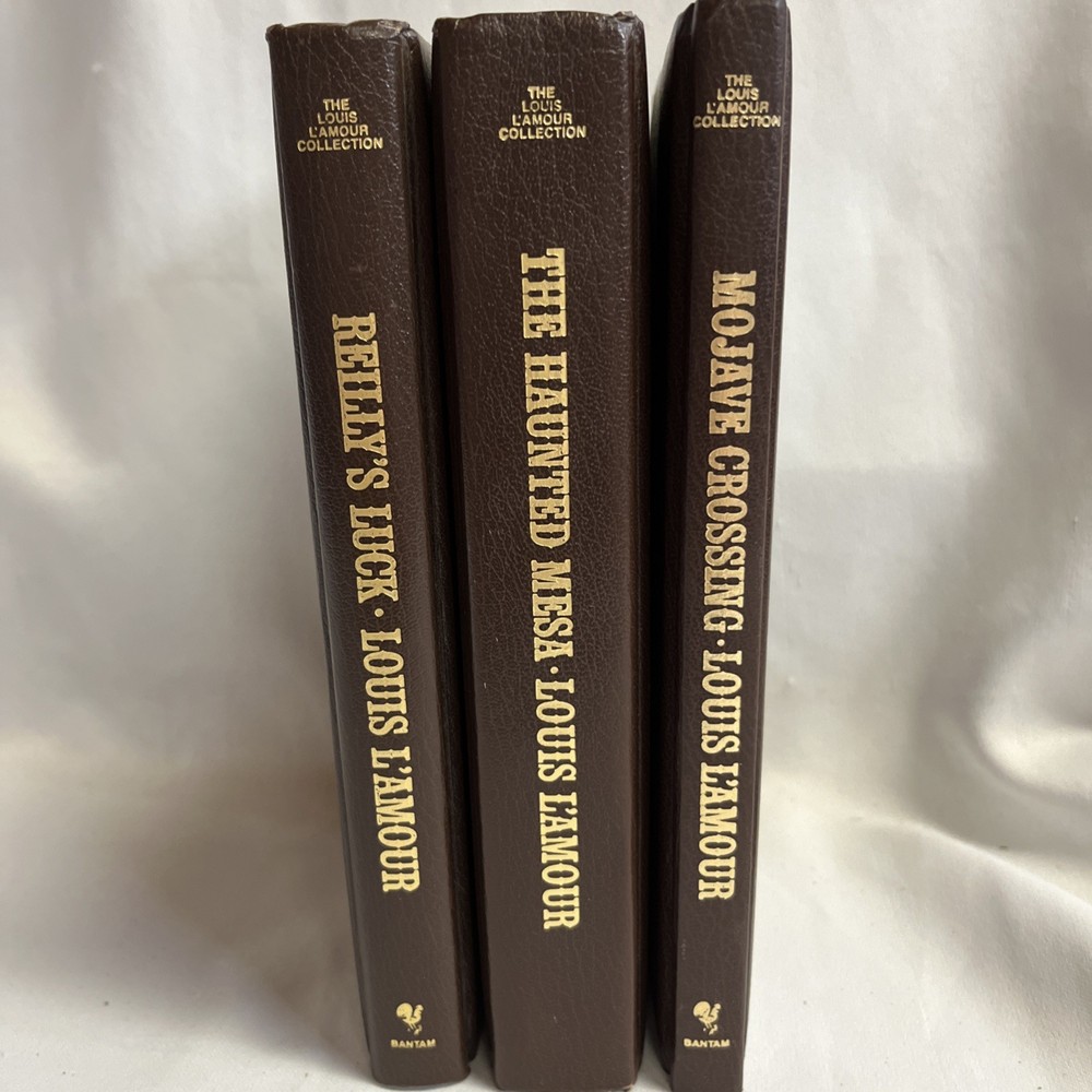 This product is a collection of three Louis L'Amour hardback leatherette-bound books from the Louis L'Amour Collection published by Bantam Books. The novels are from the Western genre, with a total of 716 pages across the three books. The faux leather binding adds a touch of elegance to the classic works of fiction by the renowned author, making it a desirable addition to any bookshelf. Each book is 9 inches in length and 6 inches in width, making them a compact and collectible set for fans of Louis L'Amour's writing. These are preowned volumes in good condition. The volume “Reilly’s Luck” does have the previous owner’s name written inside the cover please see photos. Titles below: “Reilly’s Luck” “The Haunted Mesa” “Mojave Crossing”