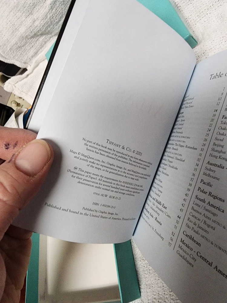 The Tiffany & Co 2001 Traveler's World Atlas is a luxurious and sophisticated atlas designed for travelers. Encased in black leather binding with gilded pages, this atlas exudes elegance and style. Published in the year 2001, it provides detailed maps and information for navigating the world. Perfect for collectors or those who appreciate fine craftsmanship, this atlas offers a timeless and classic appeal.