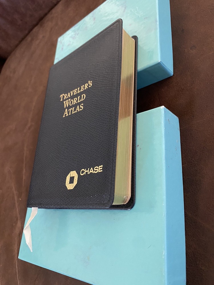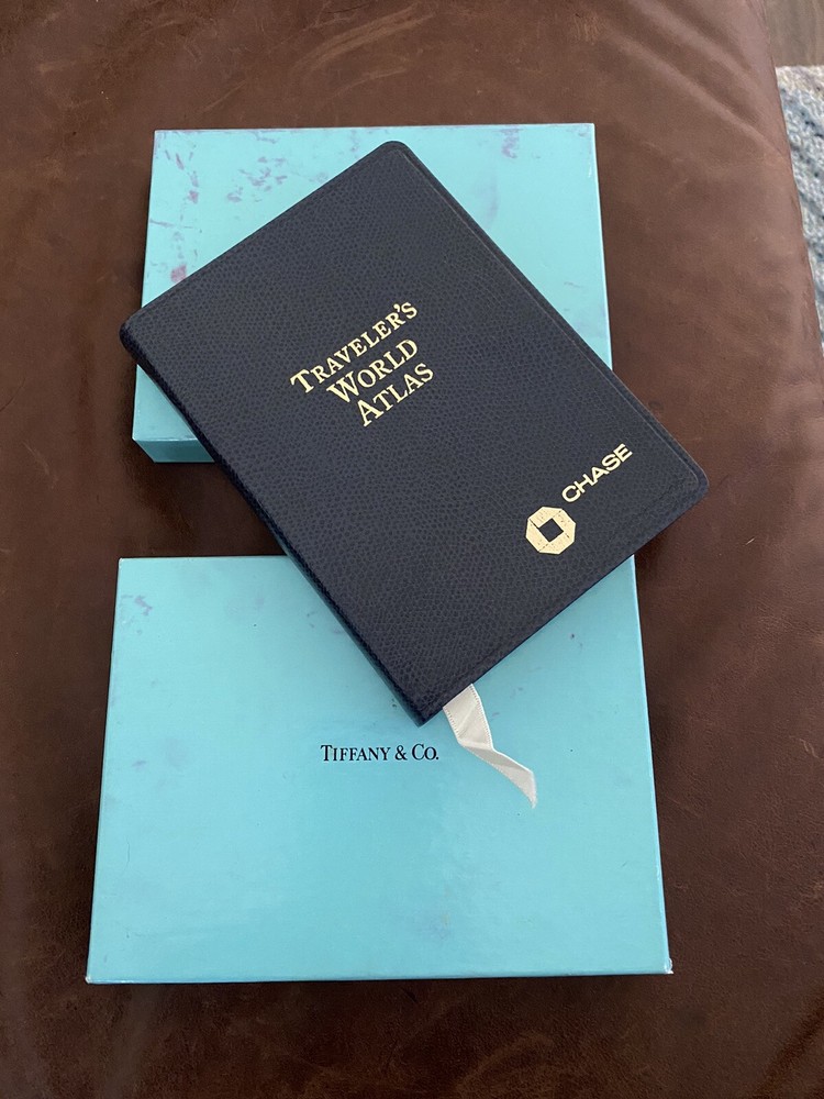 Tiffany & Co Travelers World Atlas Book leather bound 1996 Collectible. The book is in very good condition. The Tiffany box has several stains and scratches (see photos)....