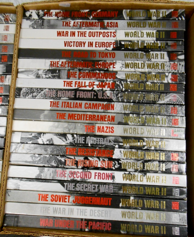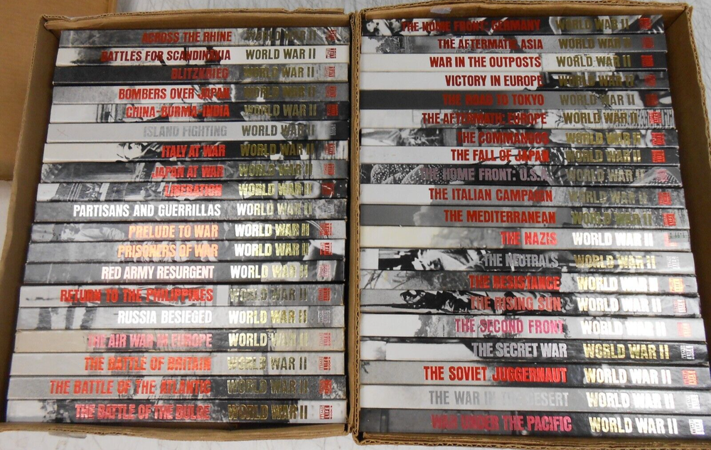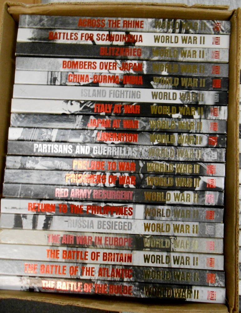 Complete Series Time-Life WORLD WAR II 39 Volume Set - HC VGC Copyright by the Time-Life Books, Inc. Time-Life World War II: Set by Time-Life Books Across The Rhin e by Franklin M Davis V. 22 Battle of Britain by Leonard Mosley V.3 Battles for Scandinavia by John R. Elting V. 28 Blitzkrieg by Robert Wernick V. 2 Bombers Over Japan by Keith Wheeler V. 34 China-Burma-India by Don Moser V. 9 Home Front: Germany by Charles Whiting V. 32 Island fighting by Rafael Steinberg V.10 Italy at War by Henry Hitch Adams V. 33 Japan At War by Time-Life Books V. 26 Liberation by Martin Blumenson V. 14 Partisans and Guerillas by Ronald H. Bailey V. 12 Prelude to War by Robert T. Elson V. 1 Prisoners of War by Ronald H. Bailey V. 30 Red Army Resurgent by John Shaw V. 20 Return to the Philippines by Rafael Steinberg V. 15 Russia besieged by Nicholas Bethell V. 6 The Aftermath: Asia by Time-Life Books V. 39 The Aftermath: Europe by Douglas Botting V. 38 The Air War in Europe by Ronald H. Bailey V. 16 The Battle of the Atlantic by Barrie Pitt V. 5 The Battle of the Bulge by William K. Goolrick V. 18 The Commandos by Russell Miller V. 31 The Fall Of Japan by Keith Wheeler V. 37 The Home Front: USA by Ronald H. Bailey V. 8 The Italian Campaign by Robert Wallace V.11 The Mediterranean by A. B. C. Whipple V. 27 The Nazis by Robert Edwin Herzstein V. 21 The Neutrals by Denis J. Fodor V. 35 The Resistance by Russell Miller V. 17 The Rising Sun: World War II Collector's Edition by Arthur Zich V. 4 The Road To Tokyo by Keith Wheeler V. 19 The Second Front by Douglas Botting V. 13 The Secret War by Francis Russell V. 29 The Soviet Juggernaut by Earl F. Ziemke V. 25 The War In The Desert by Richard Collier V. 7 Victory In Europe by Gerald Simons V. 36 War In The Outposts by Simon Rigge V. 24 War Under the Pacific by Keith Wheeler V. 23 Each book measures 11.5” (H) x 9.5” (W) x 29” (Shelf Width) Will be shipped in several boxes. (Shipping approximately 100 lbs. total weight) NO INTERNATIONAL SHIPPING Please visit the Sacramento Book Den eBay store for other great books. Click here for the Sacramento Book Den eBay store All proceeds go to the Sacramento Public Library. Thank you for your consideration of Complete Series Time-Life WORLD WAR II 39 Volume Set - HC VGC Locator: 24994TW