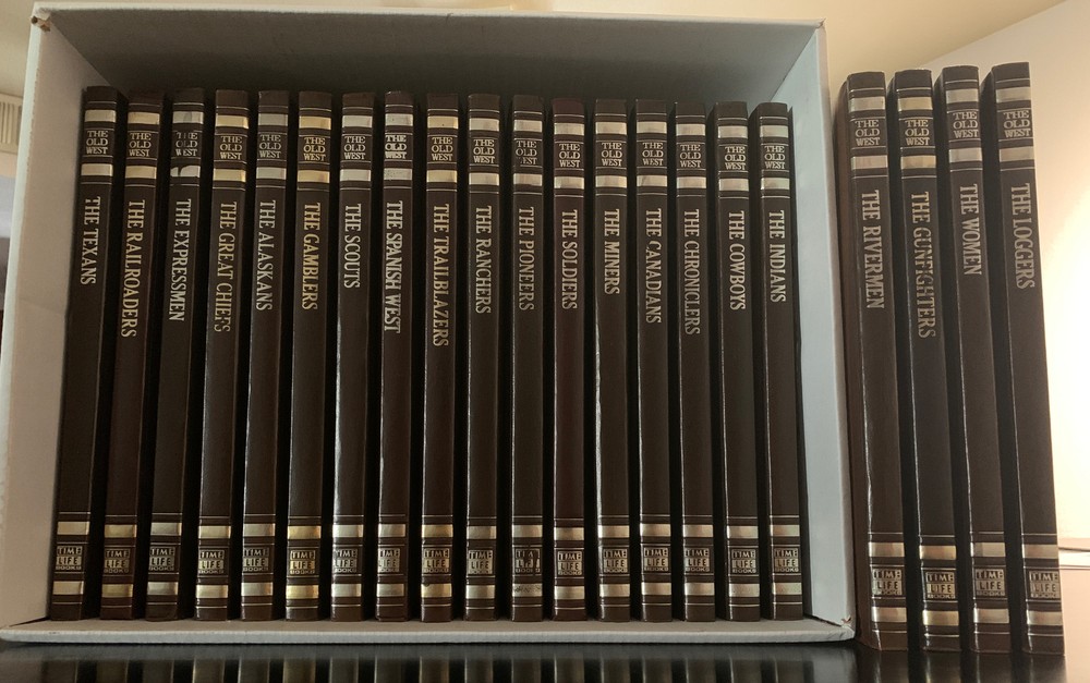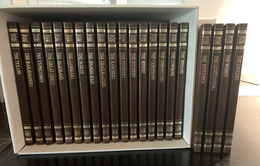 Time-Life Books, The Old West, Series 21 Volume Set. Faux Leather Bound.. Condition is "Like New". The cowboys, Indians, chroniclers, Canadians, miners, soldiers, pioneers, rancher’s, trailblazers, Spanish Wells, scouts, gamblers, Alaskans, grilled cheese, expressmen, Railroaders, Texans, lodgers, women, gun fighters & River-men. ***used condition****