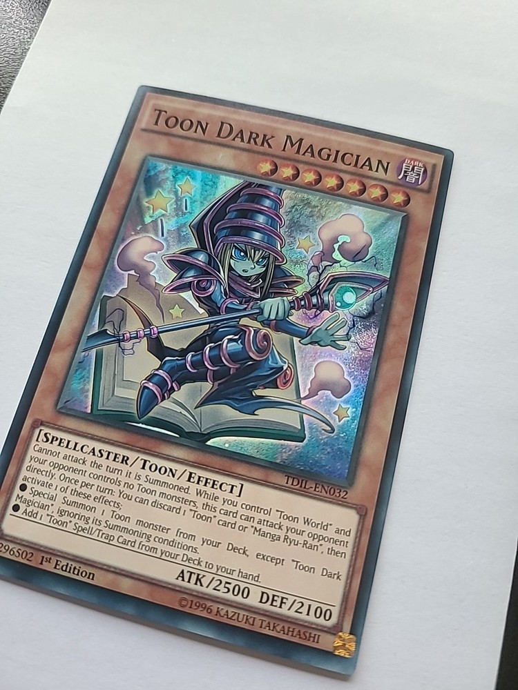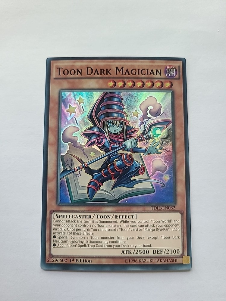 The Toon Dark Magician TDIL-EN032 Yu-Gi-Oh! Card is a Super Rare 1st Edition from the set "The Dark Illusion" manufactured by Konami in 2016. This English card features a Japanese card size and belongs to the Darkness attribute in the Yu-Gi-Oh! Trading Card Game. With an attack power of 2500 and a defense of 2100, this spellcaster monster is a sought-after collectible for fans of the game. It is a unique addition to any card collection, especially for those who appreciate rare and powerful cards like this Toon Dark Magician.
