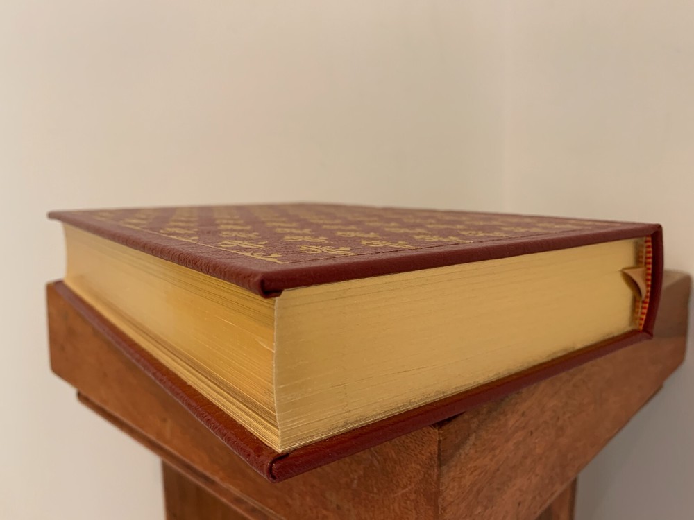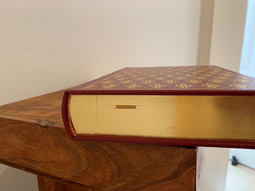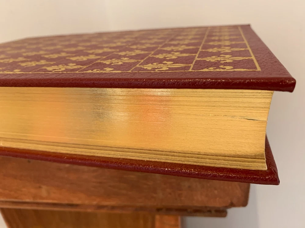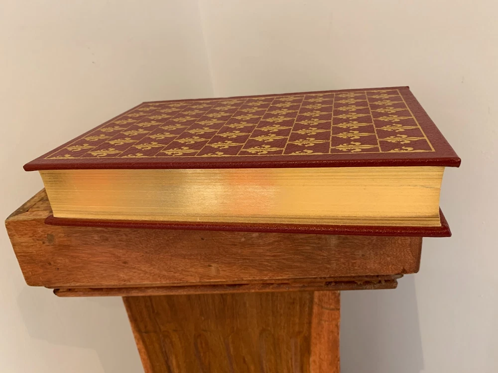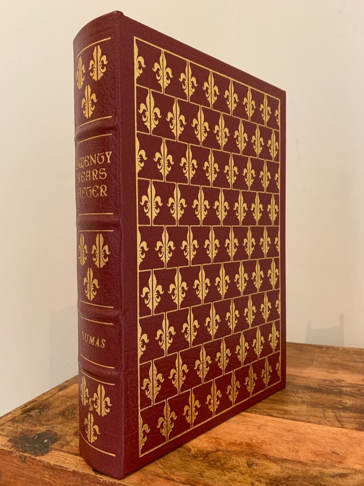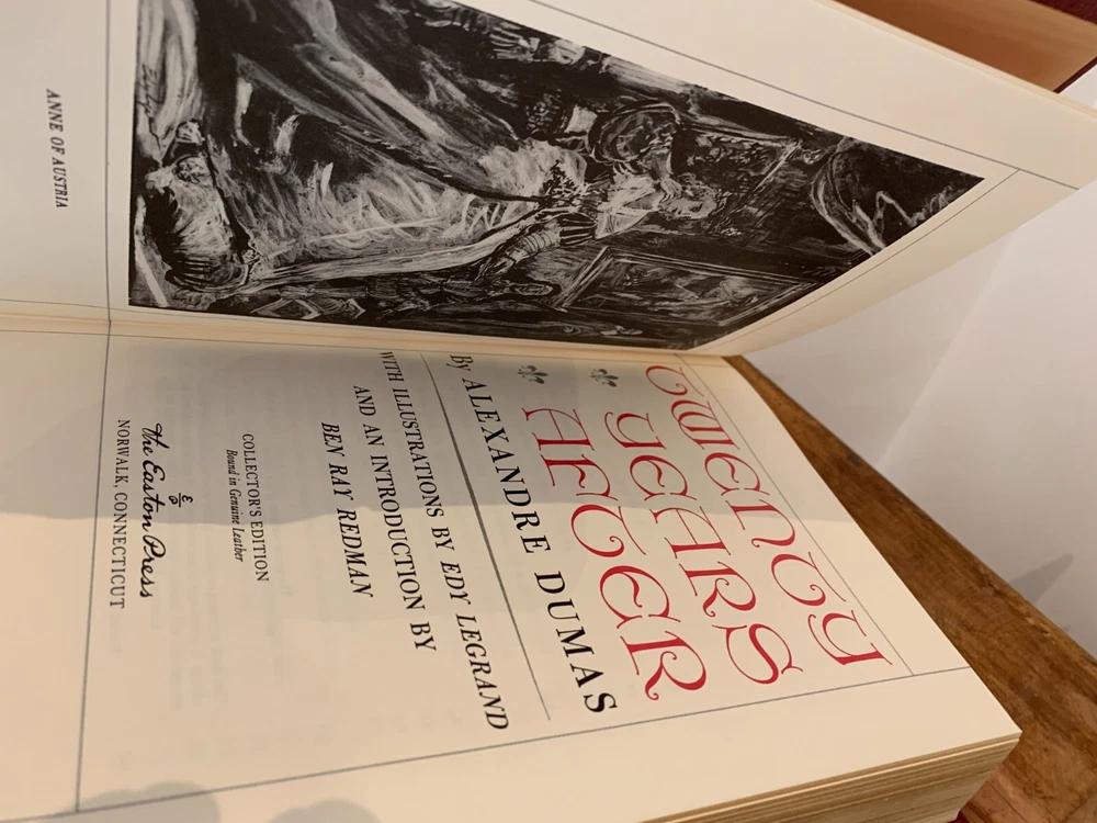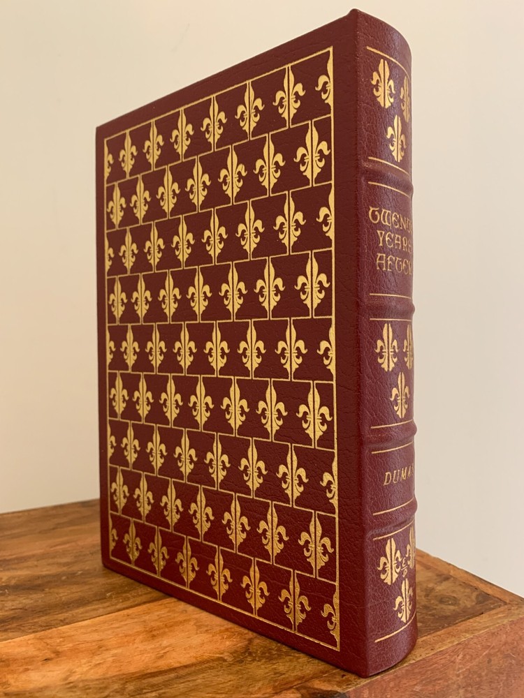 This is full genuine leather bound in like new condition for all intents and purposes, never opened or read. Please look carefully where the covers meet the spine and you will not see the usual fold that forms when you open the book for the first time. There is no damage to the leather or the gold embossing of the binding. There are some marks on the gold gilding of the page block, as shown in the photos. There is no sun fading to the moire end pages. 'Twenty Years After' by Alexandre Dumas is the second book of 'The Three Musketeers' Series from Easton Press with some wonderful attributes: •Fully and tightly bound in genuine leather. •22kt gold accents deeply inlaid on the "hubbed" spine. •Full-colour frontispiece portraits of each author; each volume features illustrations and/or ornamentation. •Heavy duty binding boards enhance the book’s durability. •Superbly printed on acid-neutral paper that lasts for generations. •Sewn pages – not just glued like ordinary books. •Handsome moiré end pages and a satin-ribbon page marker. •Gilded page ends. •Rigorous inspection at every stage ensures adherence to exacting standards of the highest quality. •Superb craftsmanship and commitment to quality. This book is the perfect companion out on a park bench with a hot cup of coffee or snuggled up in front of the fireplace. Despite its all-inclusive nature it still feels very light and compact at a size of 5 x 17 x 24cm. Wonderful to hold and excellent reading experience.