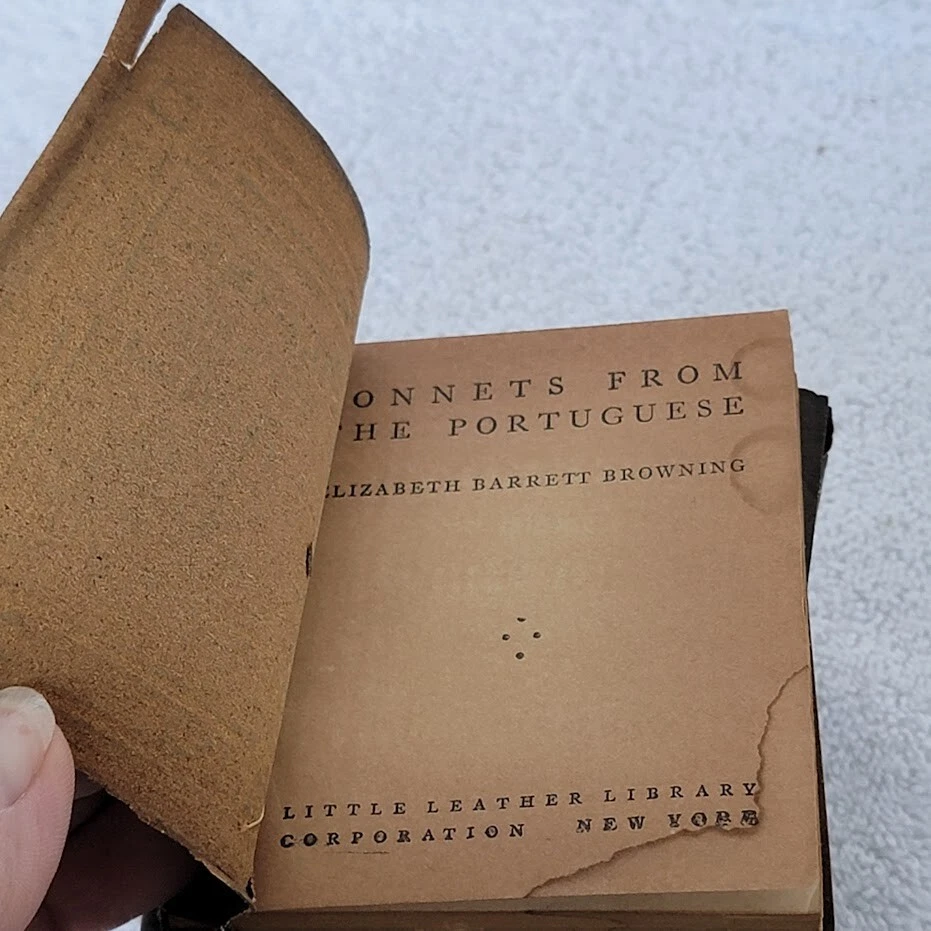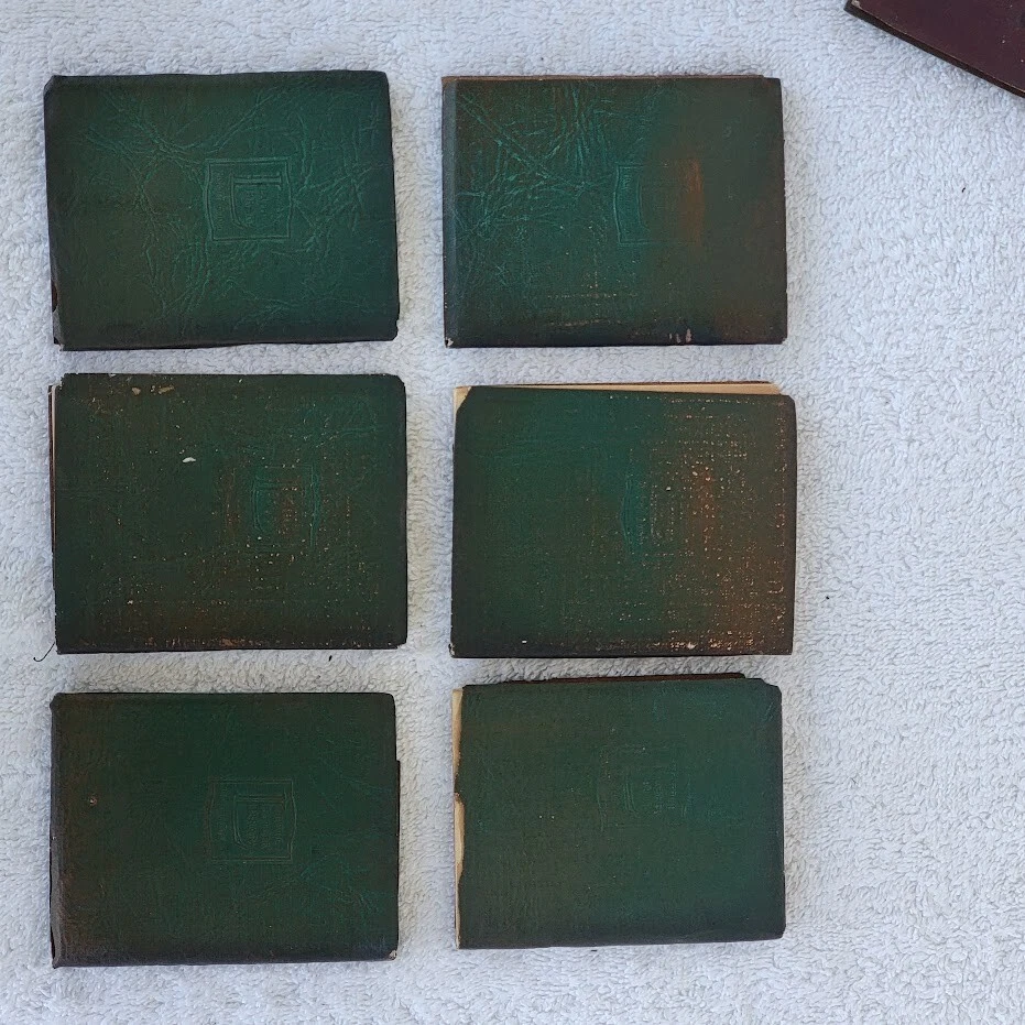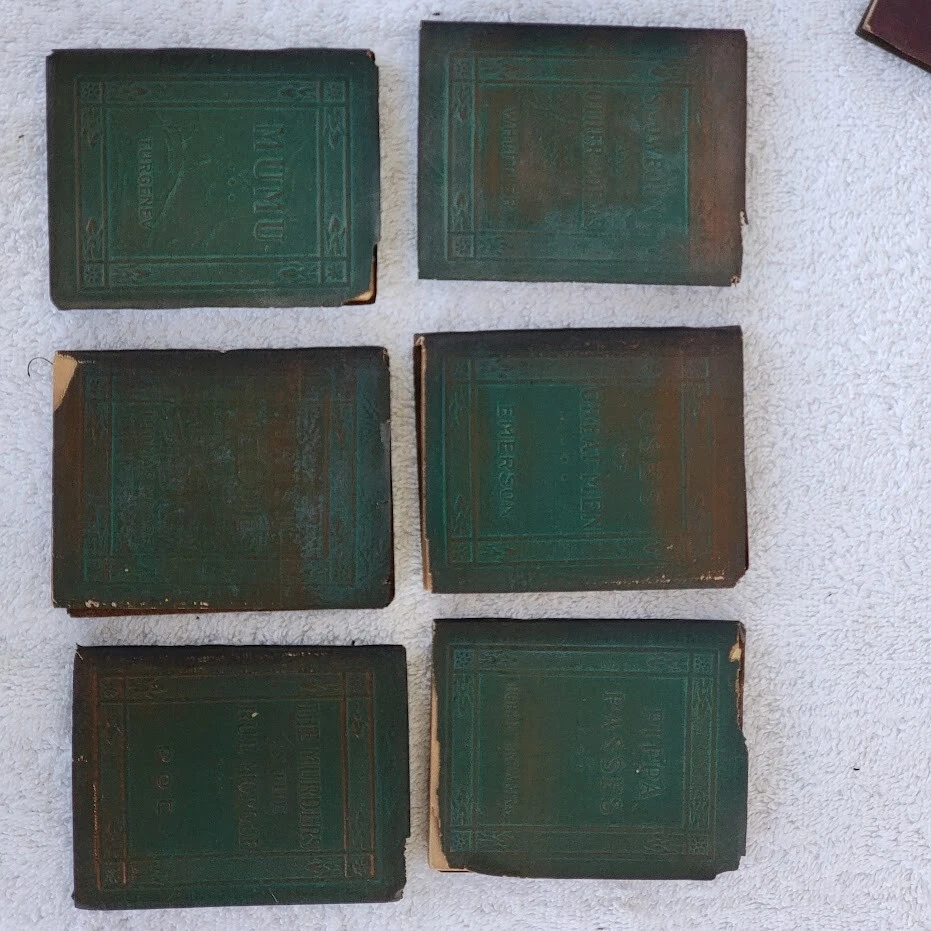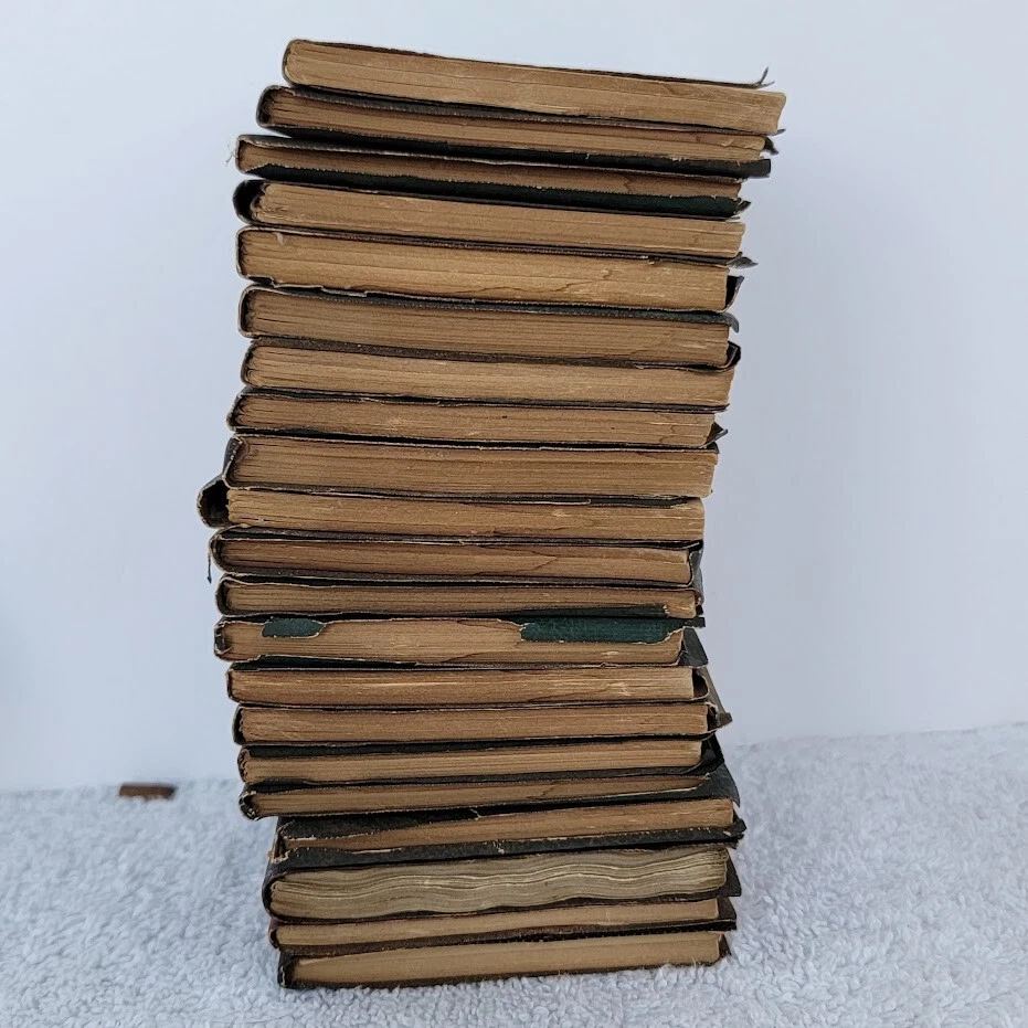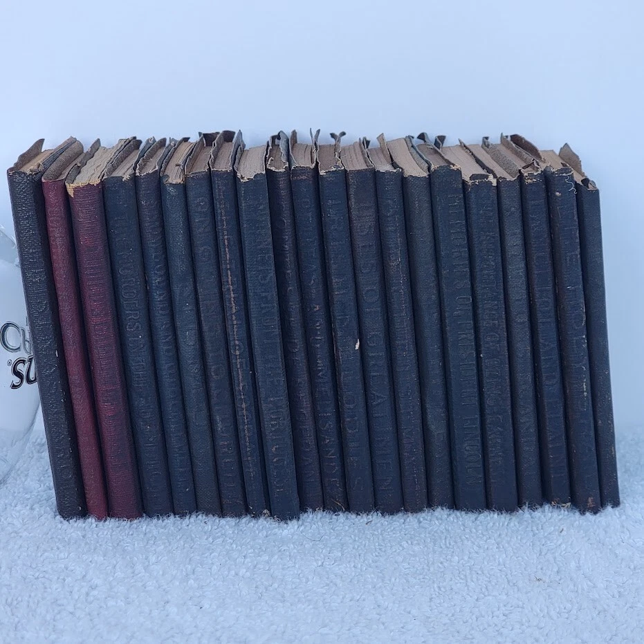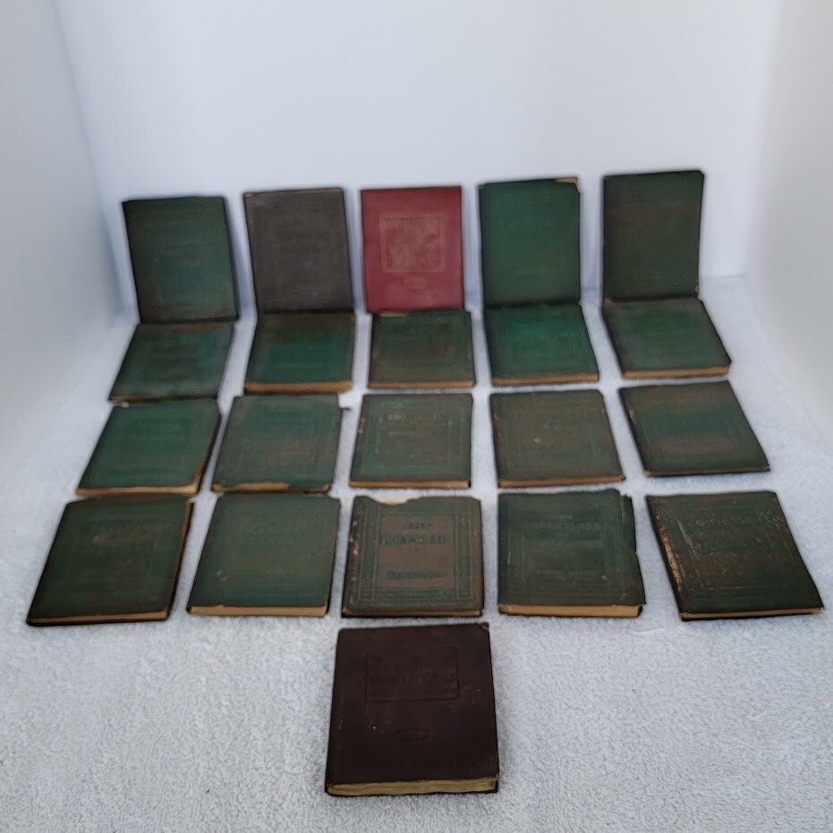 Up for sale is a collection of 21 Leather bound Pocketbooks by the Little Leather Library Book Collection out of New York. Books dated 1921. Titles: Sonnets from the Portugese, Comtesse de St. Geran, The trial of Socrates, Ongoing to Church, Mumu, Snowbound and other poems, A Christmas Carol, Constitution of League of Nations, Child's Garden of Verses, Murders in the Rue Morgue, Pelleas and Melisande, Old Christmas, Uses of Great Men, Irish Melodies, Importance of being Earnest, Memories of President Lincoln, Asa Man Thinketh, A Tillyloss Scandal, Lancelot and Elaine, The Holy Grail and Pippa Passes. Most of wear on these books are on the cover, pages are bright. Please ask all questions and request for additional photos before purchase. You are purchasing the item shown in photos. (Photos are part of the description) Due to lighting colors may be slightly different than photos. Item is sold in as-is condition. Sorry No Refunds or Returns. Only ship to the lower 48 US states. Shipping days are Monday, Wednesday and Friday. Shipped USPS. Thanks for Looking.