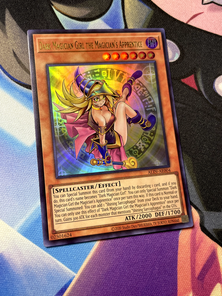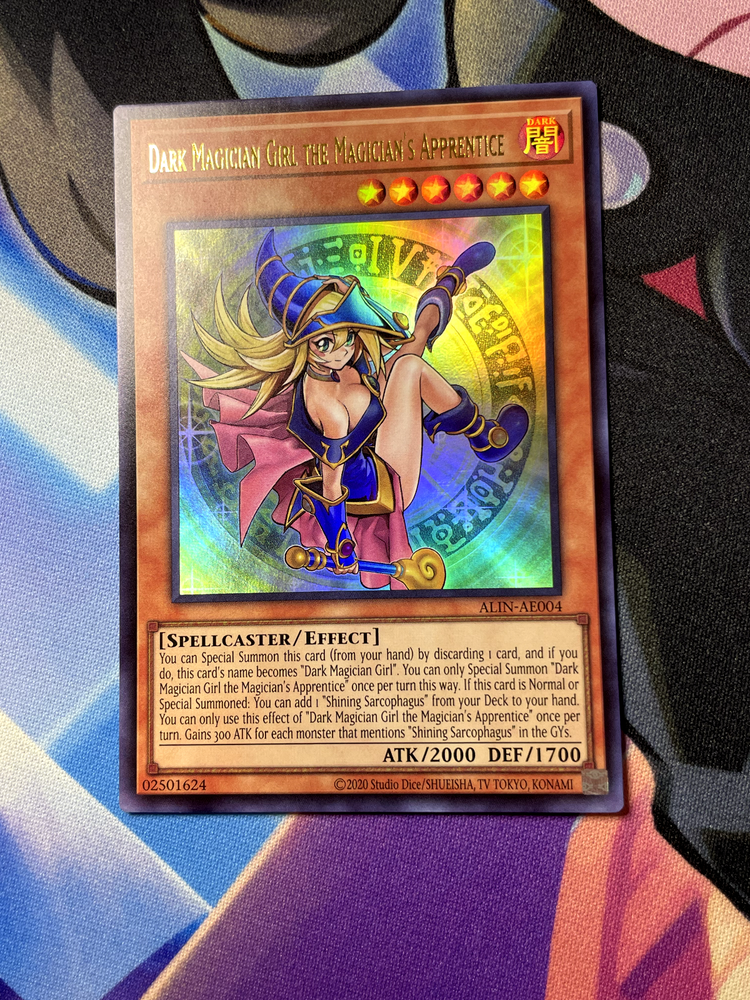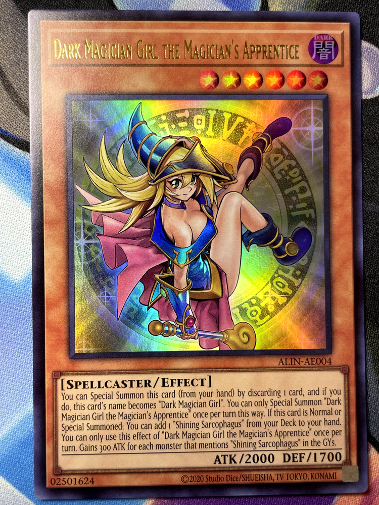 YUGIOH Dark Magician Girl The Magician's Apprentice ALIN-AE004 ULTRA RARE Near Mint Asian-English - UNCENSORED ART In the censored artwork of "Dark Magician Girl The Magician's Apprentice", cleavage has been removed. (Asian-English cards are printed in English specifically for the OCG, hence the Japanese card back.) If you have any questions, please feel free to ask!