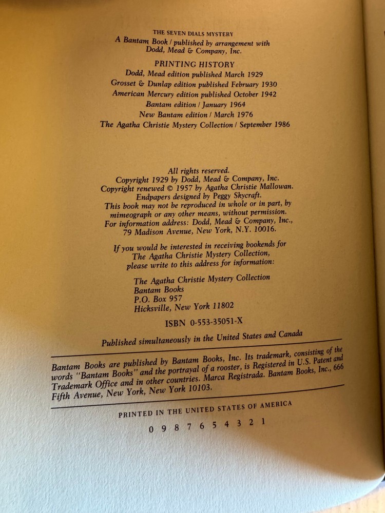 A nice vintage hardcover copy of The Seven Dials Mystery by Agatha Christie in The Agatha Christie Mystery Collection (Bantam, 1986, 1st Printing). Leatherette covers. This is stated First Printing on the copyright page. Condition Notes: “Very Good” condition: Looks and feels unread, all pages are crisp and unmarked with no writing/highlighting/underlining, clean page blocks, spine and page block still feel very tight, minimal edge/corner wear, glossy boards, very close to Like New - All books ship from a nonsmoking home - The books you see are the books you will receive Shipping - Shipping will be via USPS Media Mail. I usually ship with books wrapped in bubble wrap inside padded envelopes or small boxes. - I am happy to combine shipments. Please contact me for a shipping quote if you are interested in multiple items. If you win more than one auction, please wait for a new invoice with a shipping adjustment before paying.