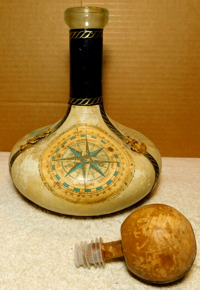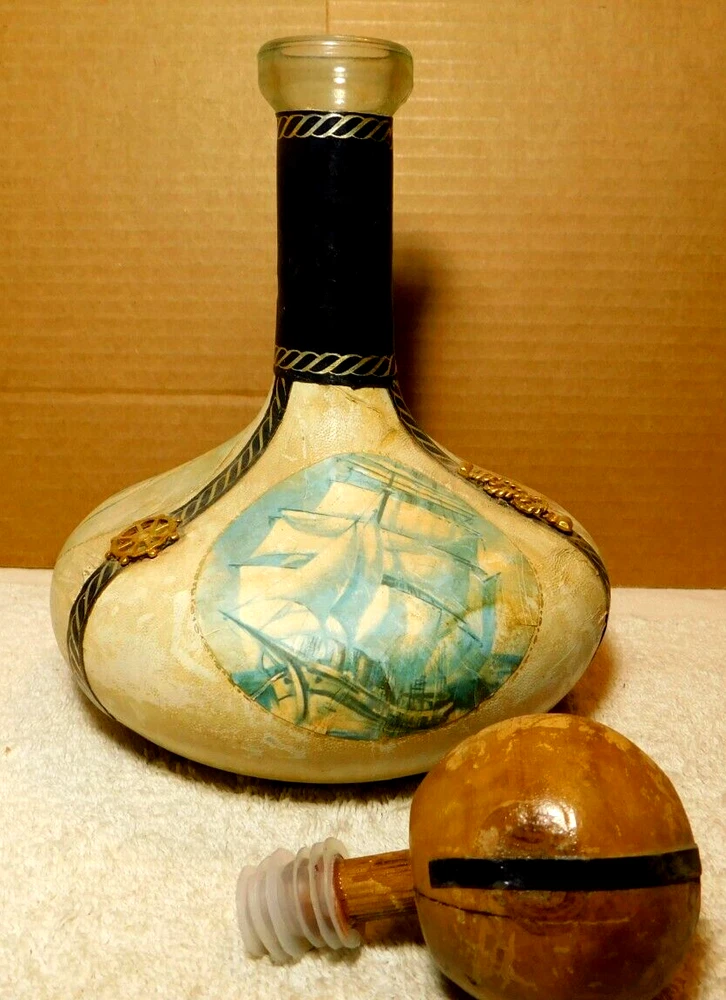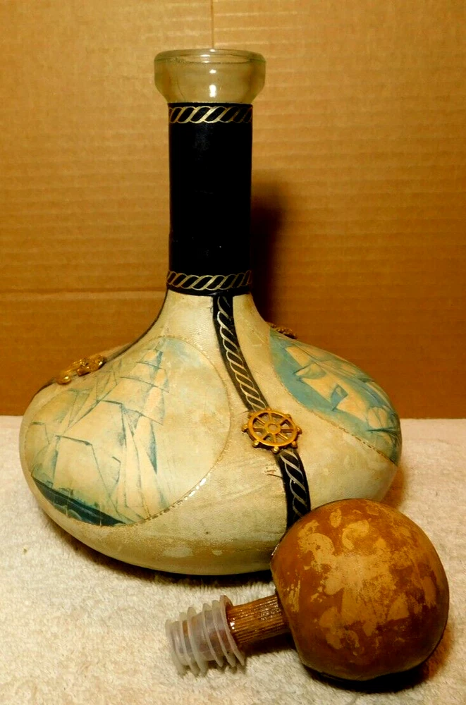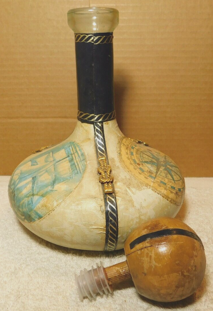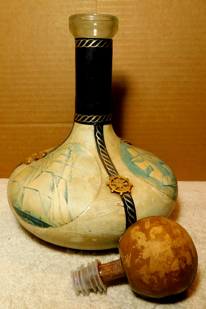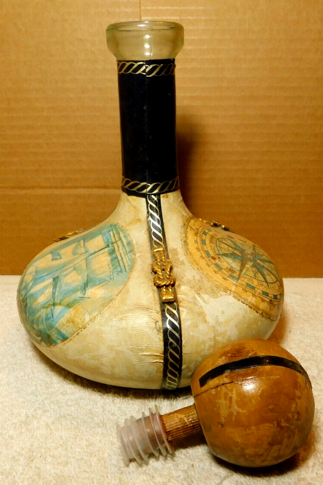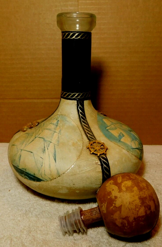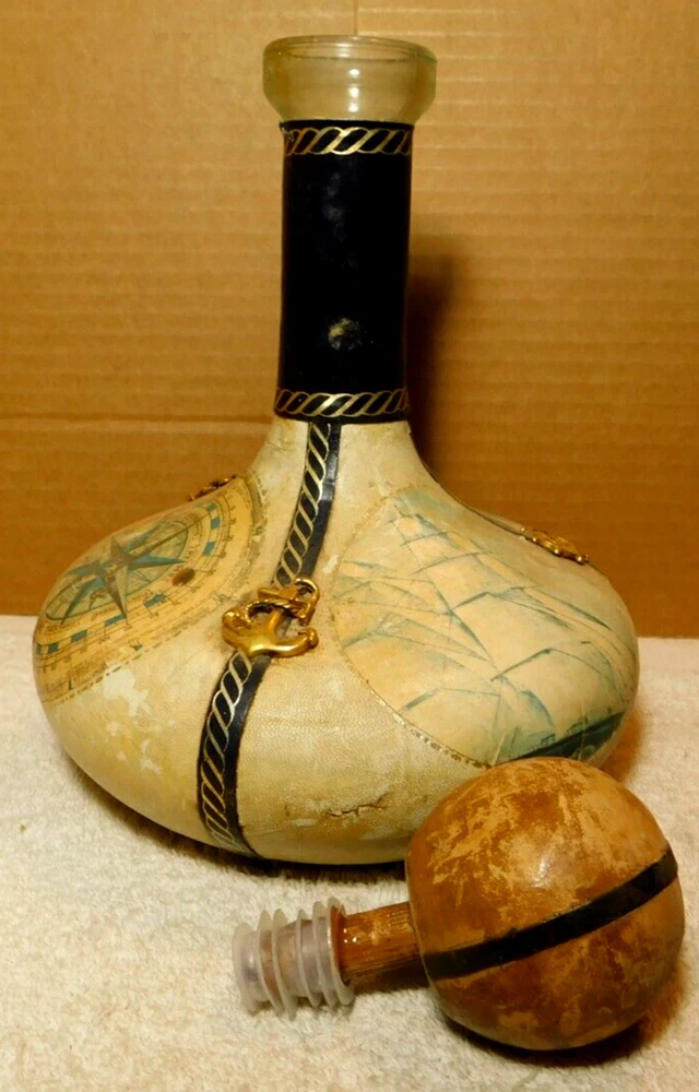What was the purpose of a decanter? A decanter is a vessel that is used to hold the decantation of a liquid (such as wine) which may contain sediment. Decanters, which have a varied shape and design, have been traditionally made from glass or crystal. What is the history of glass decanter? The history of decanter sets dates back to ancient civilizations such as the Egyptians and Romans who used them for storing and serving wine. They were primarily made from clay, metal, or glass and were used to decant wine from sediment and aerate it for better taste. Do wine decanters have a stopper? Some standard decanters include a stopper or other closure device, which shouldn't be used while the wine is decanting, as it will prevent oxygen from contacting the wine. The stopper can be useful, though, once the wine is fully decanted to prevent over-decanting, which can diminish flavors. Vintage Italian Leather (Over Glass) Nautical Theme Decanter: This tan and blue nautical-themed vintage Italian leather (over glass) decanter is absolutely fabulous and will be a great conversation starter at your bar! It would also make an amazing gift for the sailor in your life. Wrapped in worn leather, this decanter has three (3) panels: one of a map, one of a ship’s sail, and one of a ship. The navy blue panel dividers have different brass elements (an anchor, a rope, and a helm (aka a ship’s steering wheel) which add even more interest to this bar-ware. The decanter also has a navy leather neck and a round wooden stopper. The wooden stopper can be pushed further in as desired but will require gentle “rocking” back and forth when removing it. You could swap out the wooden stopper for a crystal one as well (not included).