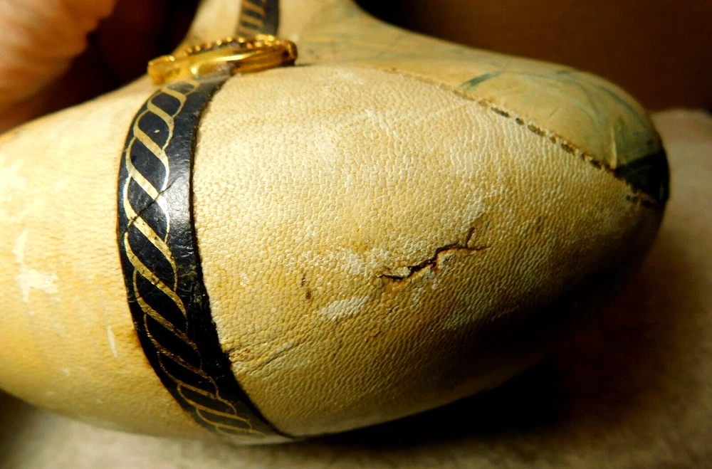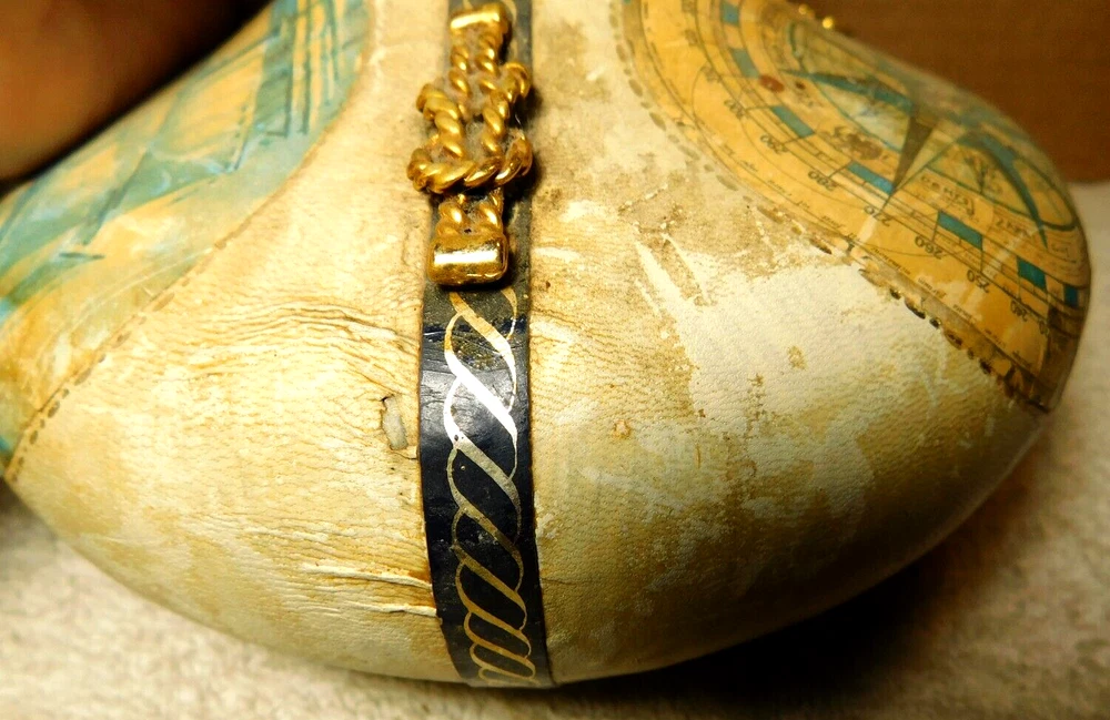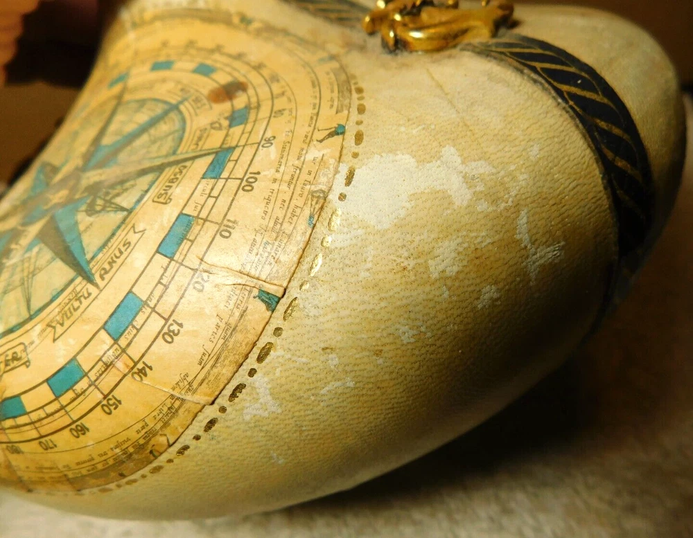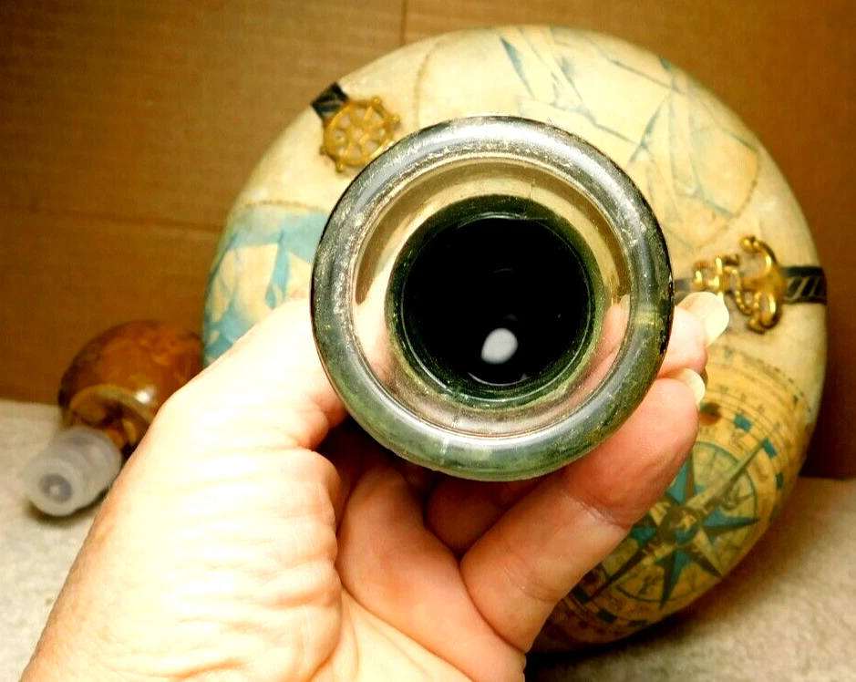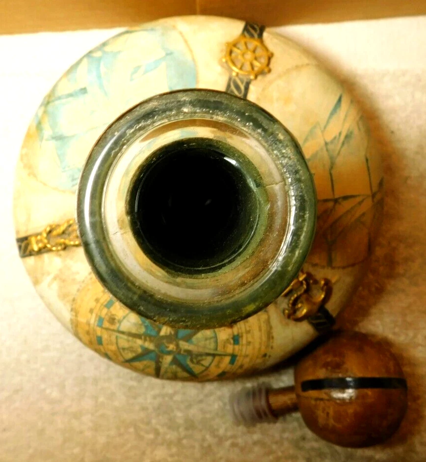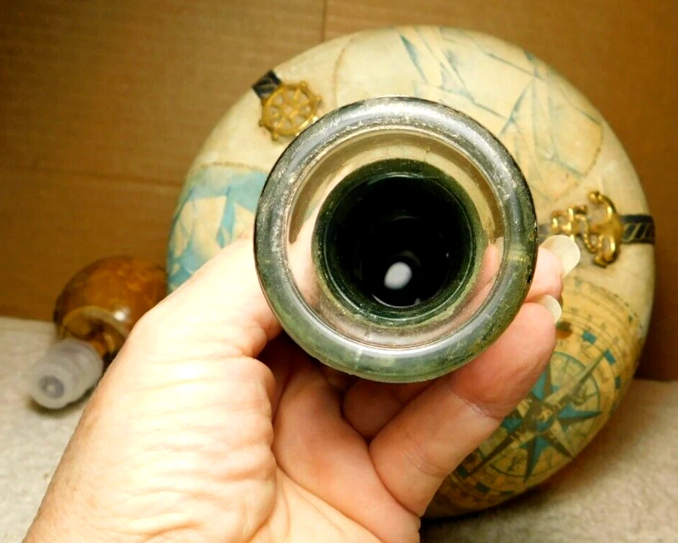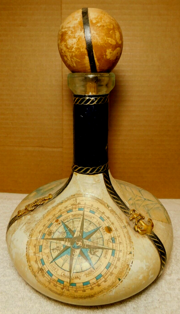 What was the purpose of a decanter? A decanter is a vessel that is used to hold the decantation of a liquid (such as wine) which may contain sediment. Decanters, which have a varied shape and design, have been traditionally made from glass or crystal. What is the history of glass decanter? The history of decanter sets dates back to ancient civilizations such as the Egyptians and Romans who used them for storing and serving wine. They were primarily made from clay, metal, or glass and were used to decant wine from sediment and aerate it for better taste. Do wine decanters have a stopper? Some standard decanters include a stopper or other closure device, which shouldn't be used while the wine is decanting, as it will prevent oxygen from contacting the wine. The stopper can be useful, though, once the wine is fully decanted to prevent over-decanting, which can diminish flavors. Vintage Italian Leather (Over Glass) Nautical Theme Decanter: This tan and blue nautical-themed vintage Italian leather (over glass) decanter is absolutely fabulous and will be a great conversation starter at your bar! It would also make an amazing gift for the sailor in your life. Wrapped in worn leather, this decanter has three (3) panels: one of a map, one of a ship’s sail, and one of a ship. The navy blue panel dividers have different brass elements (an anchor, a rope, and a helm (aka a ship’s steering wheel) which add even more interest to this bar-ware. The decanter also has a navy leather neck and a round wooden stopper. The wooden stopper can be pushed further in as desired but will require gentle “rocking” back and forth when removing it. You could swap out the wooden stopper for a crystal one as well (not included).