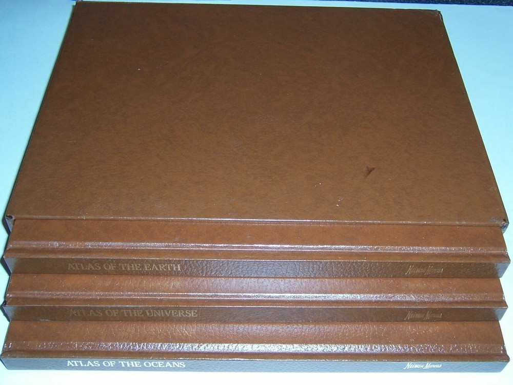 Books from Rand McNally and Company Bound in simulation leather. each measuring 11 1/4" x 15" Housed in a sturdy slipcase commissioned by Neiman Marcus. TITLE THE ATLAS COLLECTION in 3 vols AUTHOR Rand McNally and Company MORE DETAILS special edition from Neiman Marcus: 1. Concise Atlas of the Earth 2. The Atlas of Oceans 3. Concise Atlas of the Universe DESCRIPTION very good, BUT with a light bump to the slipcase on one corner, unread, clean inside, tight hardcover binding SHIPPING Books will be packed safely, and shipped via USPS Media Mail with tracking number.