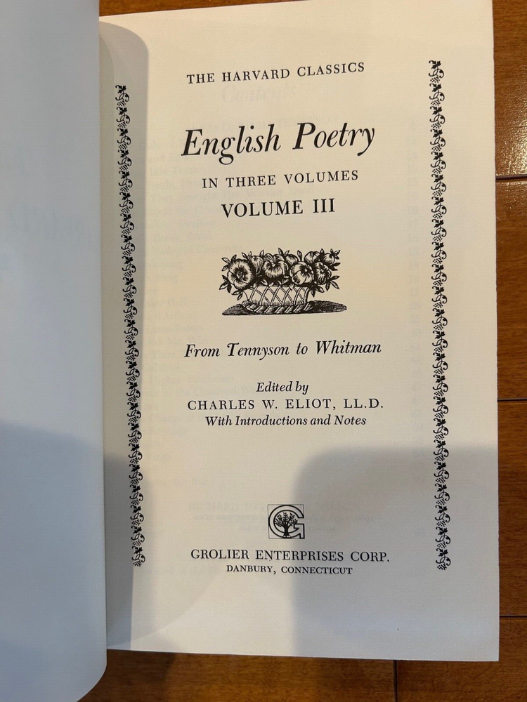 RARE leatherette-bound edition of English Poetry Volume 3, Tennyson to Whitman as part of The Harvard Classics Collection. This volume includes poetry from: • Alfred, Lord Tennyson • Richard Monckton Milnes, Lord Houghton • William Makepeace Thackeray • Charles Kingsley • J. Wilson • Robert Browning • Emily Bronte • Robert Stephen Hawker • Coventry Patmore • William (Johnson) Cory • Sydney Dobell • William Allingham • George MacDonald • Edward, Earl of Lytton • Arthur Hugh Clough • Matthew Arnold • George Meredith • Alexander Smith • Charles Dickens • Thomas Edward Brown • James Thomson (B.V.) • Dante Gabriel Rossetti • Christina Georgina Rossetti • William Morris • John Boyle O'Reilly • Arthur William Edgar O'Shaughnessy • Robert Williams Buchanan • Algernon Charles Swinburne • William Ernest Henley • Robert Louis Stevenson • William Cullen Bryant • Edgar Allen Poe • Ralph Waldo Emerson • Henry Wadsworth Longfellow • John Greenleaf Whittier • Oliver Wendell Holmes • James Russell Lowell • Sidney Lanier • Bret Harte • Walt Whitman Cover: Red leatherette Edges: Gilded Bookmark: Bound red satin ribbon Copyright: 1980 The Harvard Classics is published by Grolier Enterprises with text printed on 55-pound Lockhaven paper specifically prepared for this edition by the Hammermill Paper Company. Printed and bound by R. R. Donnelley and Sons. Endleaf design is reproduced from an original marbled pattern created for this edition by Faith Harrison. Cover stampings and design by Daniel B. Bianchi and Selma Ordewer. NOTE: I have 100+ brand new books for sale. Please check my eBay listings for all available titles. If there are several books that you would like to purchase, just message me with the titles, and I will put together a new post for you with the books you want, and will combine shipping to save you money.