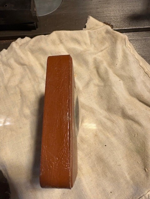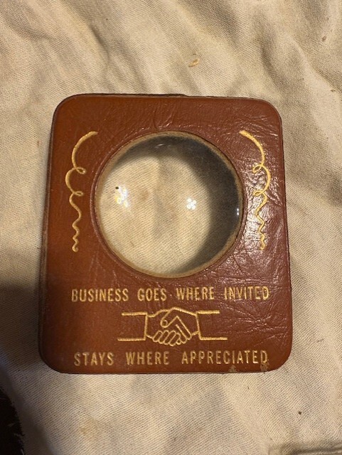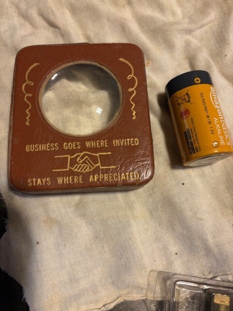 This is vintage (1930-1940) salesman sample desktop magnifying glass. Leather wrapped and in original very good as shown condition. Bet it is a one and only! good desk top conversation piece. d-cell battery next to it to show size Will be carefully packed and shipped quickly. Thanks for looking J