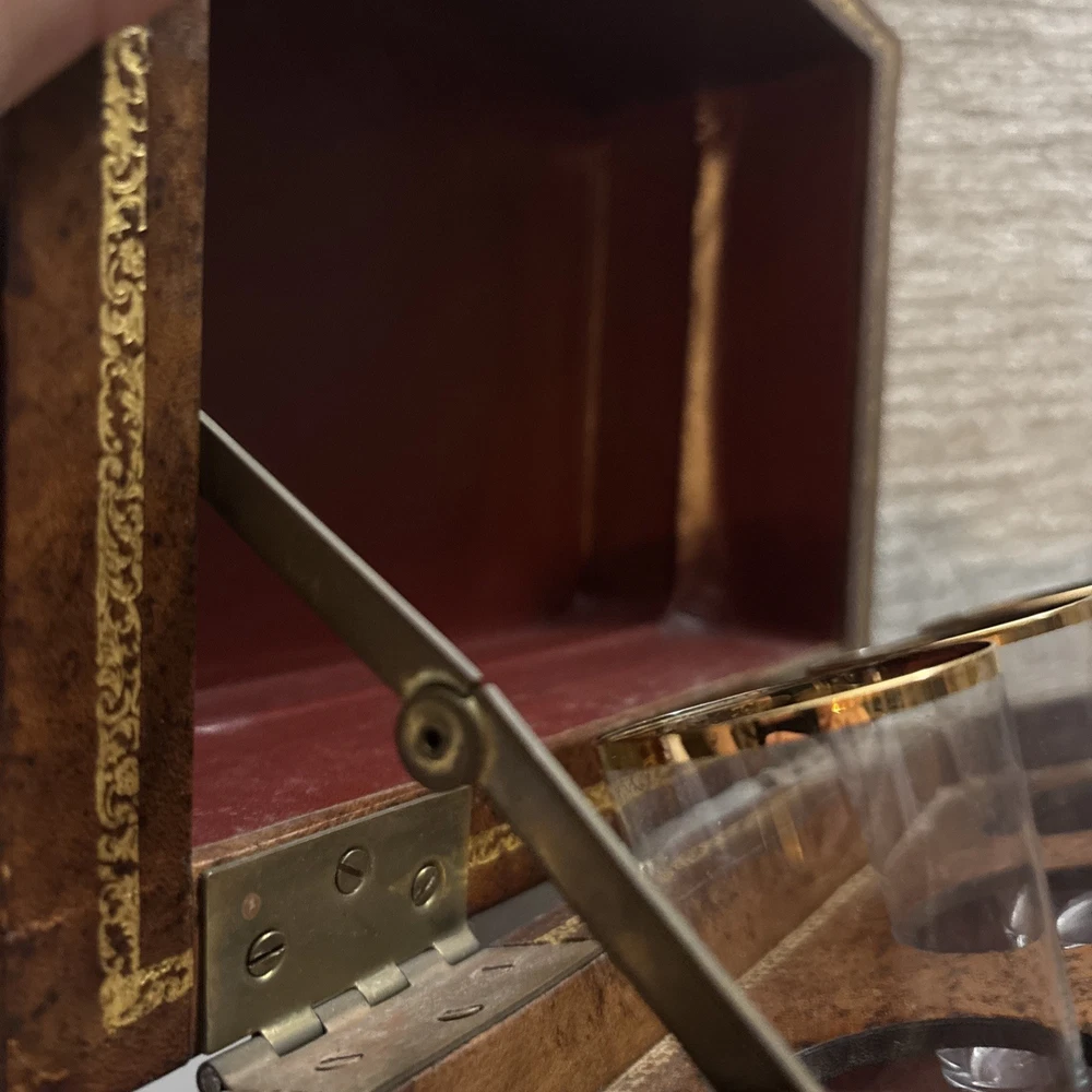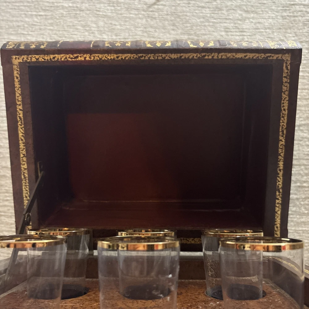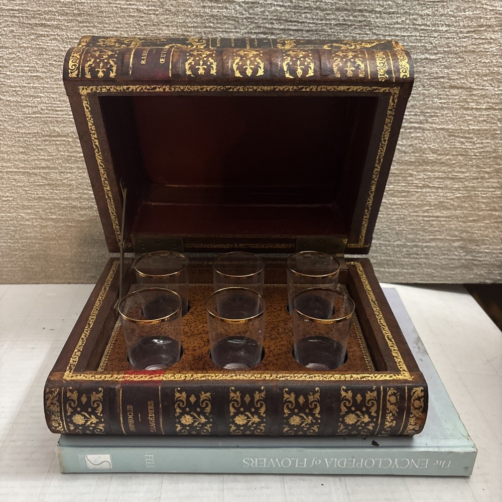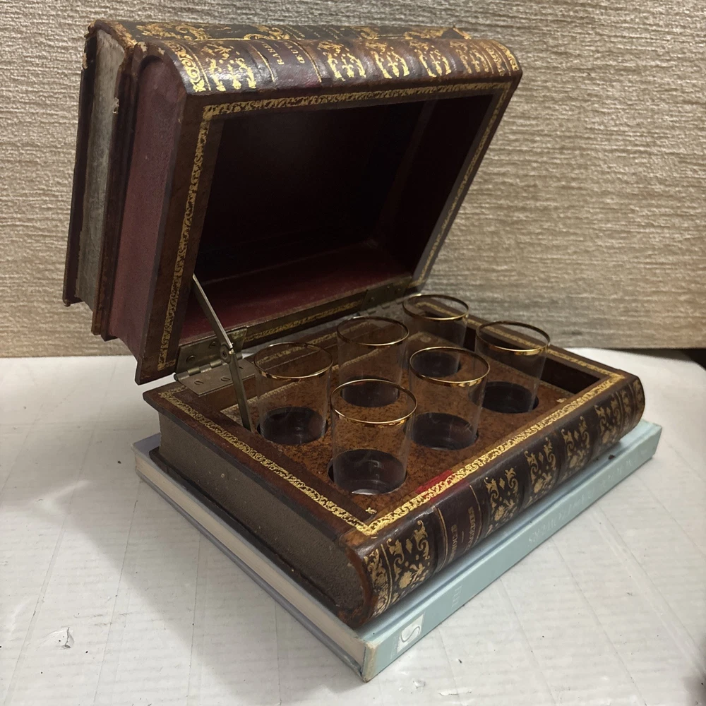 Vintage French Leather Bound Book Liquor Tantalus Box W/ 6 Cordial Shot Glasses RARE Condition: This set is pre-owned, but it's in great vintage condition with NO original sale tags. This clued onto a real book. There are no serious damages. This works. All shot glasses are included. Selling as is. Please see photos for more details. We are proud of our FAST SHIPPING. Please ENJOY! NO INTERNATIONAL RETURNS. Ship with USPS Ground Advantage Mail or FREE LOCAL PICKUP.