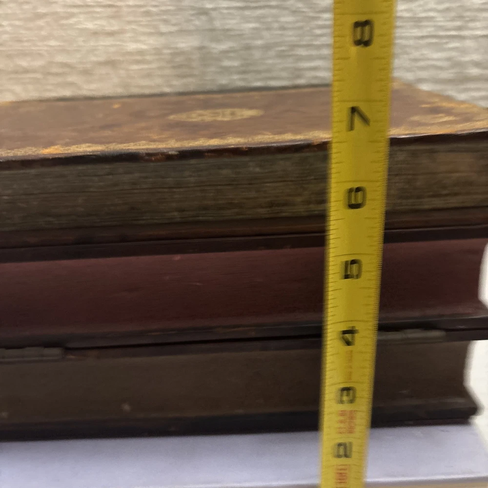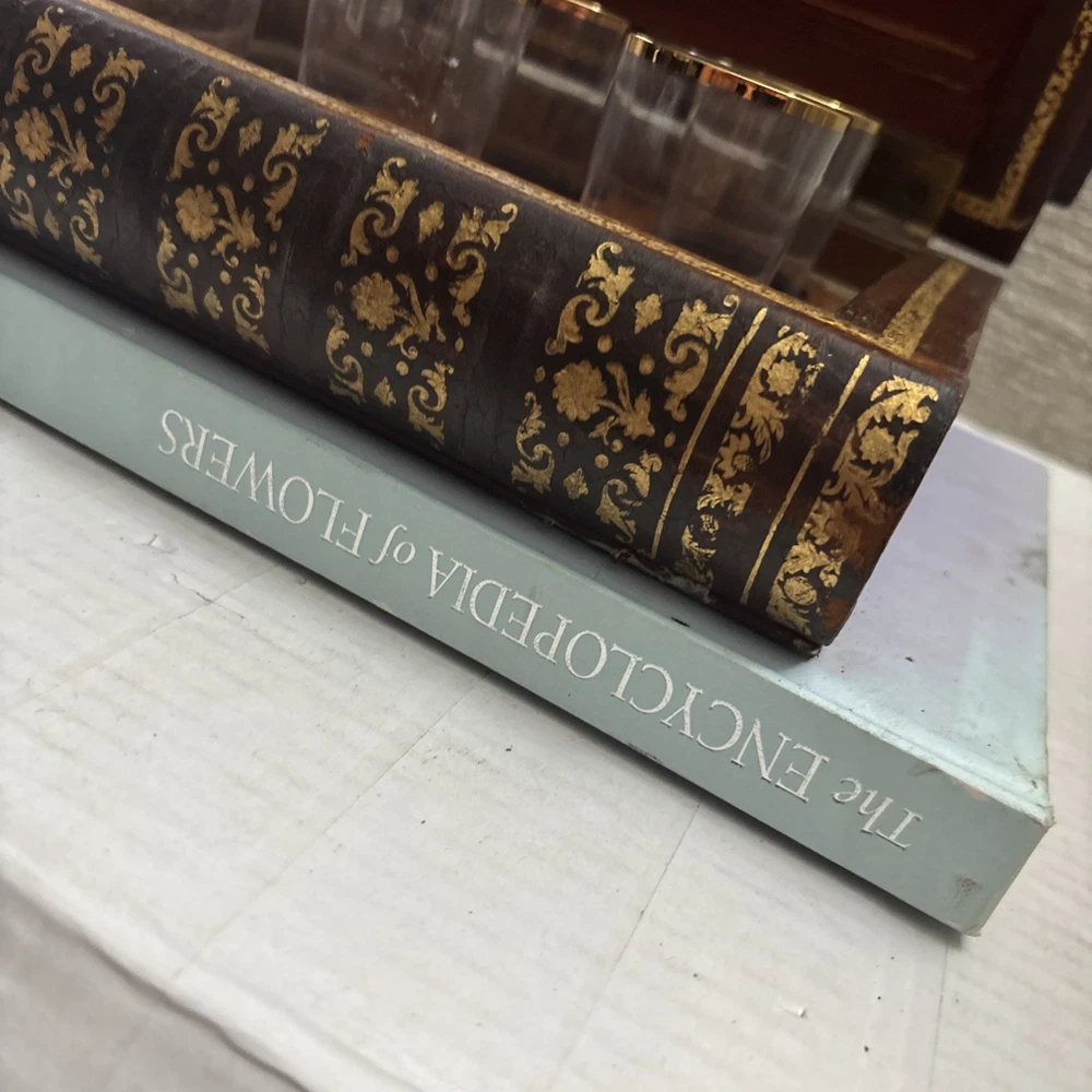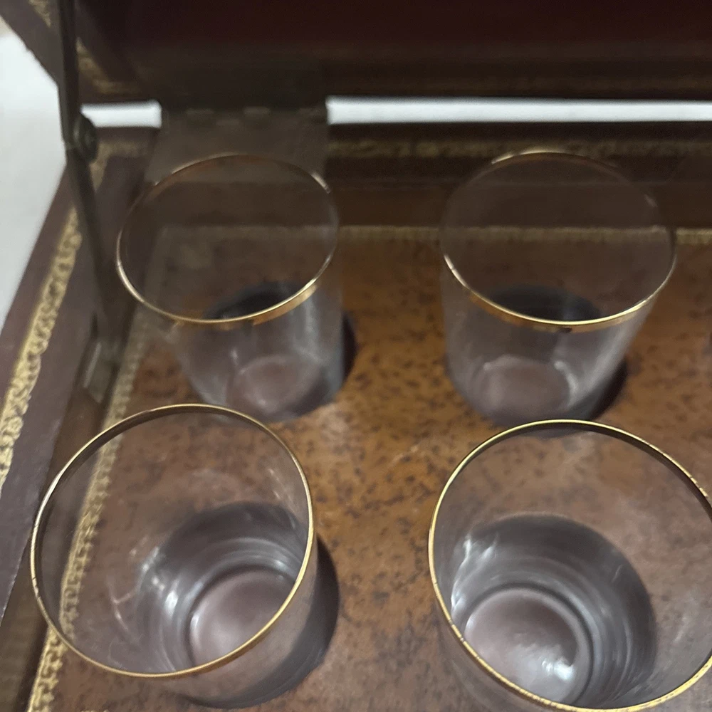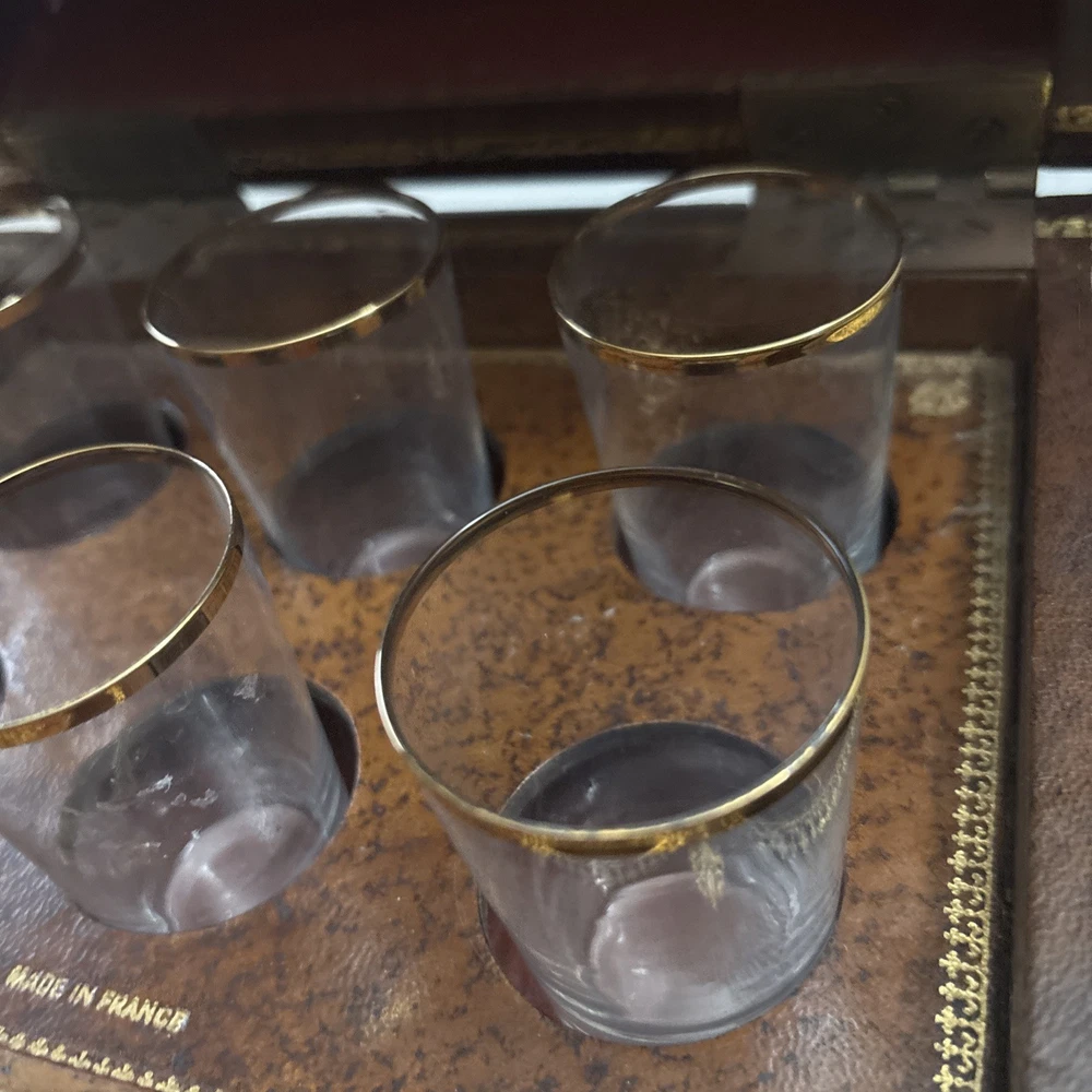 Vintage French Leather Bound Book Liquor Tantalus Box W/ 6 Cordial Shot Glasses RARE Condition: This set is pre-owned, but it's in great vintage condition with NO original sale tags. This clued onto a real book. There are no serious damages. This works. All shot glasses are included. Selling as is. Please see photos for more details. We are proud of our FAST SHIPPING. Please ENJOY! NO INTERNATIONAL RETURNS. Ship with USPS Ground Advantage Mail or FREE LOCAL PICKUP.