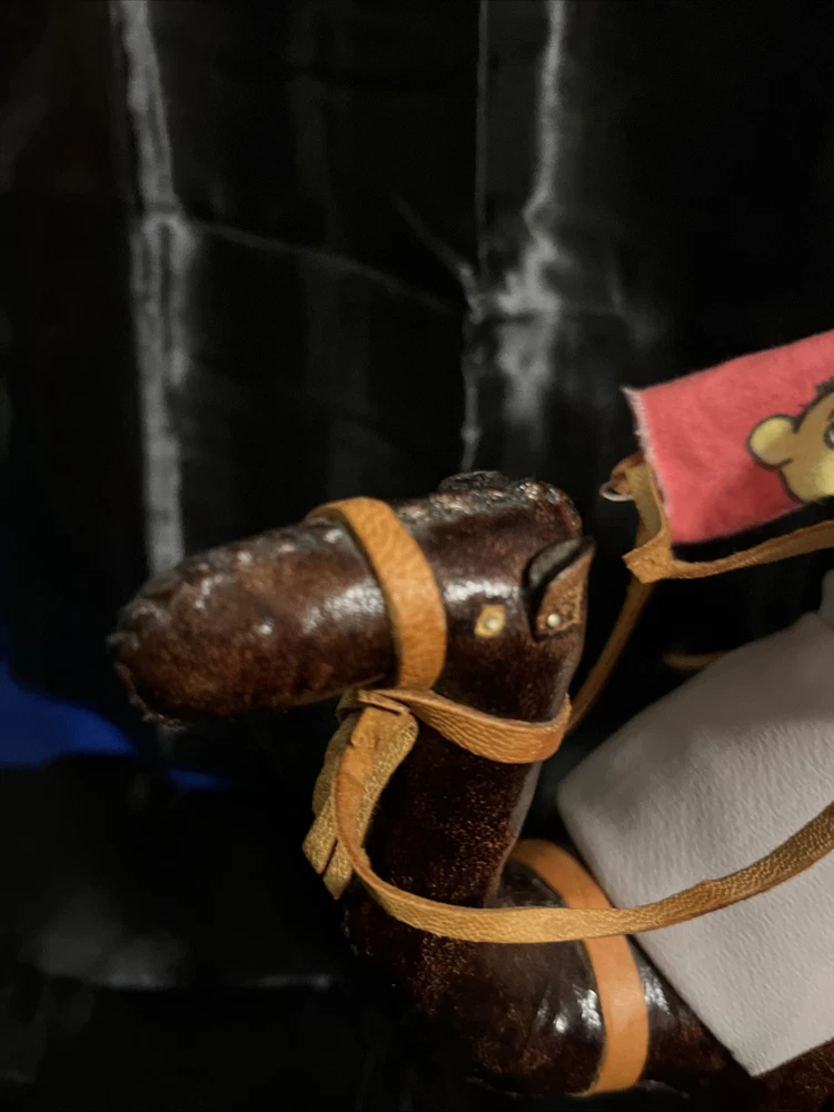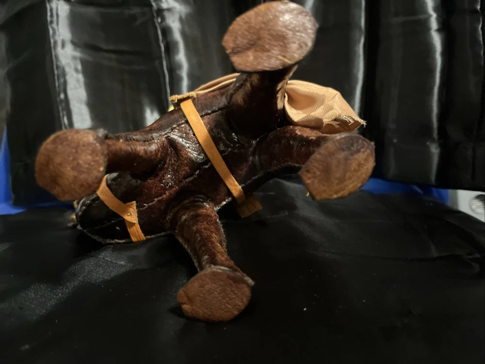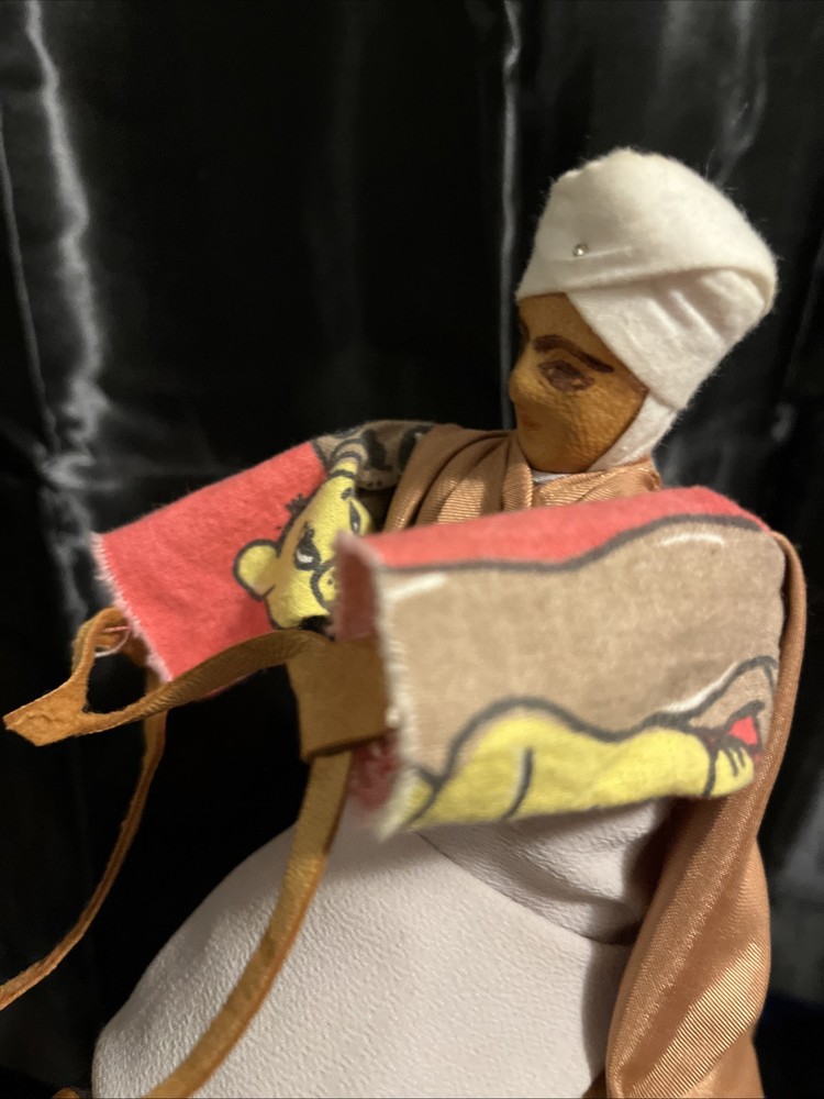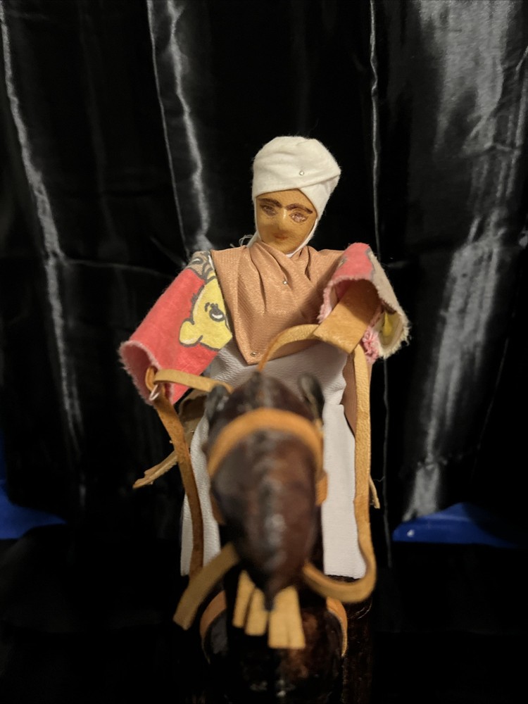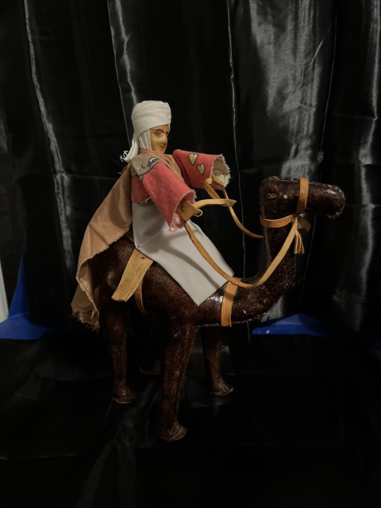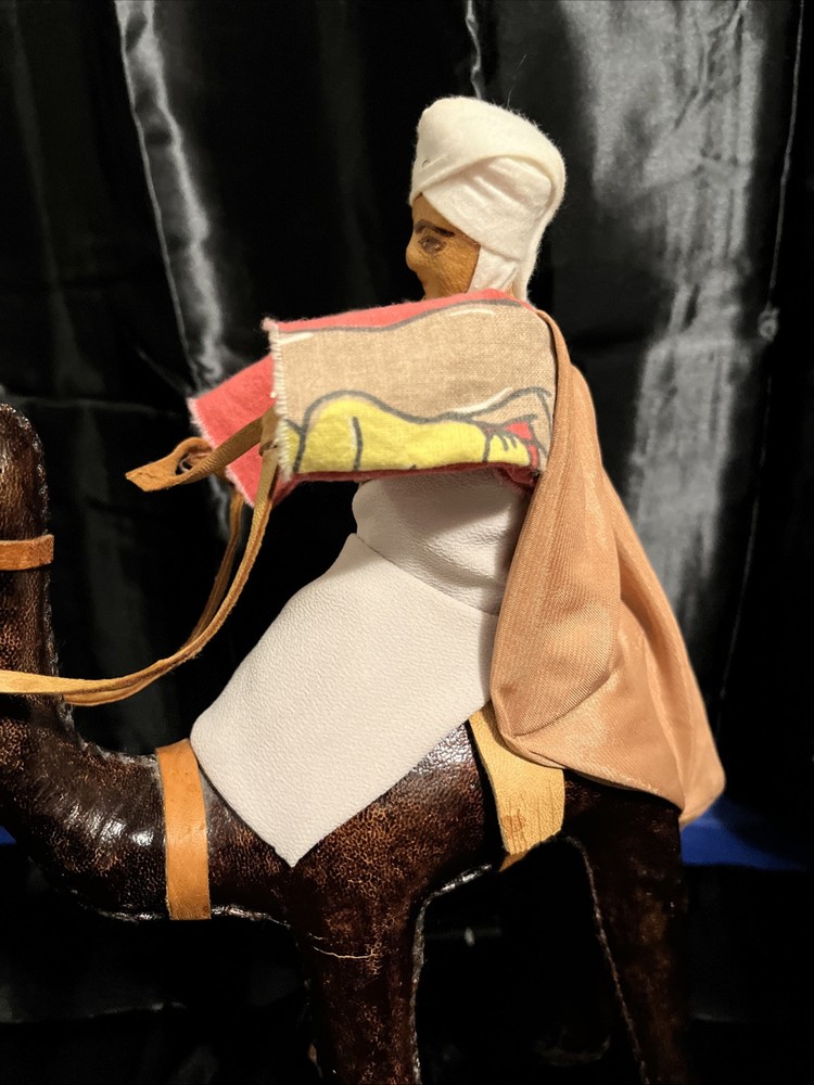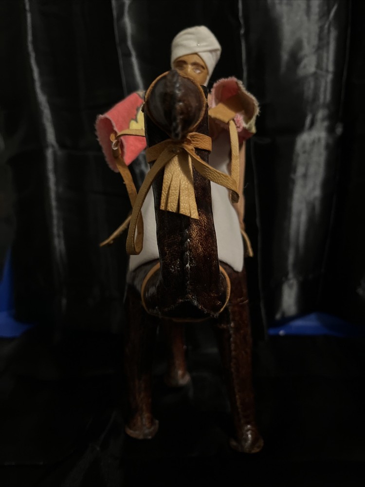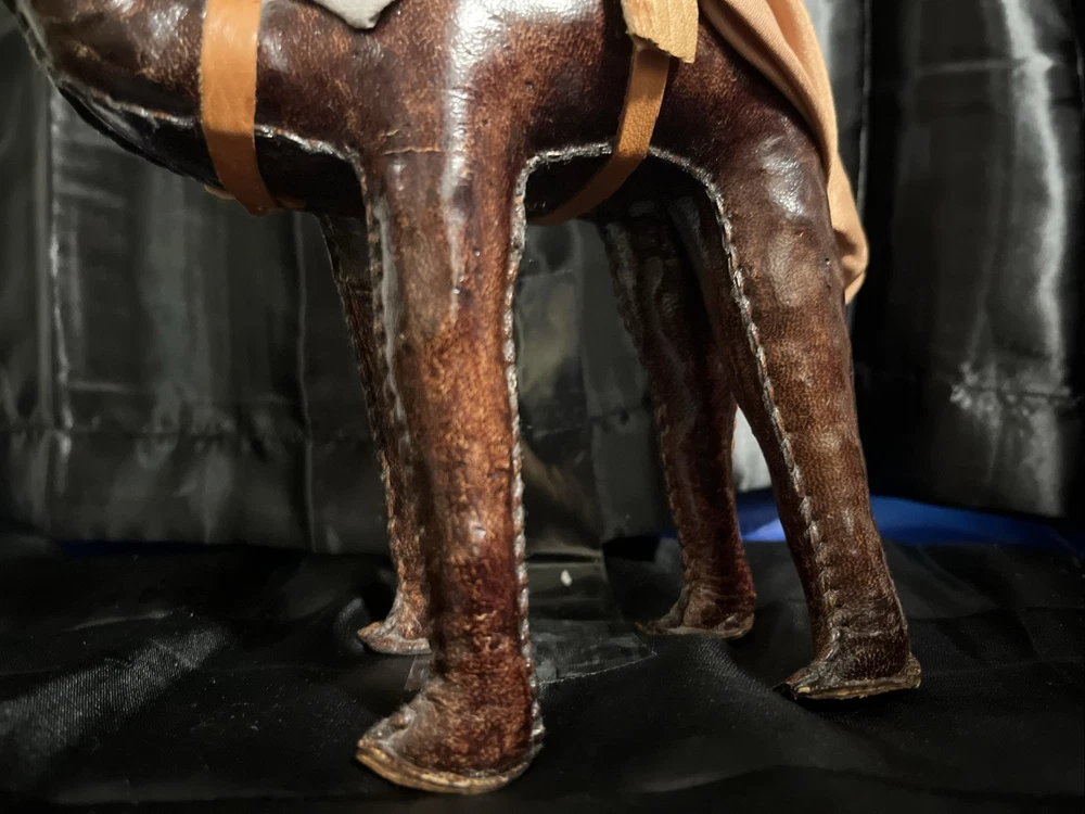 This VTG Leather Bound Wrapped Camel Figurine with Rider is a medium-sized multicolor figurine made of leather, featuring a camel with a rider handmade in India. It is part of the Animals collection, suitable for teens and adults, with an all-over pattern. This unique figurine would make a charming addition to any room, showcasing intricate craftsmanship and a touch of India's style and culture.