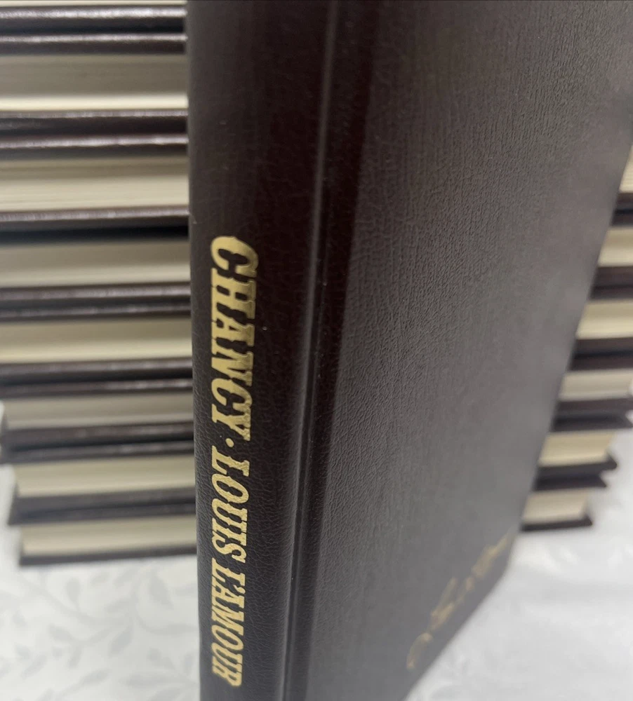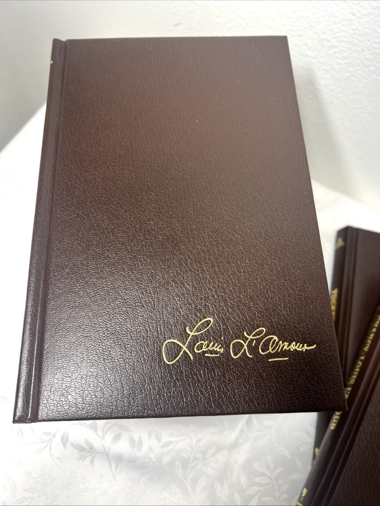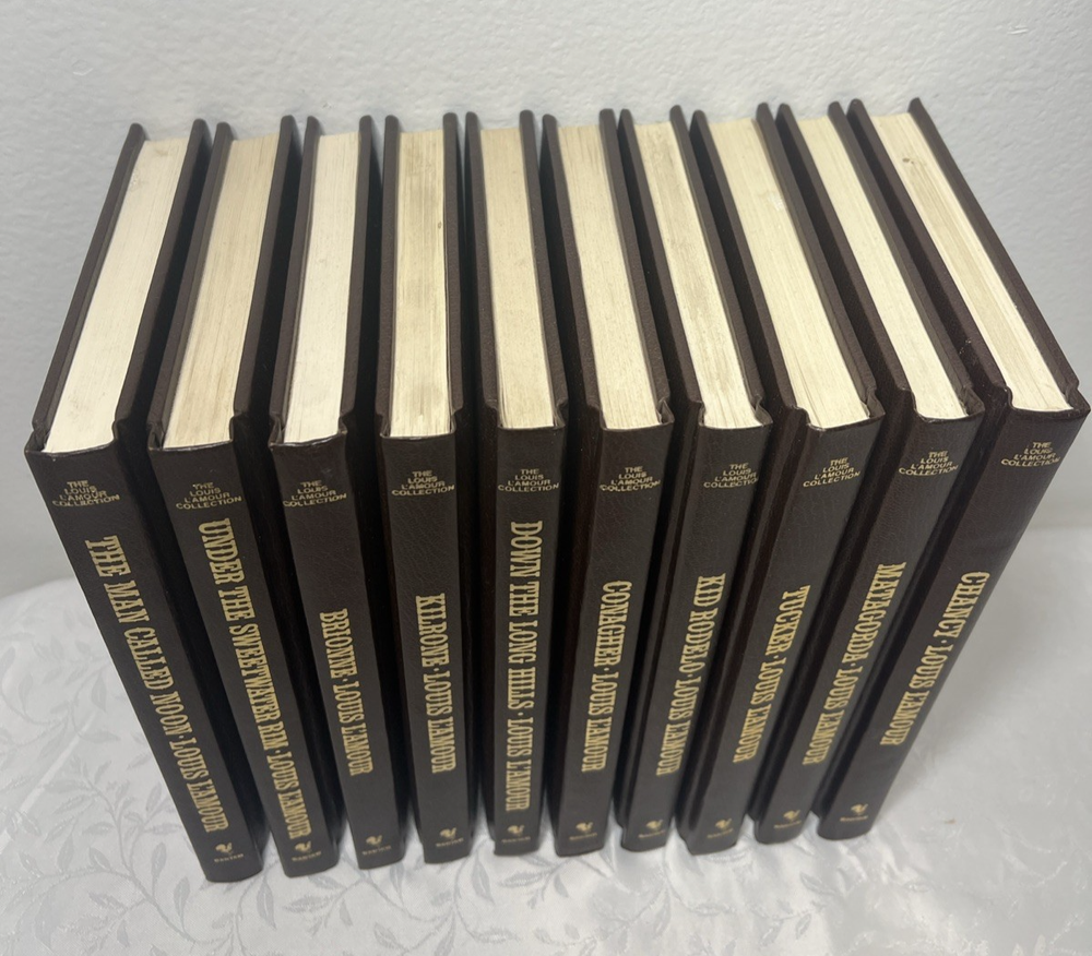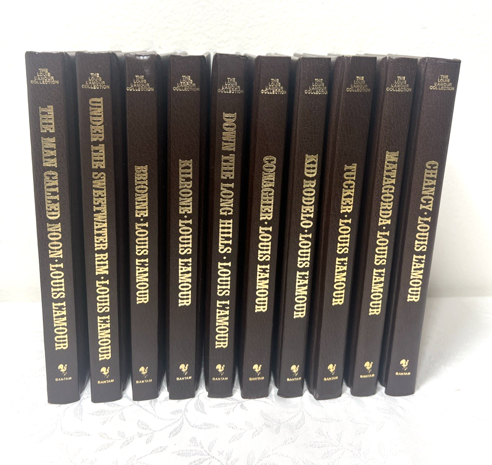 VTG Louis L'Amour Leatherette Hardcover Books Set of 10 Under the Sweetwater Rim Conagher The Man Called Noon Chancy - Has Damage on the front cover Brionne Matagorda - Has a spot on lower left front cover Kilrone Down the Long Hills Tucker Kid Rodeo Some spots on top - Please see pictures Colors may vary slightly depending on light and resolution . We ship out in 1 or 2 business days Thank you for viewing our listing. Please message with any questions you might have and check out our other listings. We offer returns within 30 days of purchase. Thanks and have a great day!