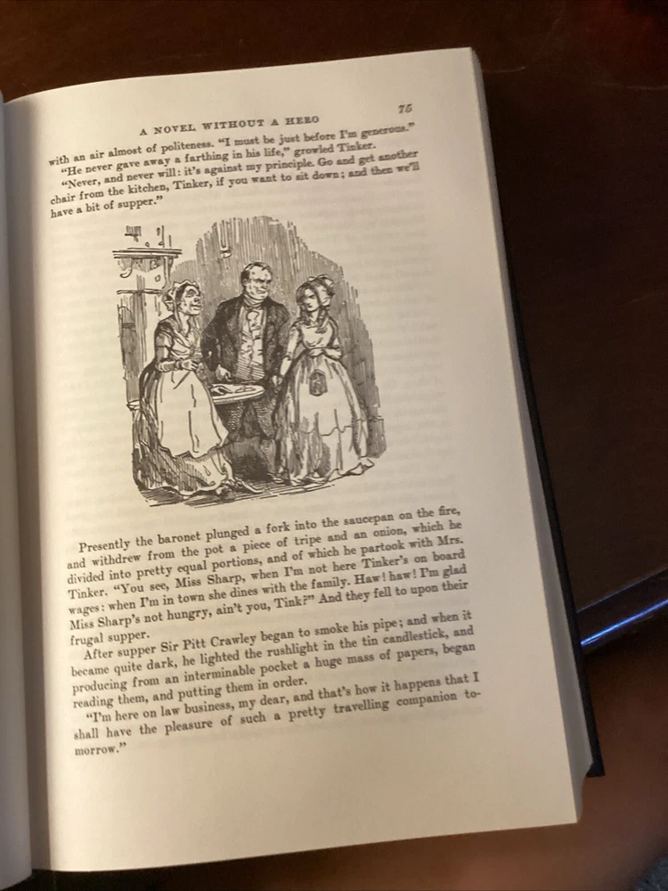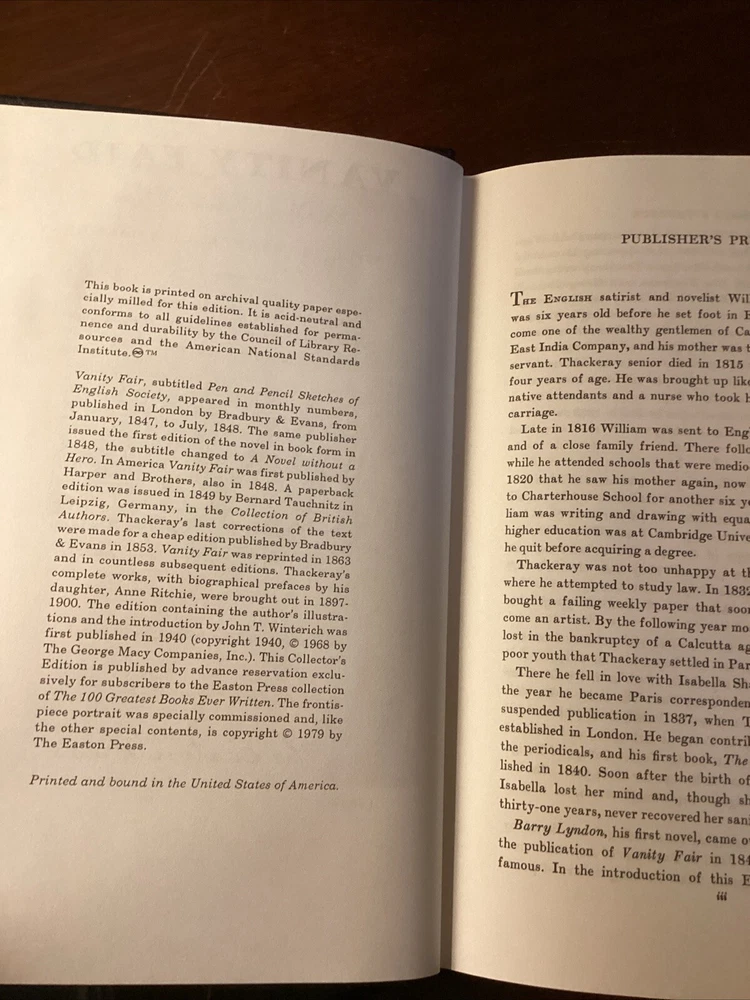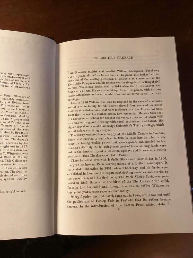This book has a beautiful leather cover embroidered design. The book is a little off center I think it was misplaced on the shelf at some point, but it still stand and looks amazing, the pages are clean and shiny with a gold lining shining from the sides. Please see pictures for more information Dive into the world of 19th-century British literature with the Vanity Fair Collector's Edition by William Makepeace Thackeray, presented in a luxurious leather-bound volume by Easton Press. This limited edition is a treasure for both bibliophiles and collectors, featuring rich illustrations that bring the intricate storytelling to life. Explore the intricacies of social climbing and romantic entanglements within the pages of this classic novel. This edition, with its gold gilt detailing and high-quality paper, ensures a reading experience as elegant as its contents. Whether for display or perusal, it is a timeless addition to any collection.