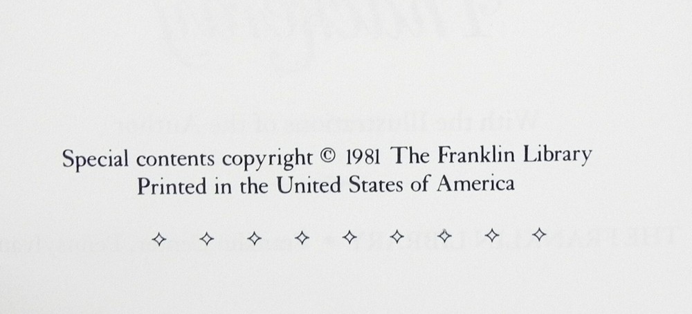 1981 Franklin Library Decorative Endpapers Leather Gilt edges on 3 sides Raised bands on spine Ribbon bookmark Please see pictures for more information and detail ***** This beautiful volume is in very good condition except the top has blemishes on the gilt.This volume has the appearance of never been opened (except for pictures) or read. There are no bookplates, writings. Please see pictures for more information and detail. Please feel free to contact me with any questions you might have. I will be glad to take additional pictures. I tried to describe the book through words and pictures the best I can but if you are not 100% satisfied with the purchase, please know you can return the book for full refund. Boxed and packaged VERY carefully --- Will ship within 1 business day of receiving payment. Thank you for looking! <meta name="viewport" content="width=device-width, initial-scale=1">