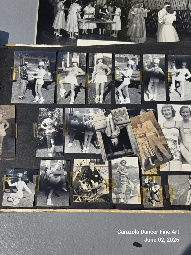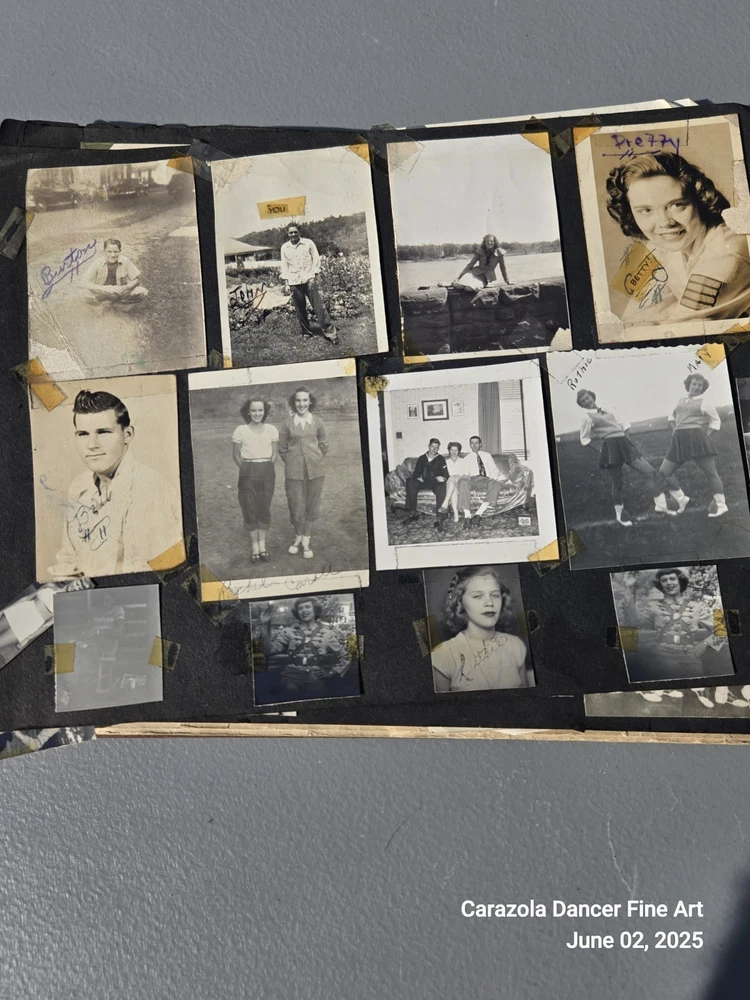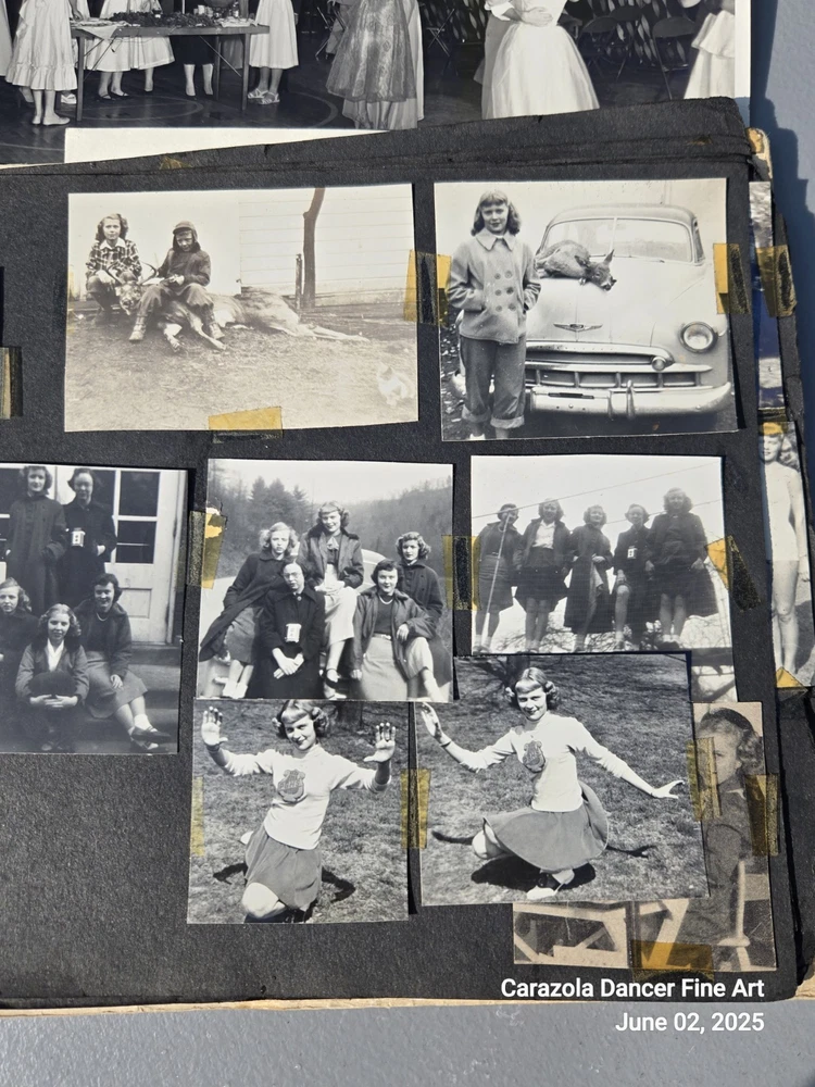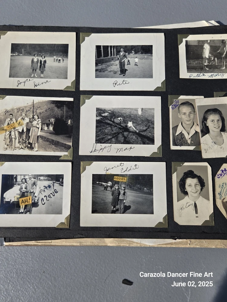 Lot 3, June 2, 2025 Good day everyone we hope all are doing fine today. As can be seen in the pictures, the photograph book is falling apart, it is about 80+ years old. The majority of the pictures are students from a US high school and family related pictures. I believe the time period is from about 1940 through the 1950s. This photograph book has seen better days and a lot of the pictures are loose leaf, not attached and will ship this way. It is a bunch of snapshots of Americana for the time period indicated. End. Thank you for stopping into our sale room today. End. Carazola Dancer